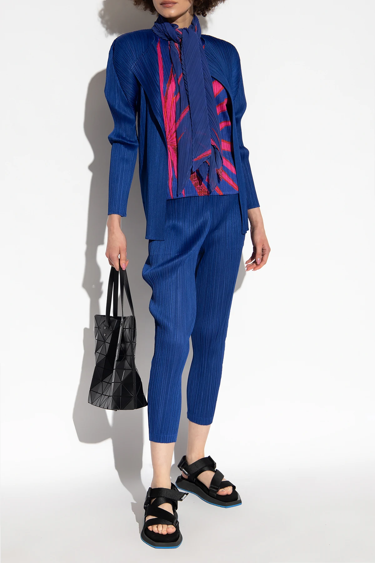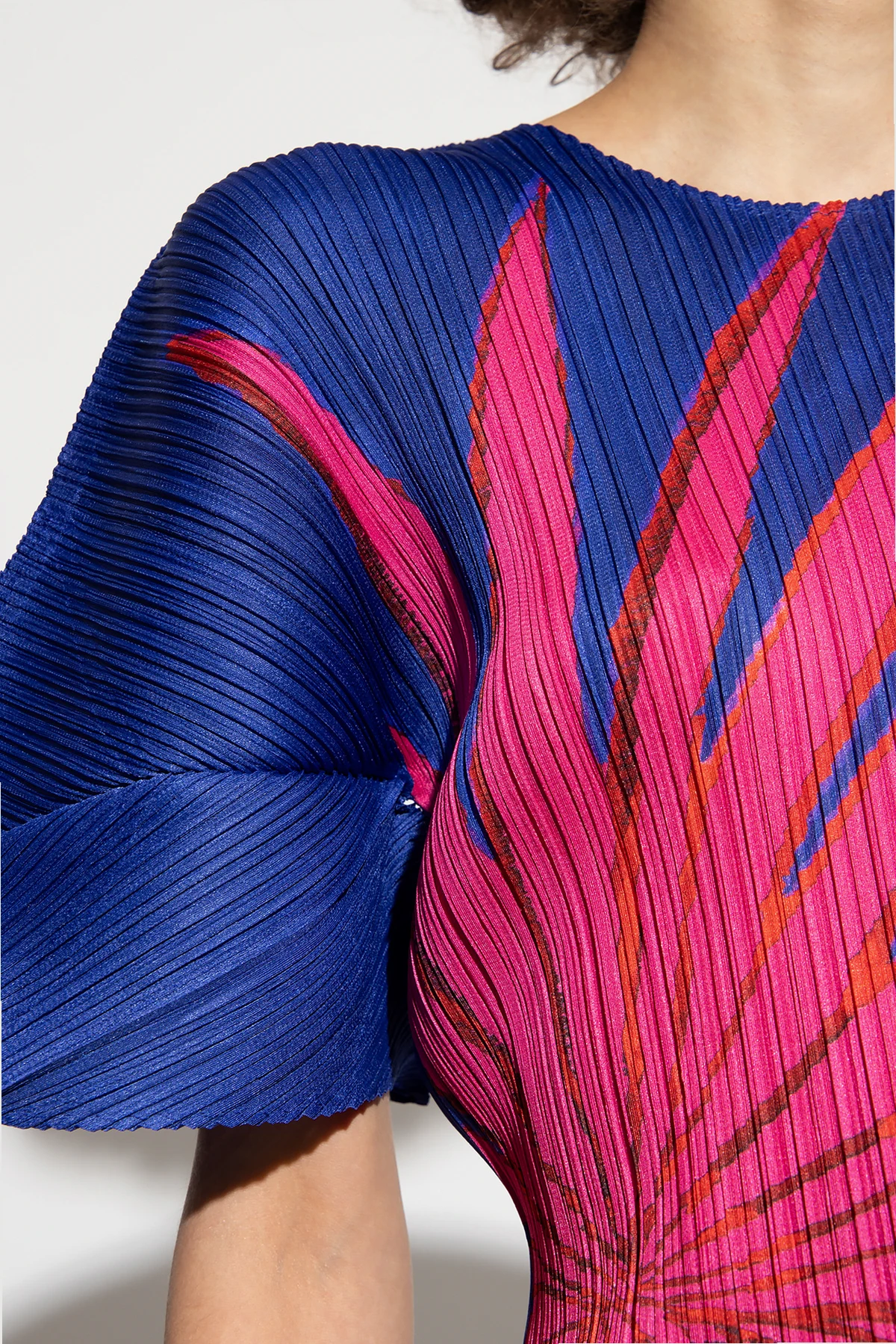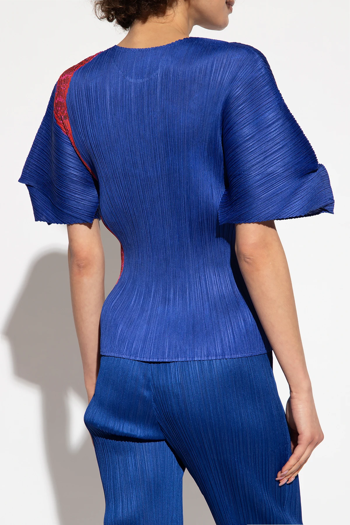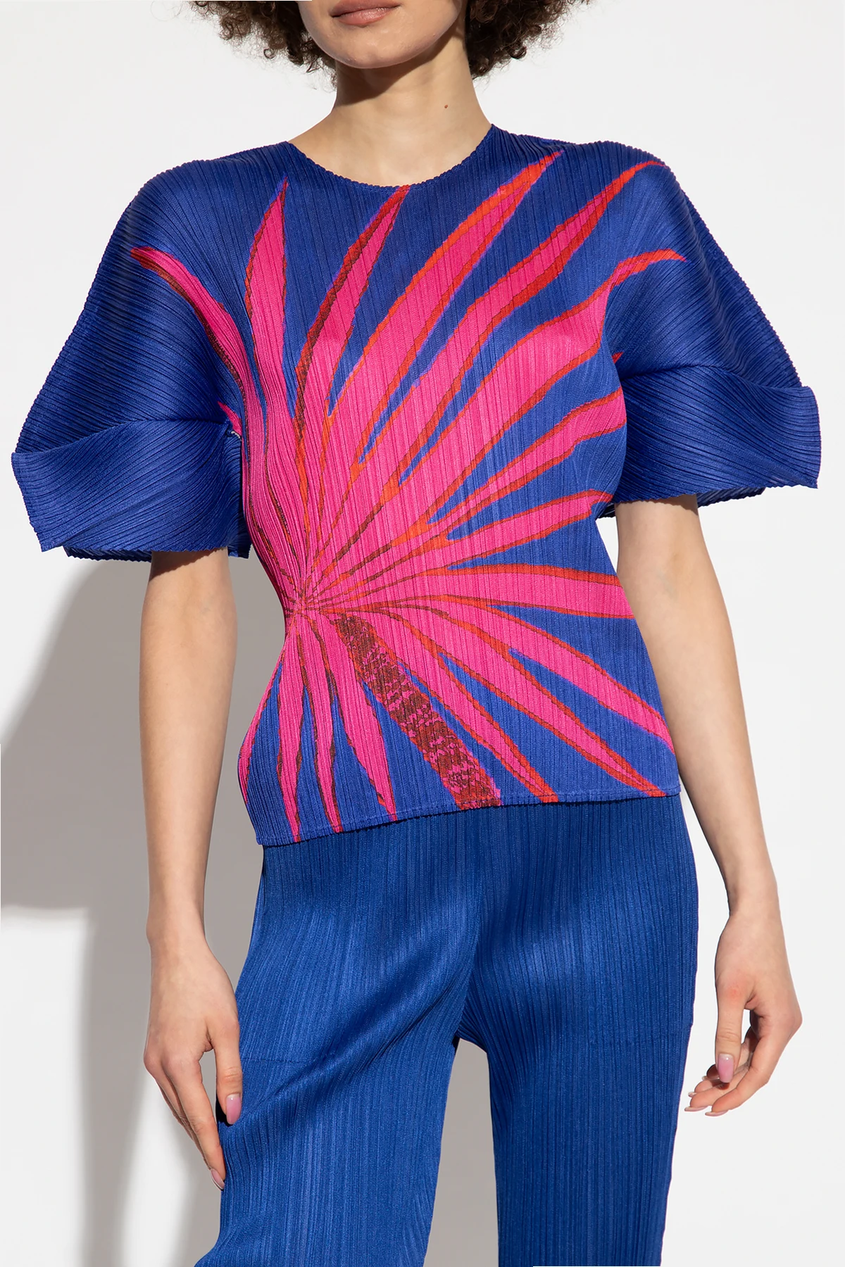 Blue, red and pink top from Issey Miyake Pleats Please. Made from recycled material with a signature pleating technique, this style features a floral pattern and decorative slashes on the sleeves.