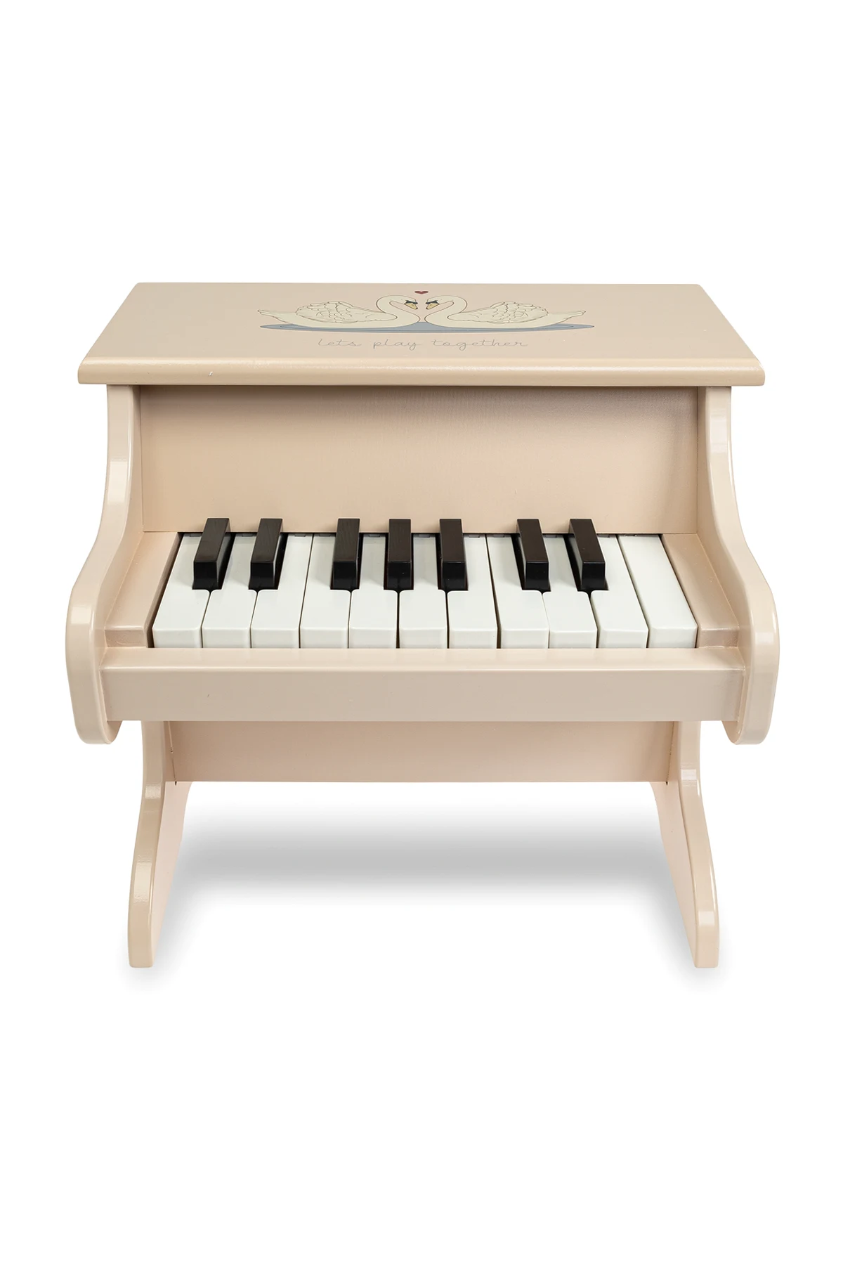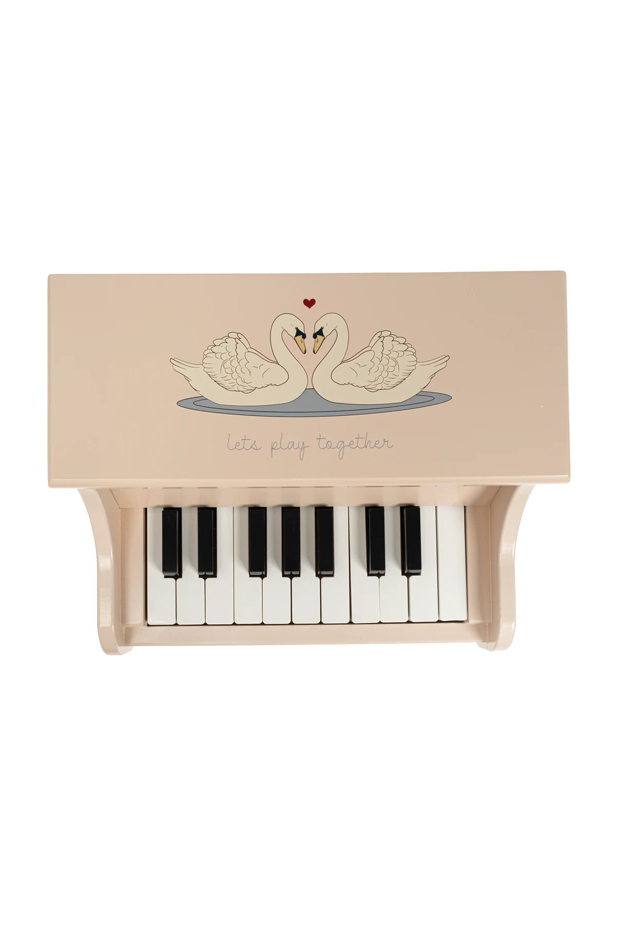 Der obere Teil des Klaviers ist mit einem dezenten Muster verziert, das zwei weiße Schwäne zeigt, mit einem Herzen darüber und der Aufschrift „let's play together“. Die Tastatur besteht aus 18 schwarzen und weißen Tasten, die in traditioneller Weise angeordnet sind, was den Jüngsten die ersten Schritte in die Welt der Musik ermöglicht.