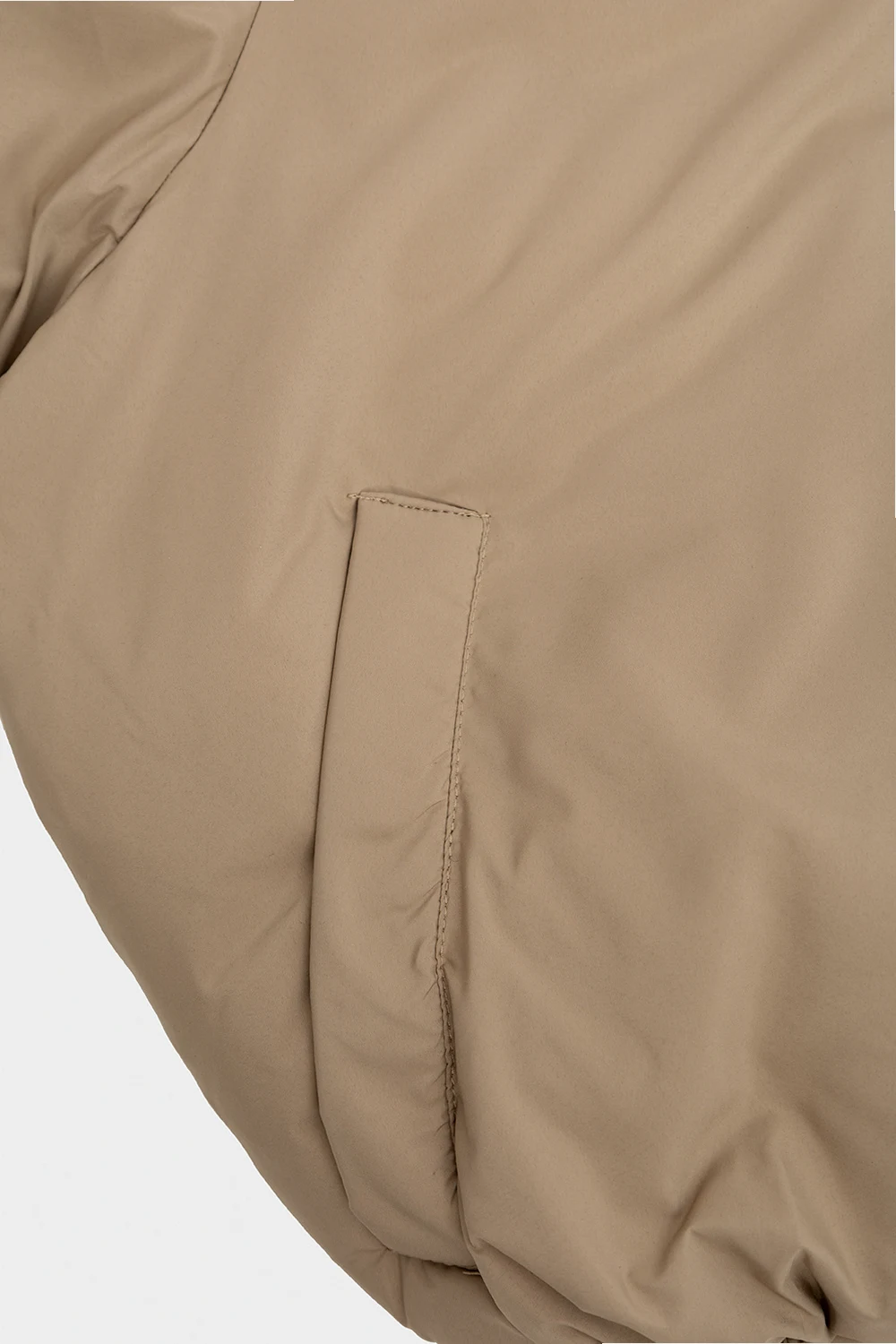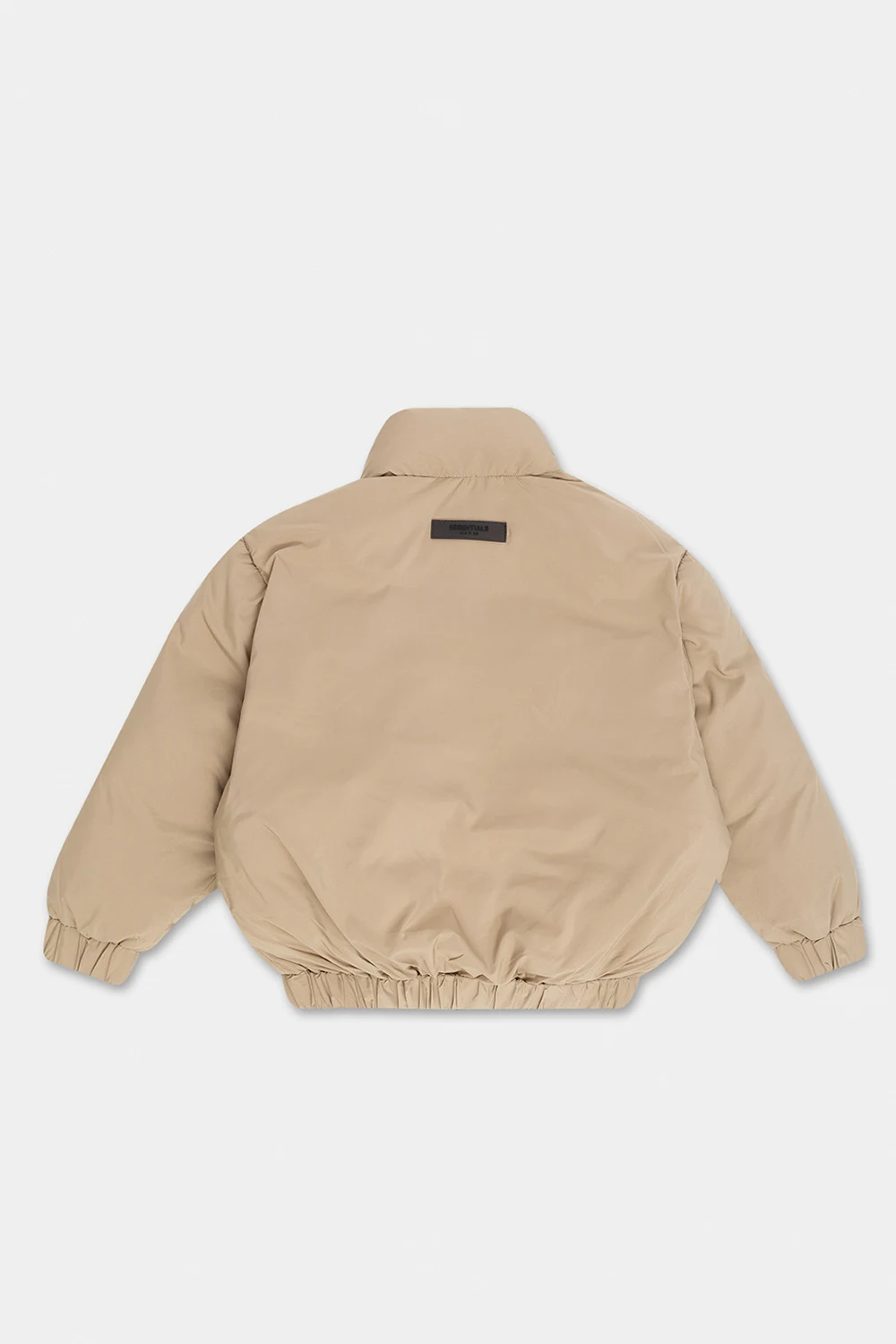 Beige insulated jacket from Fear Of God Essentials Kids. Fastened with a black two-way zip, this garment is complete with two front pockets, black rubber logo patch at the back and ribbed trims at the hem and cuffs.