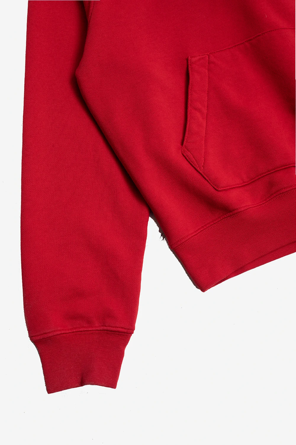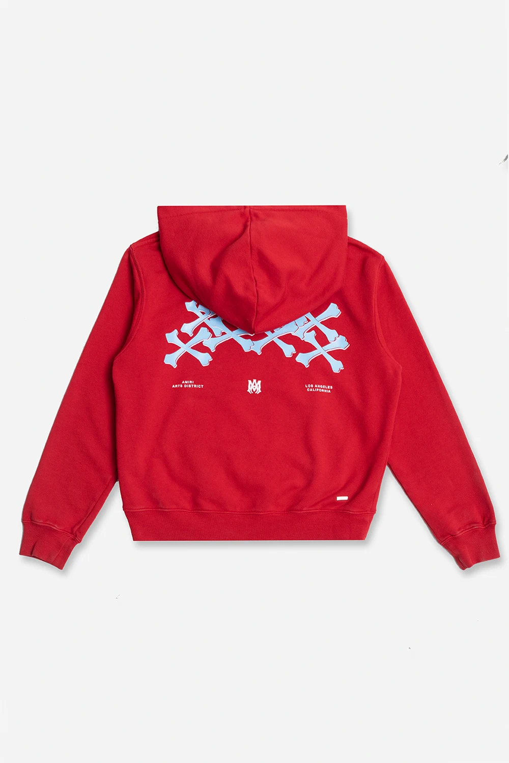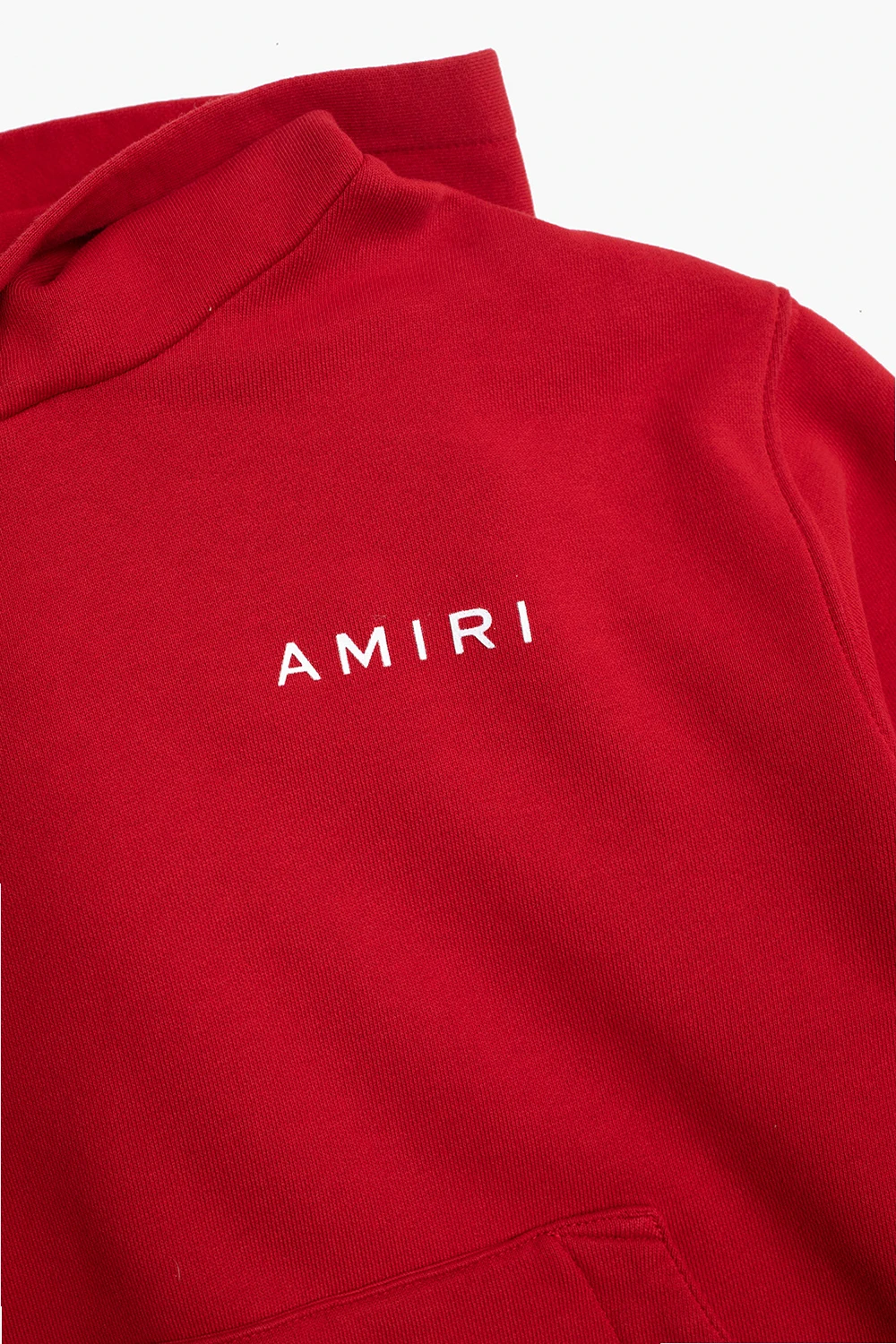 Red hoodie from Amiri Kids. Crafted from cotton jersey, this style features two slip pockets accompanied by a white logo print on the front, a colourful graphic print at the back and elasticized trims on the bottom hem and long sleeves.