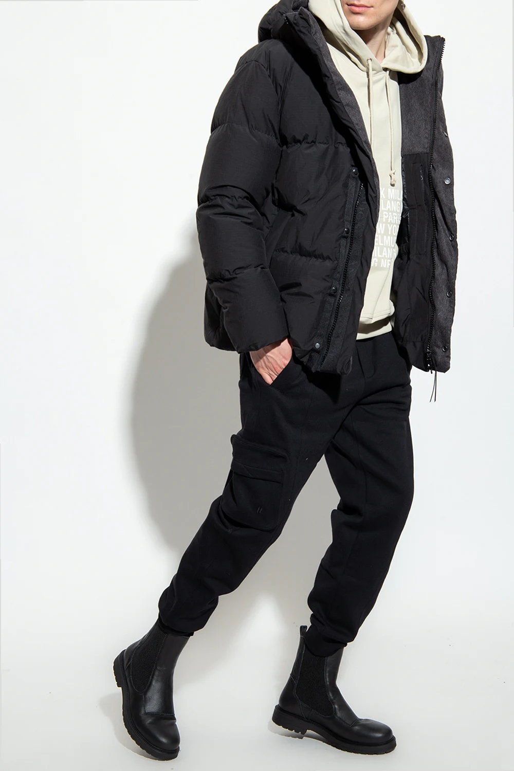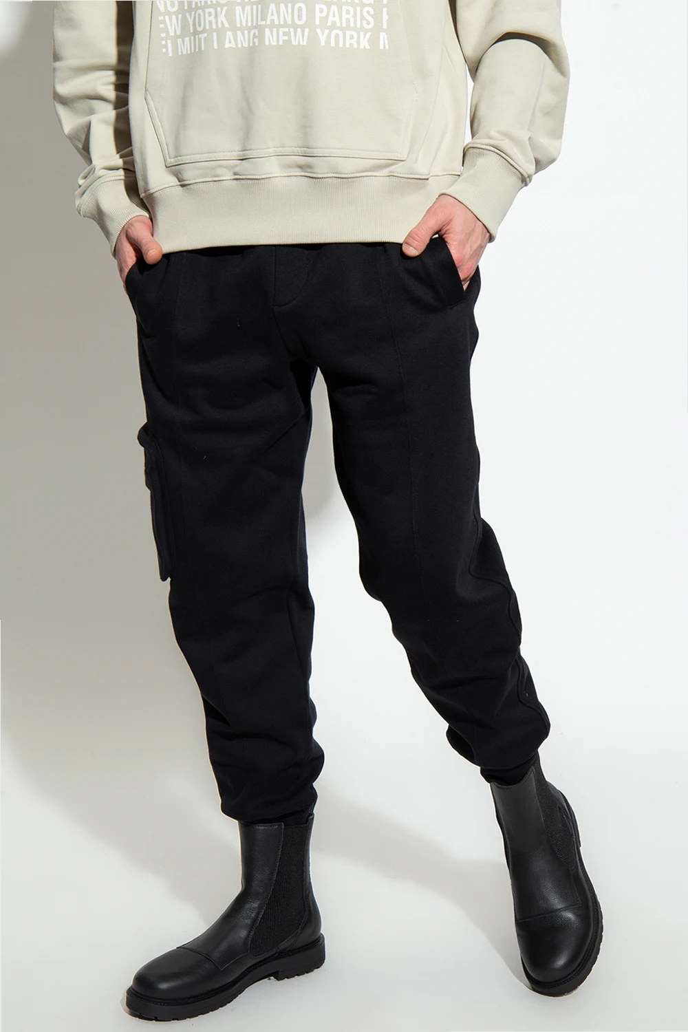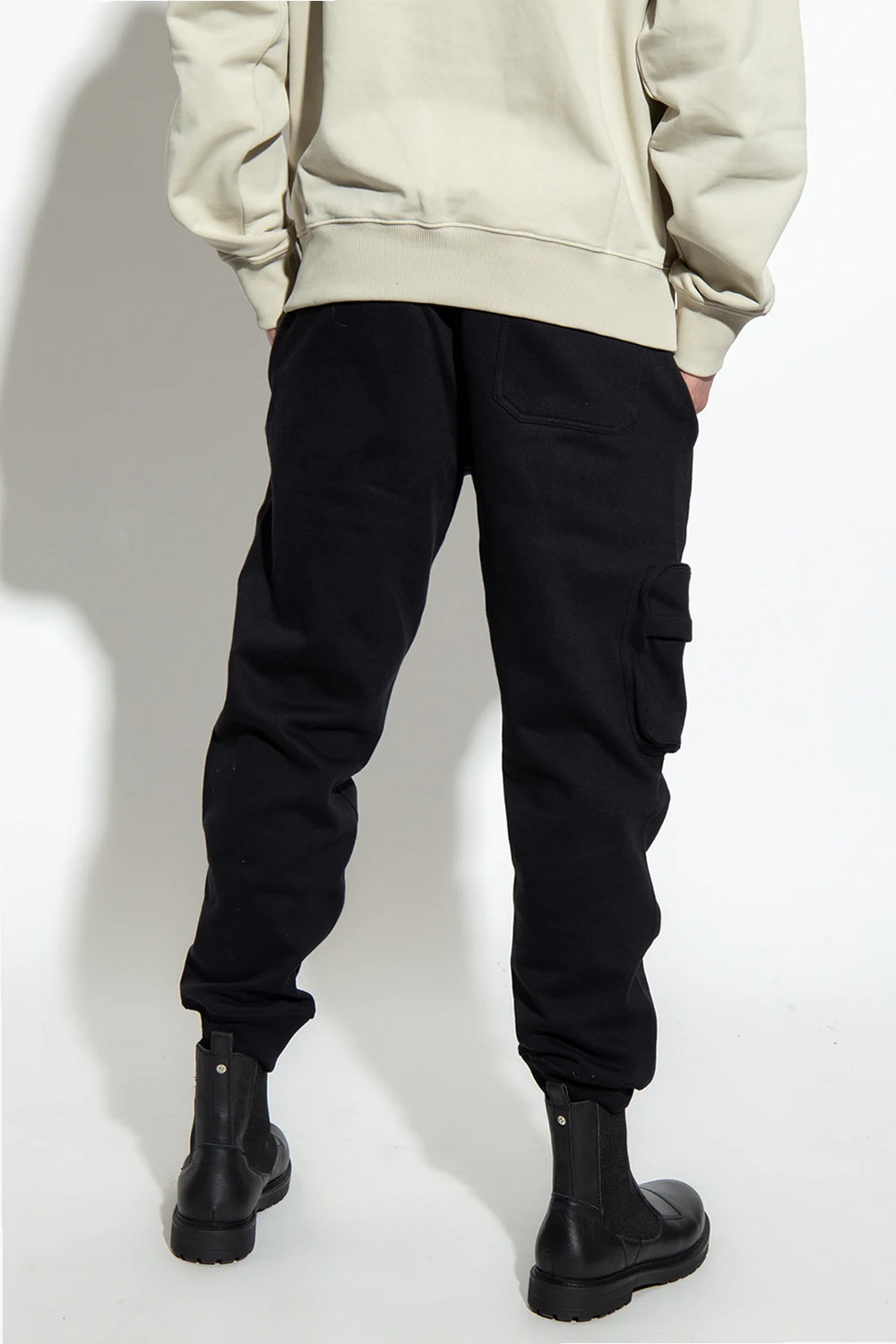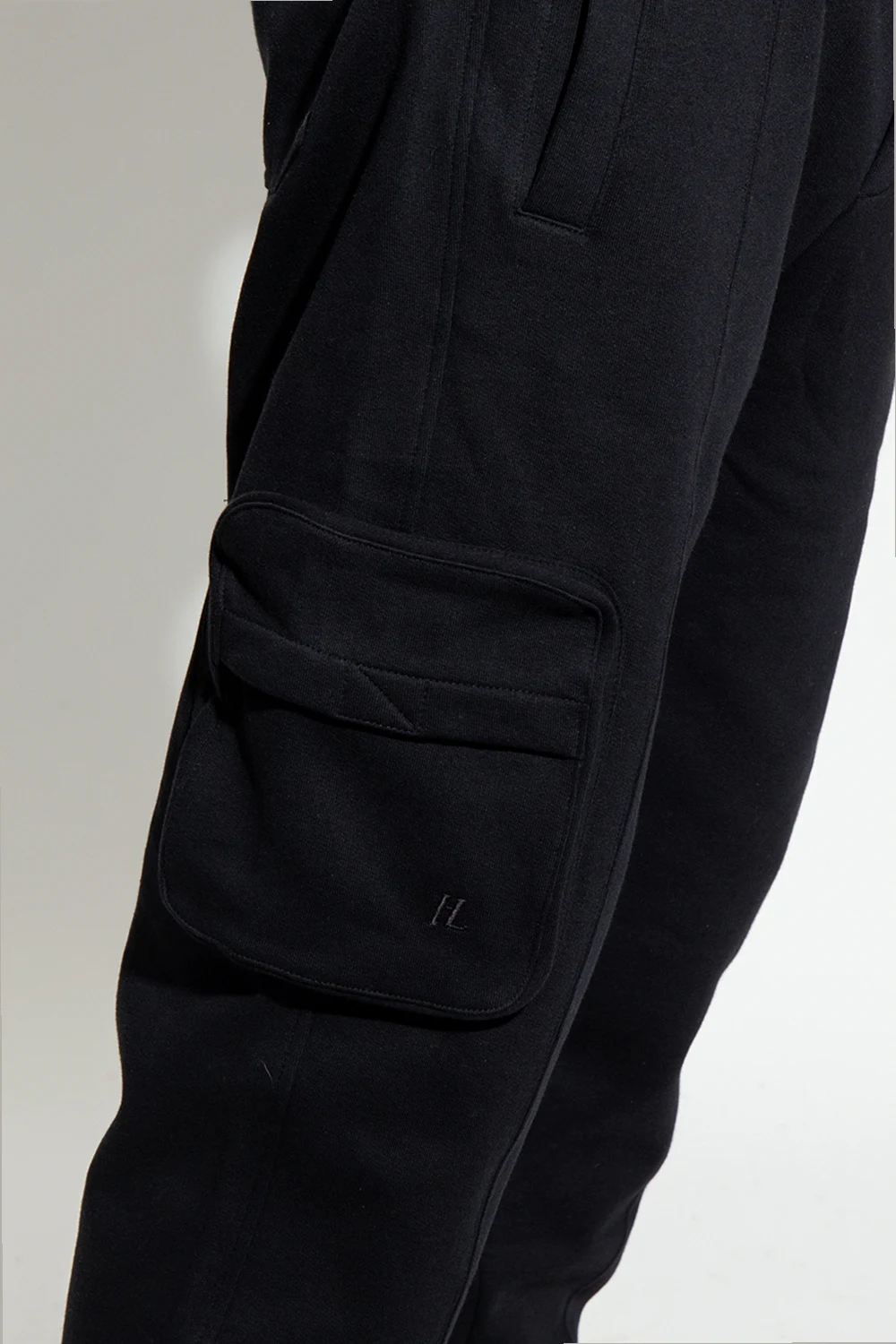 Black sweatpants from Helmut Lang. Made of cotton, this pair features an elasticated waistband with a drawstring fastening, ribbed cuffs, two slip pockets and a velcro-fastened flap one with an embroidered logo on the front and a welt pocket on the back.