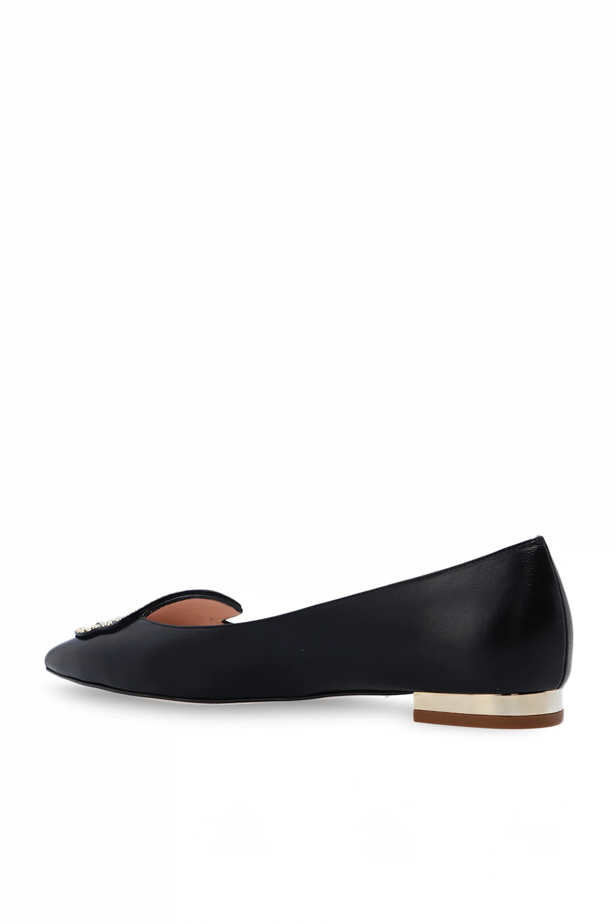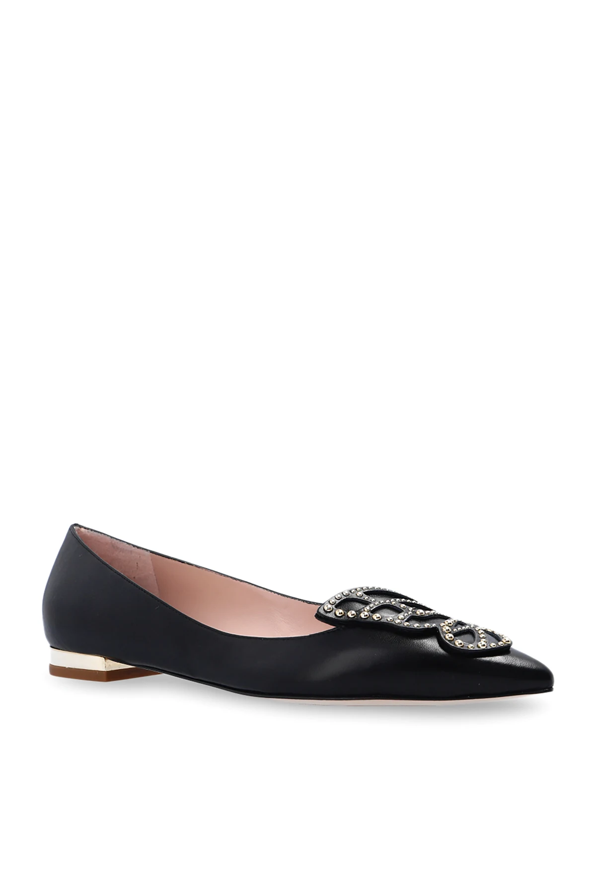 Black ‘Butterfly’ shoes from Sophia Webster. Made of leather, this model features a wing motif with gold-tone studs, pointed toe with gold-tone elements and beige leather sole with the label’s signature heart motif.