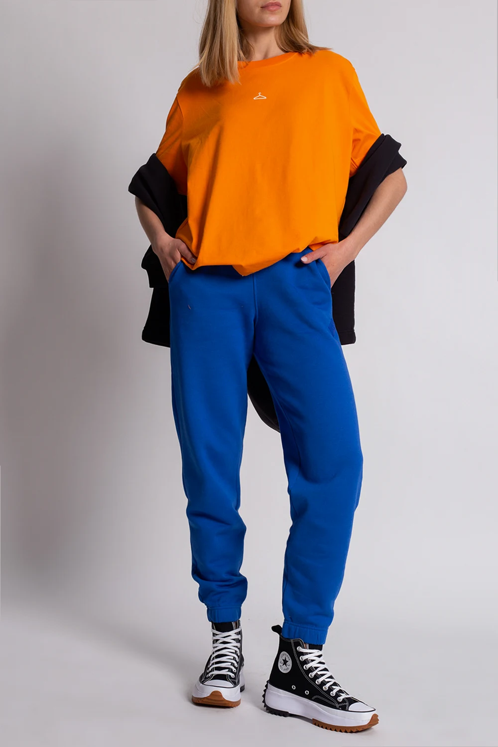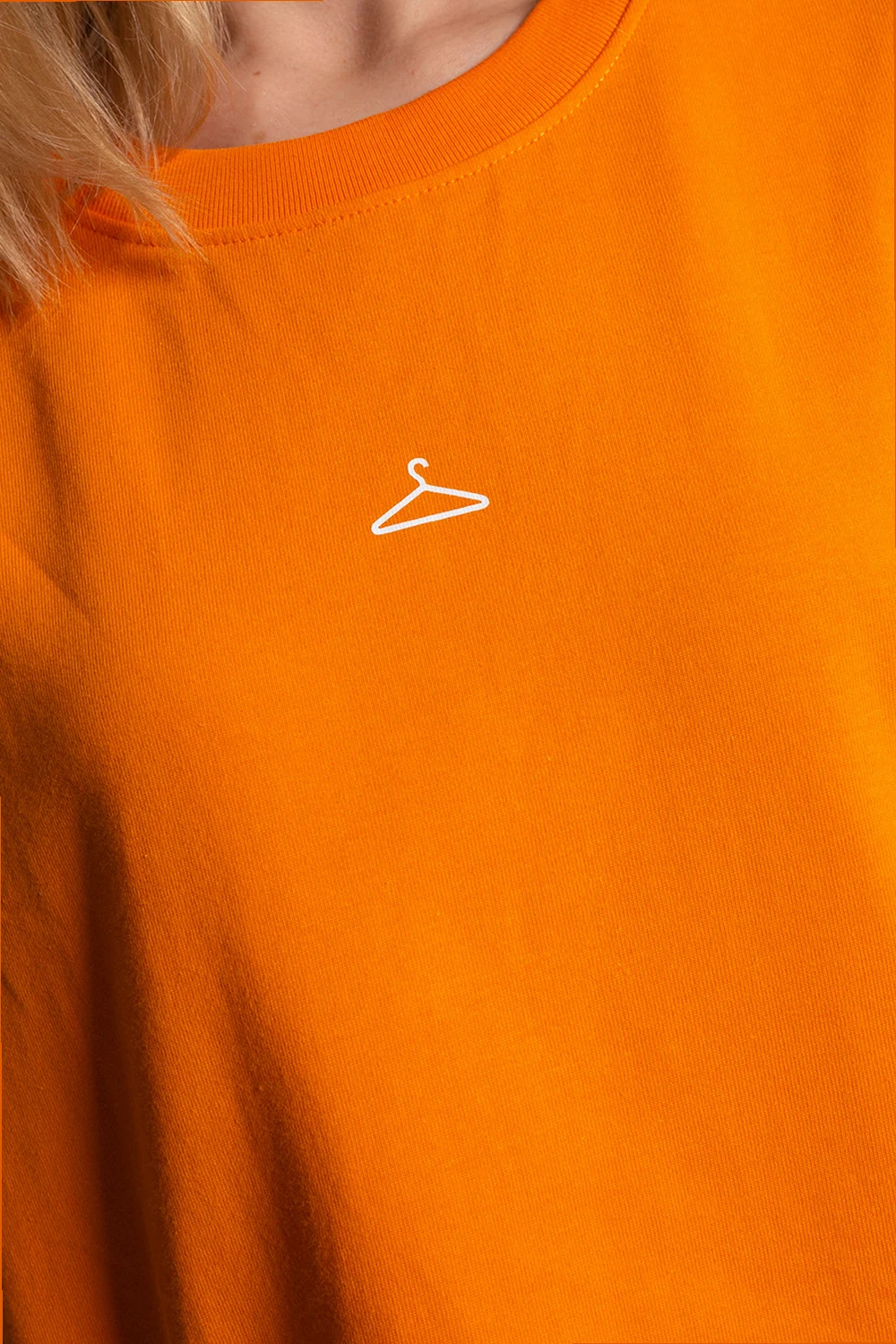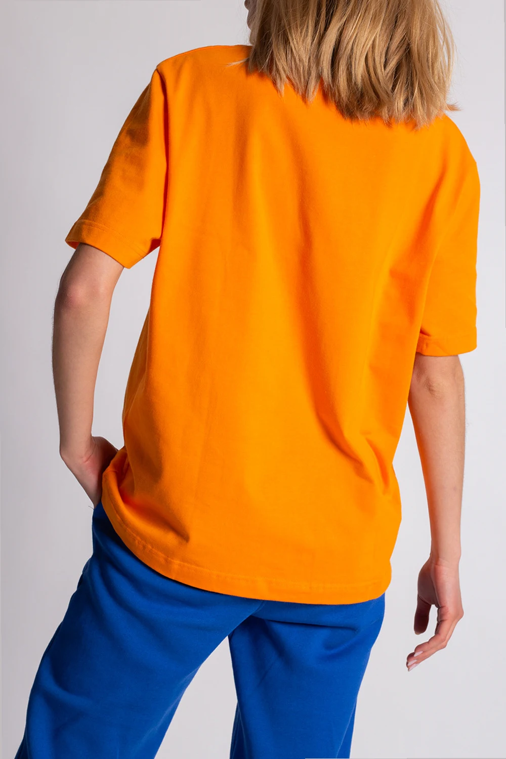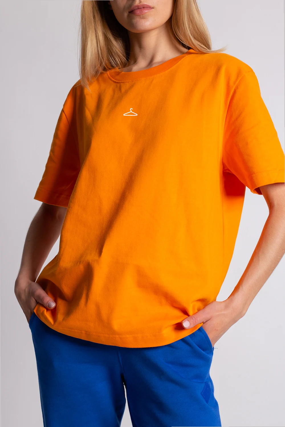 Orange crewneck T-shirt from Holzweiler. Crafted from organic cotton, this style features short sleeves, rib detailing on the collar and a white graphic print with the brand's logo