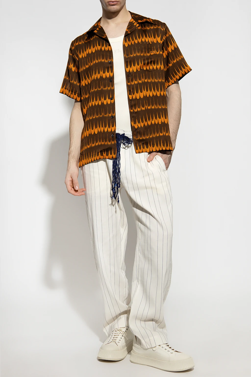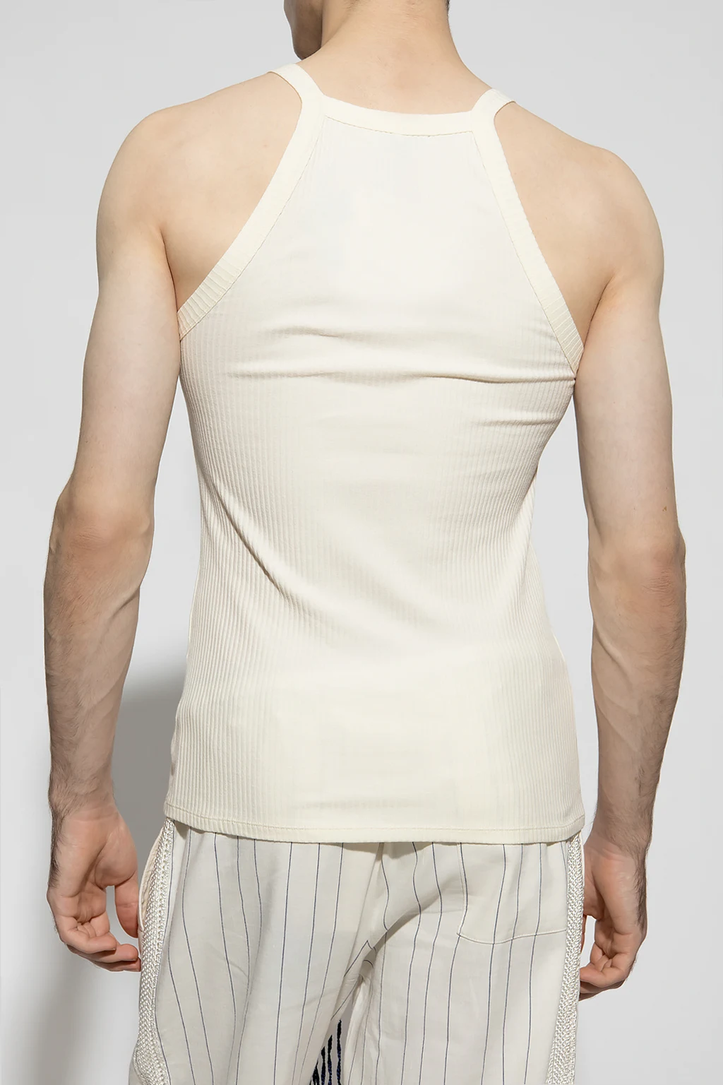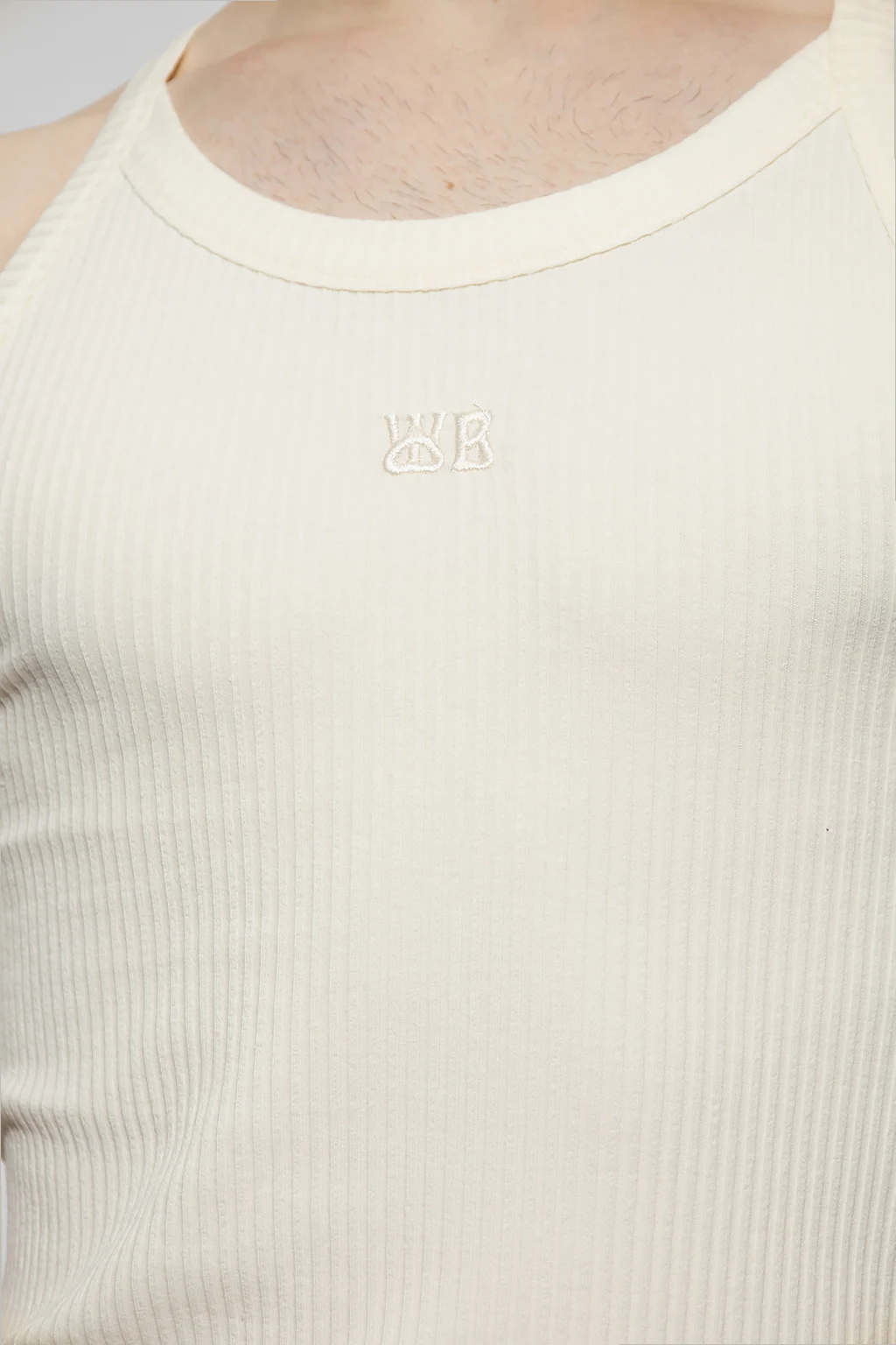 Cream ‘Groove’ ribbed T-shirt from Wales Bonner. Made of organic cotton, this garment is decorated with a logo embroidery.