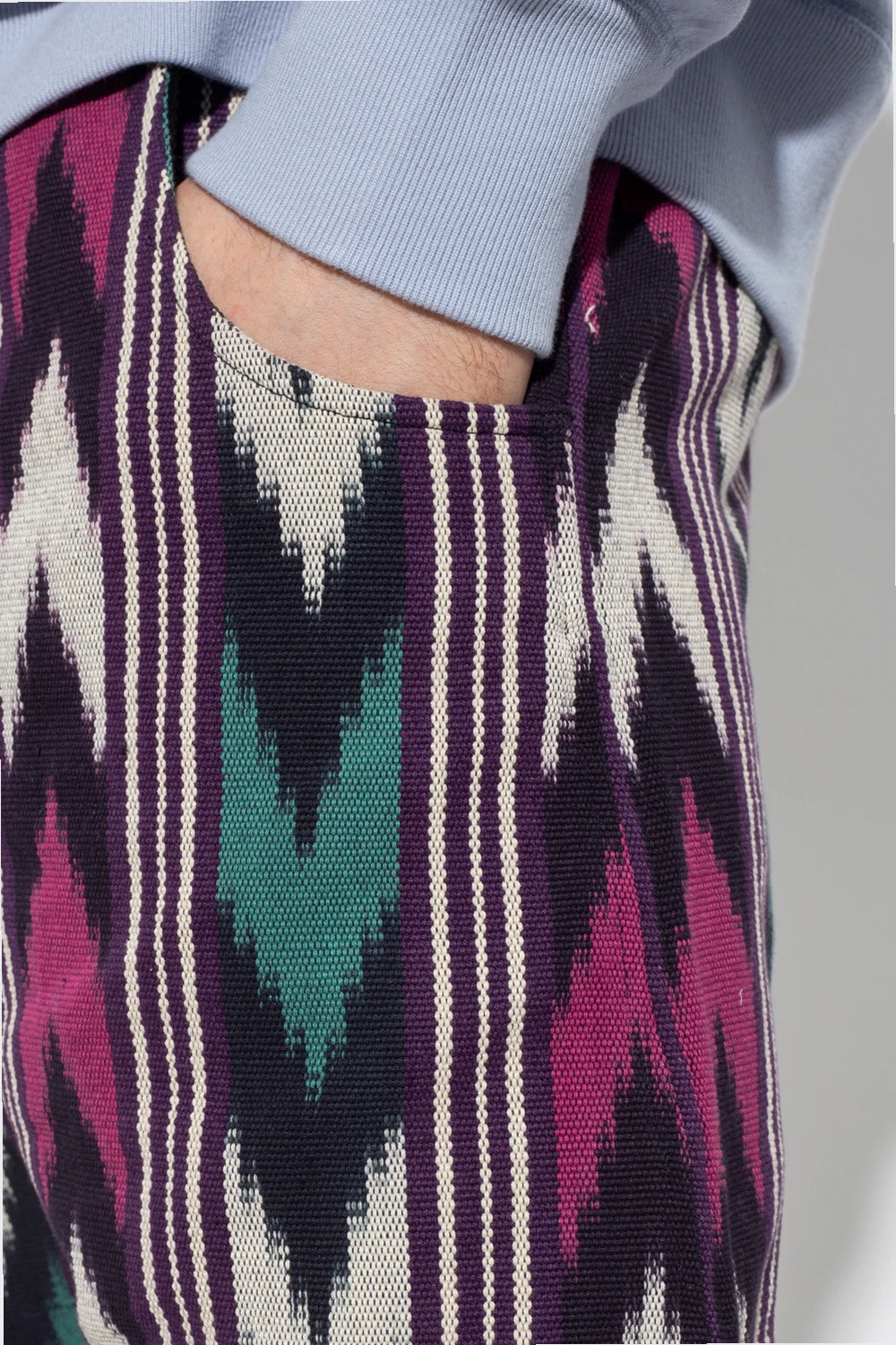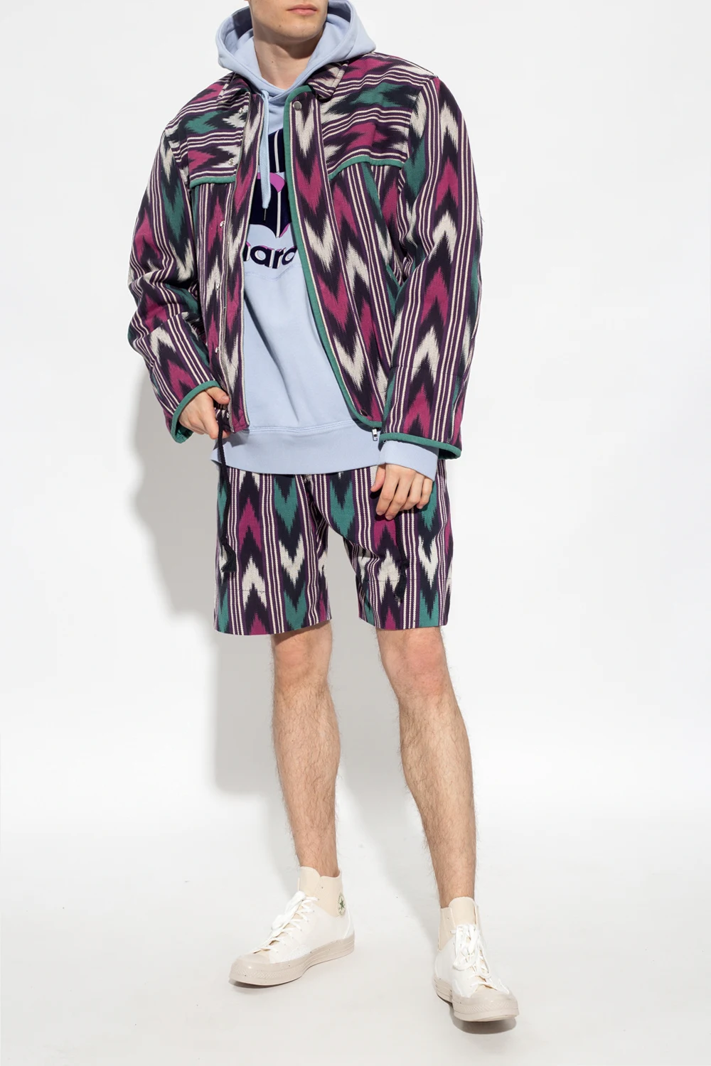 Multicoloured ‘Lelian’ shorts from Isabel Marant. Made of cotton, this pair showcases a graphic pattern inspired by Ikat – the Indonesian method for colouring fabric in patterns by resist dyeing. It is complete with snap and button fastenings, a waist-cinching drawcord belt, four slip pockets and green trimming.