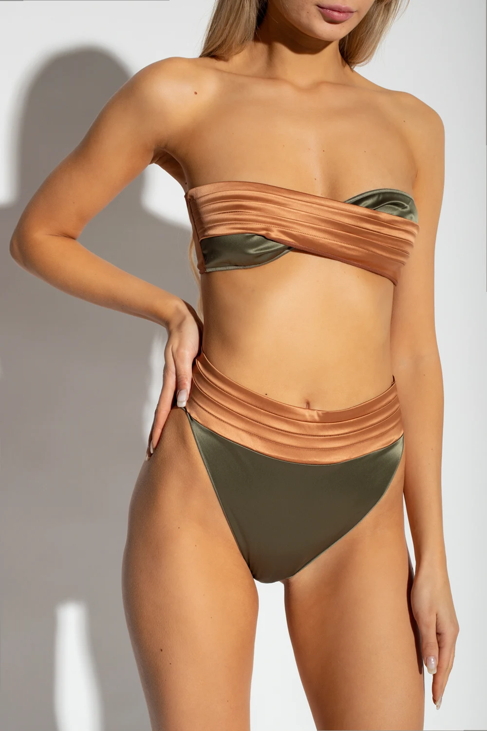 Green and brown bikini from Oseree. This set includes a bra with ties and detachable shoulder straps as well as high-waisted briefs.
