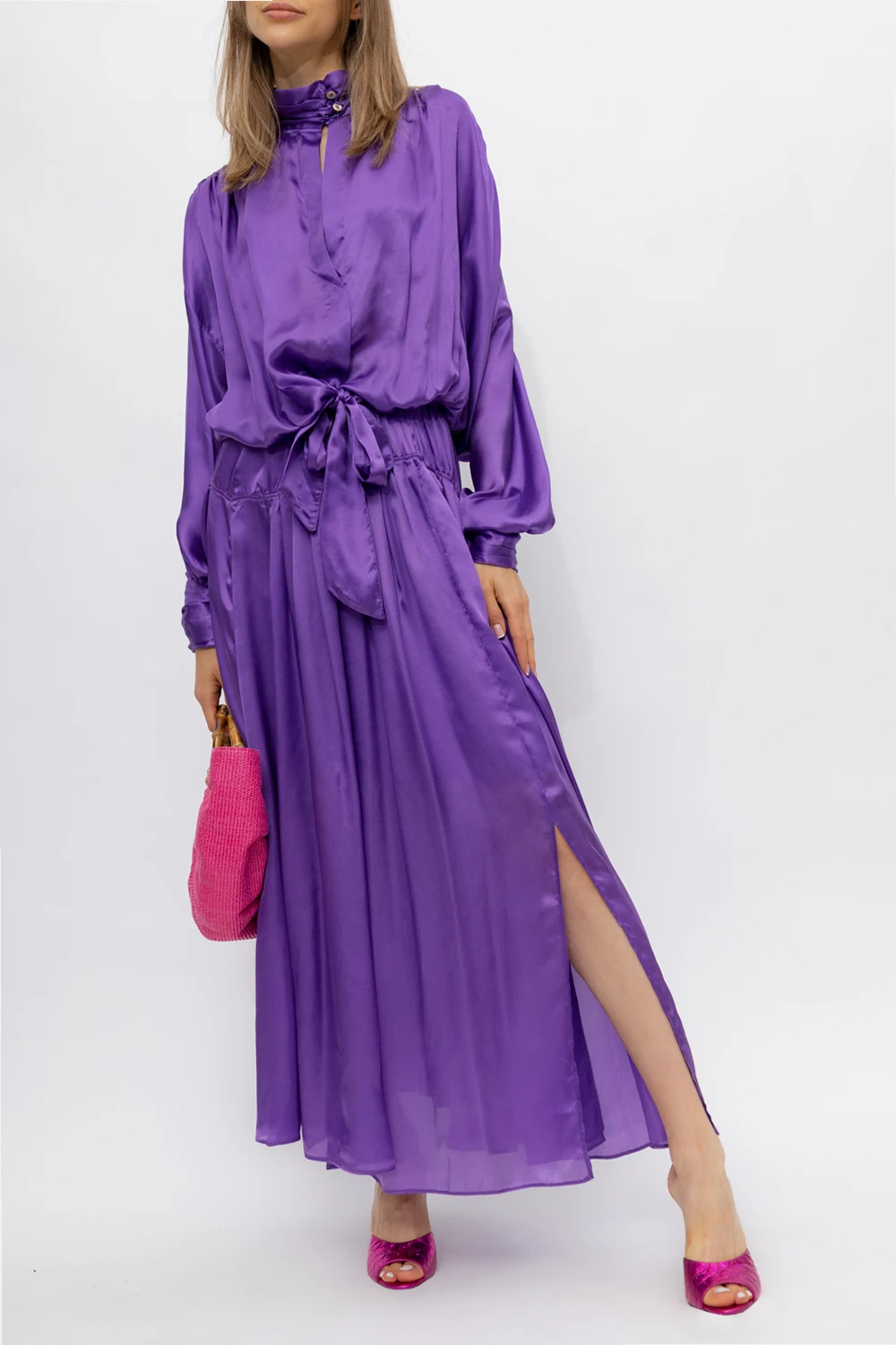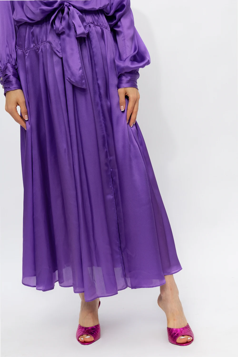 Purple skirt from Forte Forte. Crafted from silk satin, this design features an elastic waistband, a concealed side zip, decorative gathers and slit on the front.