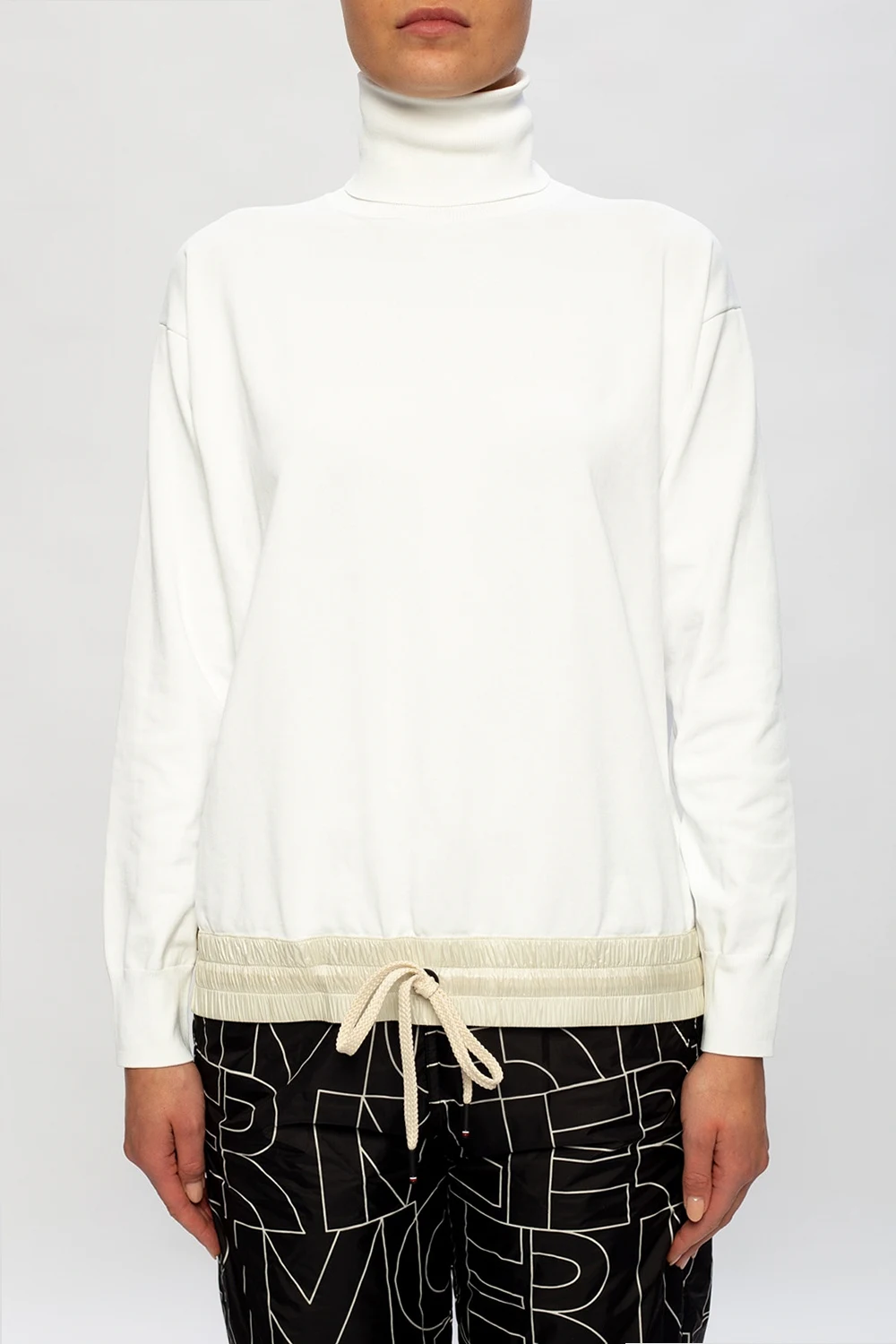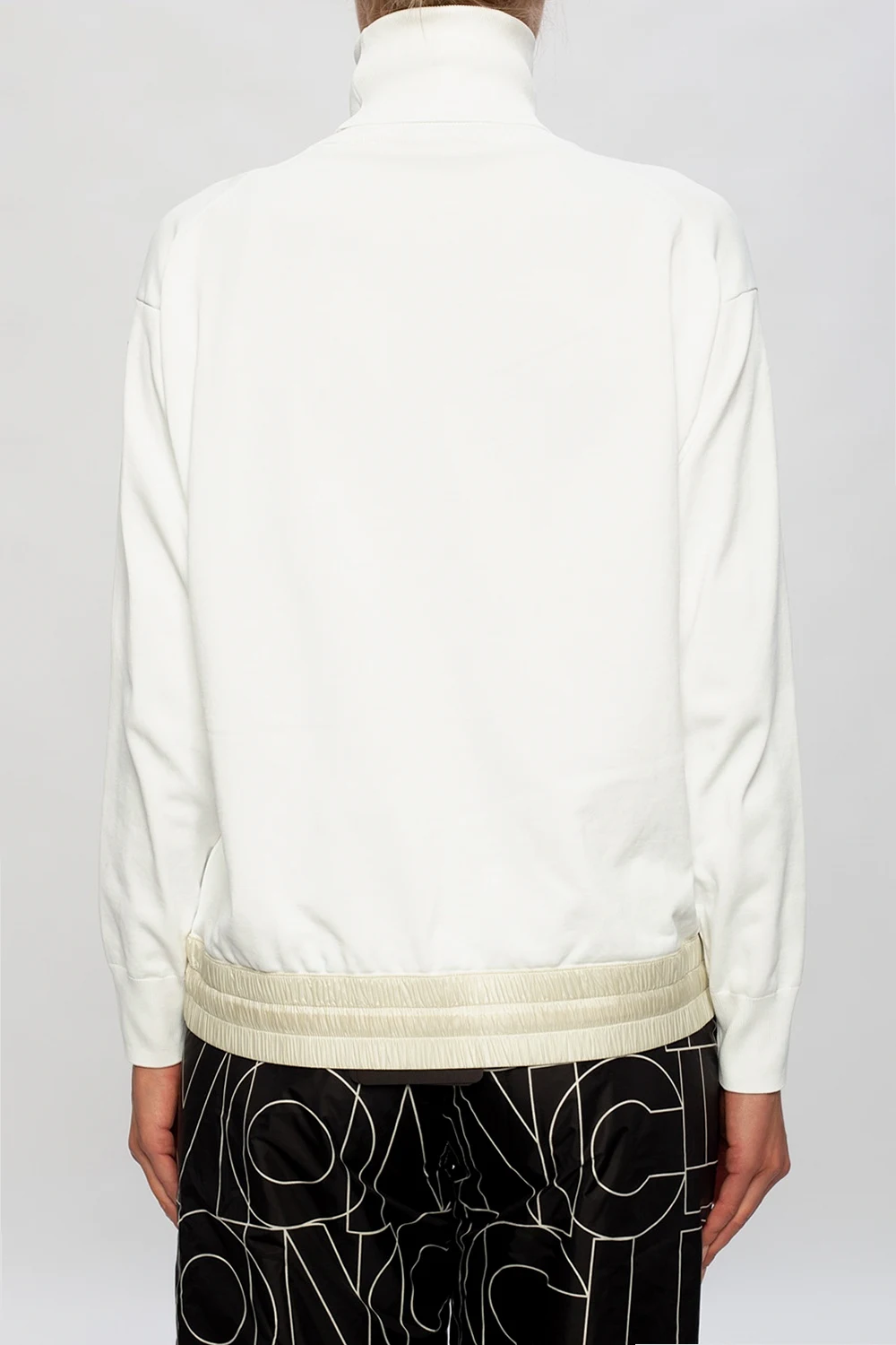 White sweatshirt from Moncler. Sporting snug turtleneck collar, this jumper is complete with long sleeves and a beige rib-knit hem.