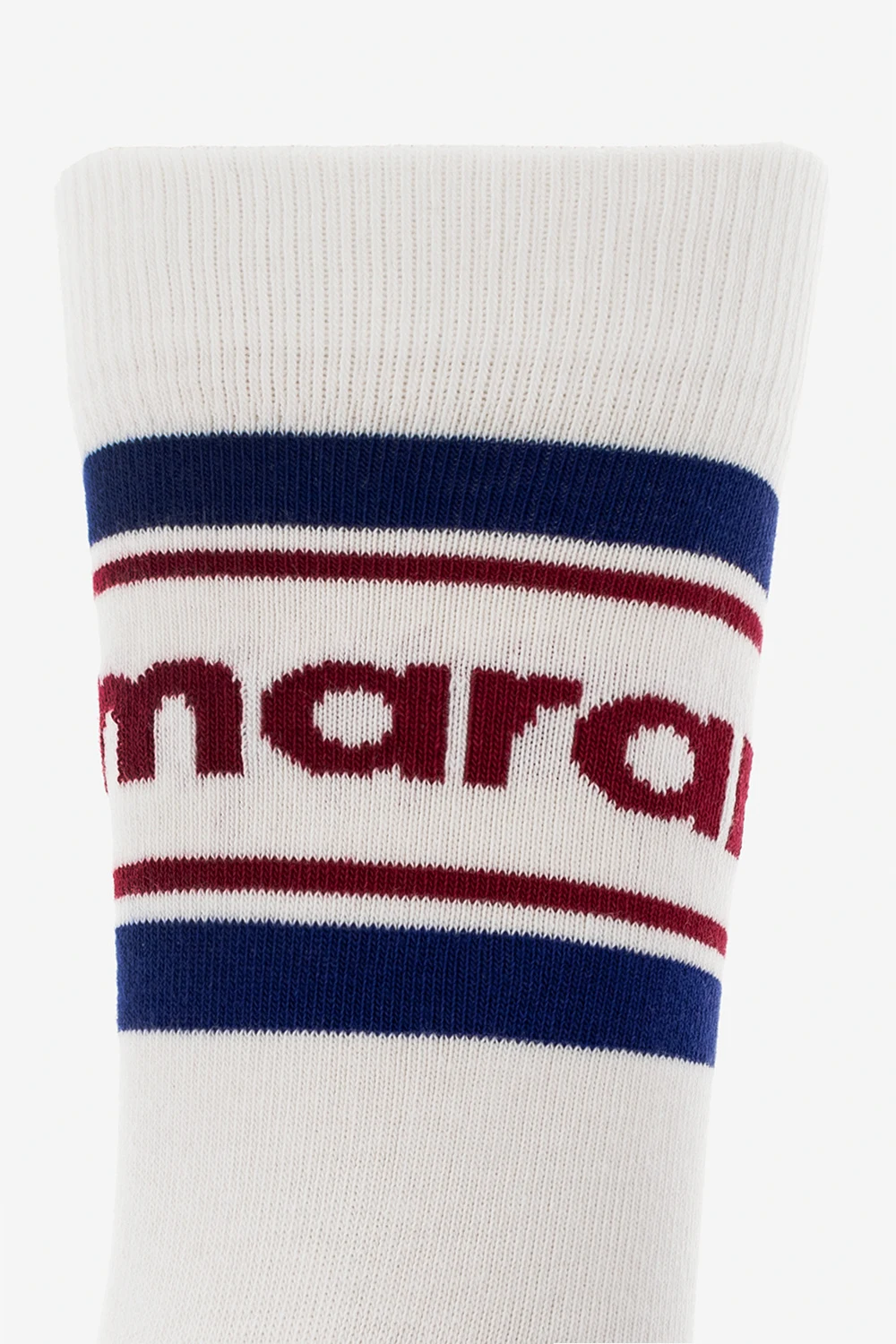 White, navy and maroon ‘Dona’ socks from Isabel Marant. Made of cotton, this design features a logo and ribbed cuffs.