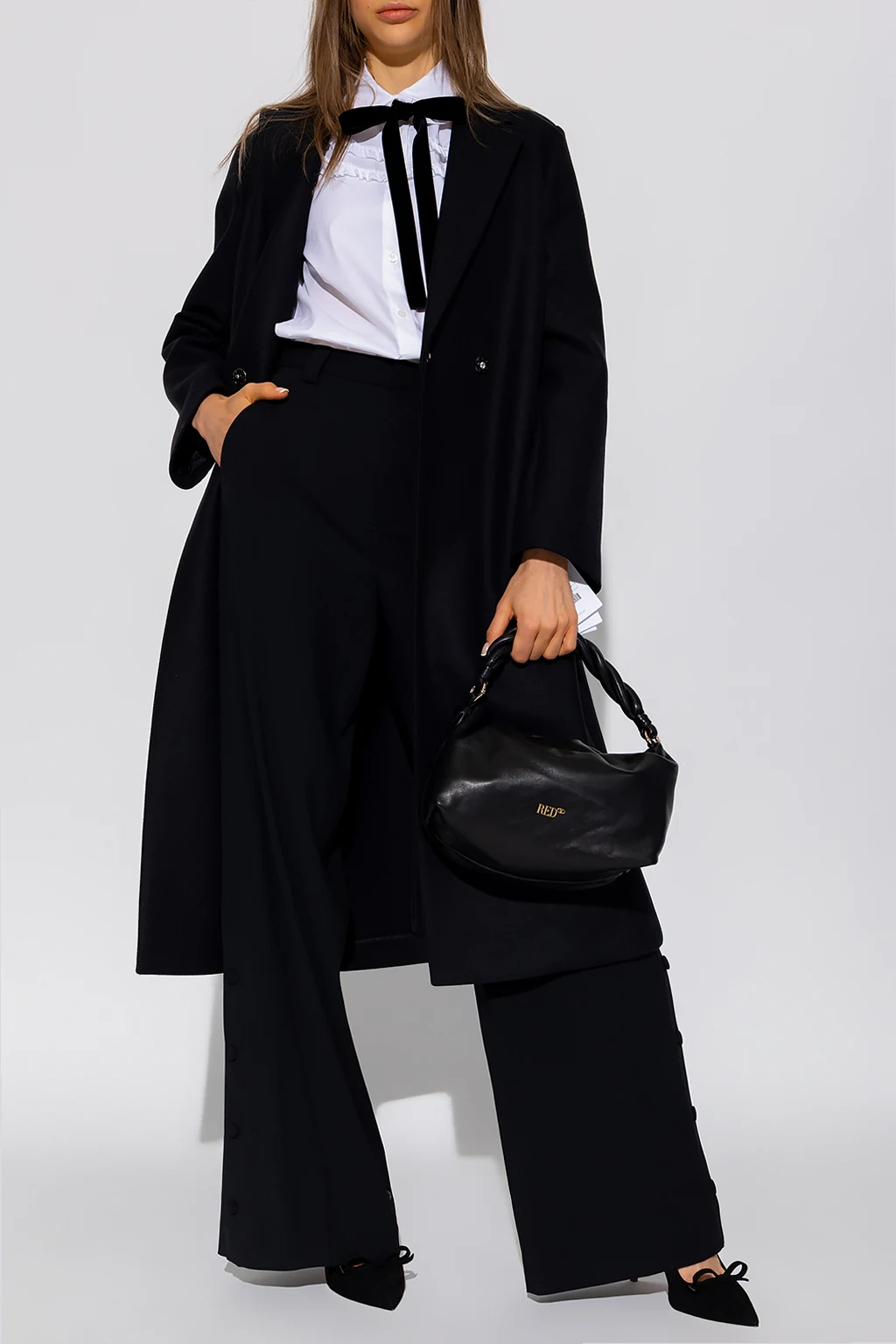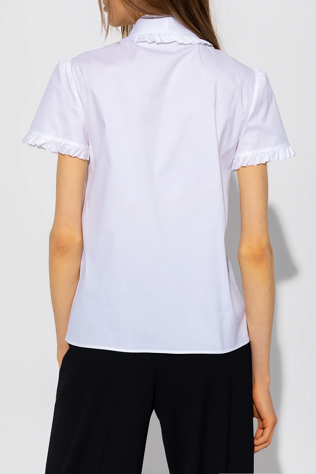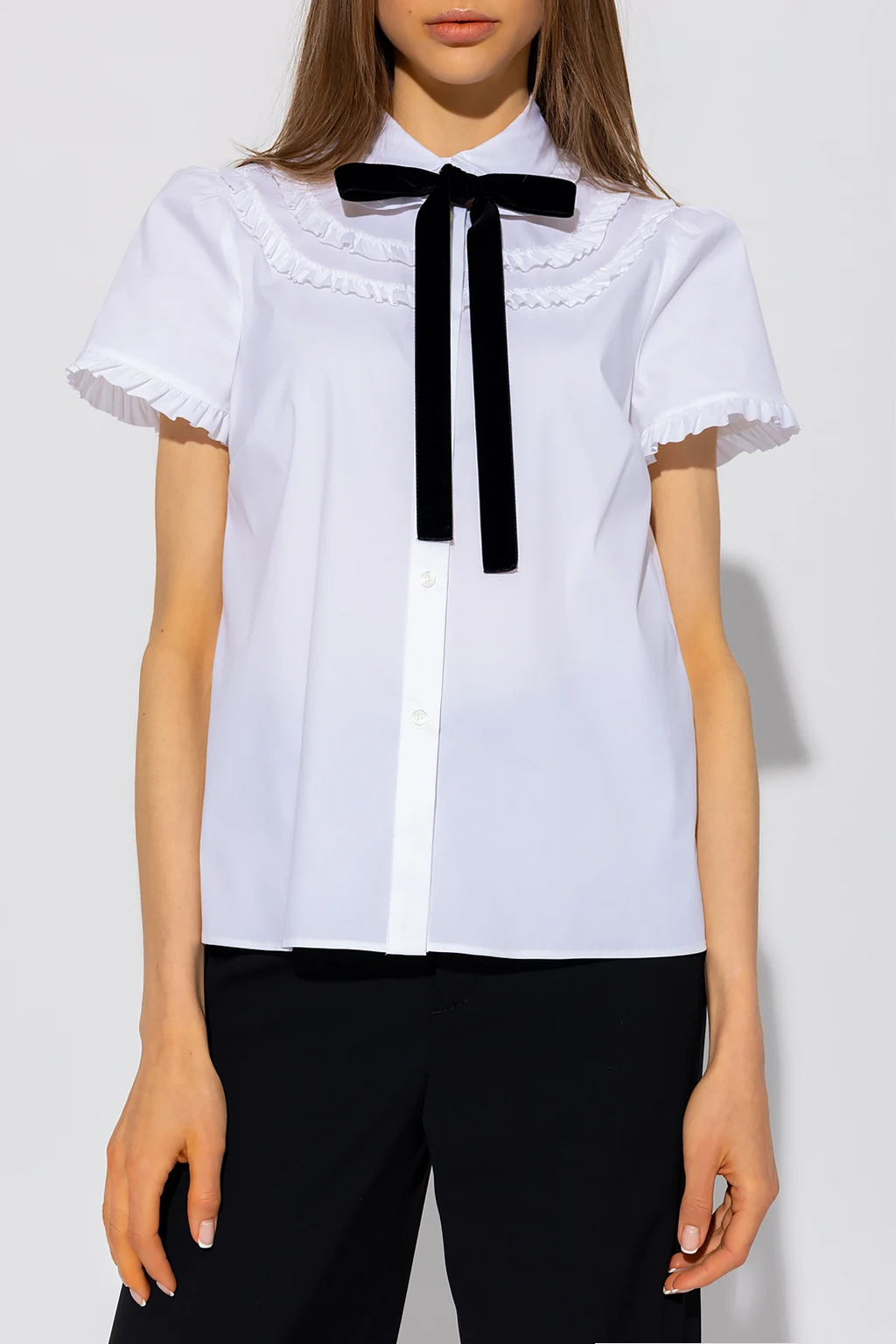 White shirt from Red Valentino. Crafted from a cotton blend, this garment features button fastenings, decorative ruffles, neckline with a removable black tie and short sleeves.