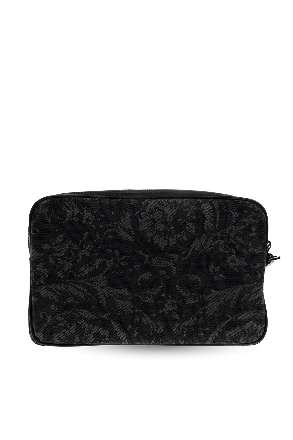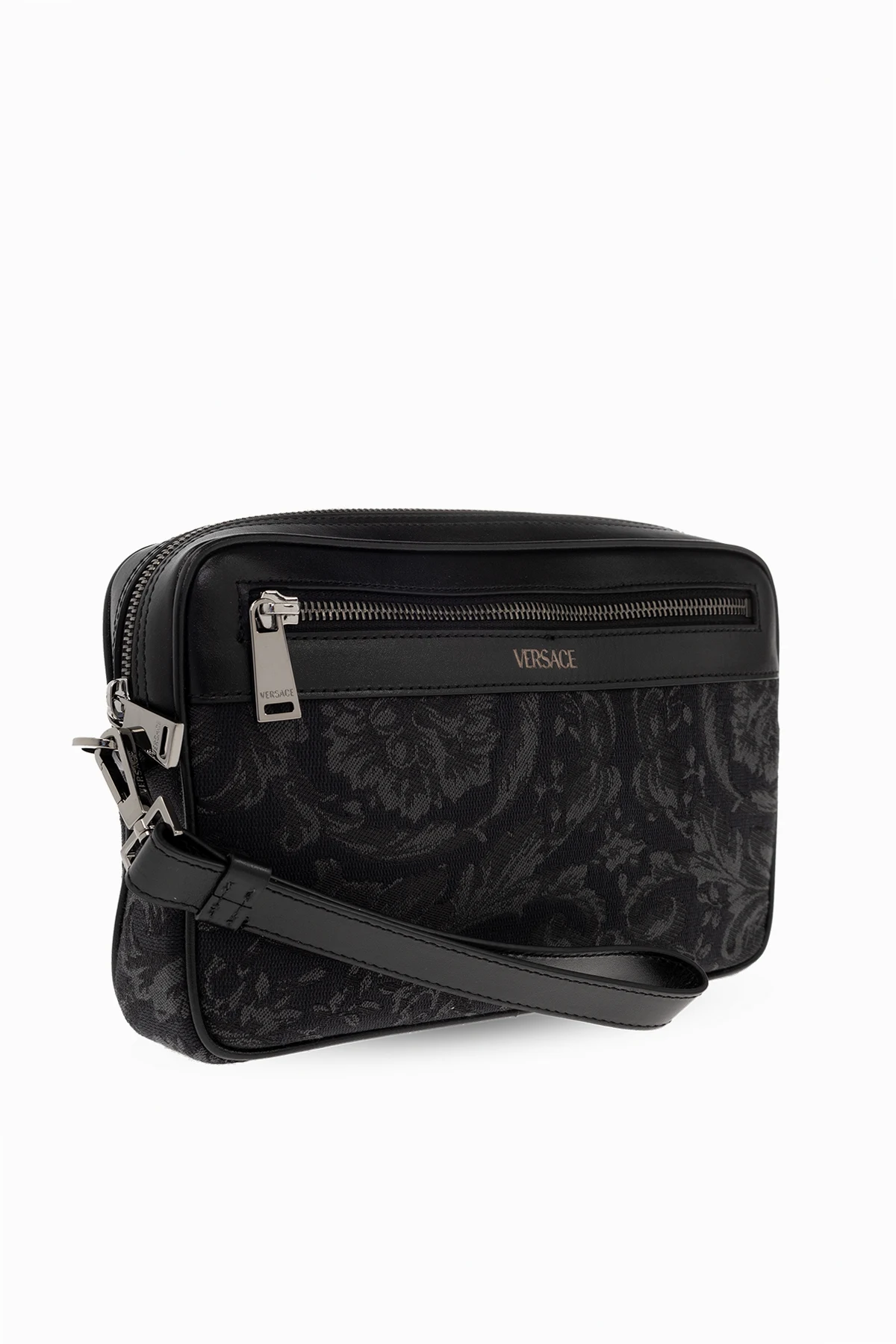 Black and dark grey ‘Athena’ handbag from Versace. Made of fabric with a jacquard Barocco motif and calf leather trims, this design features a zip fastening, logo print, front pocket, detachable wrist strap, silver-tone metal hardware and one internal compartment with six card slots.