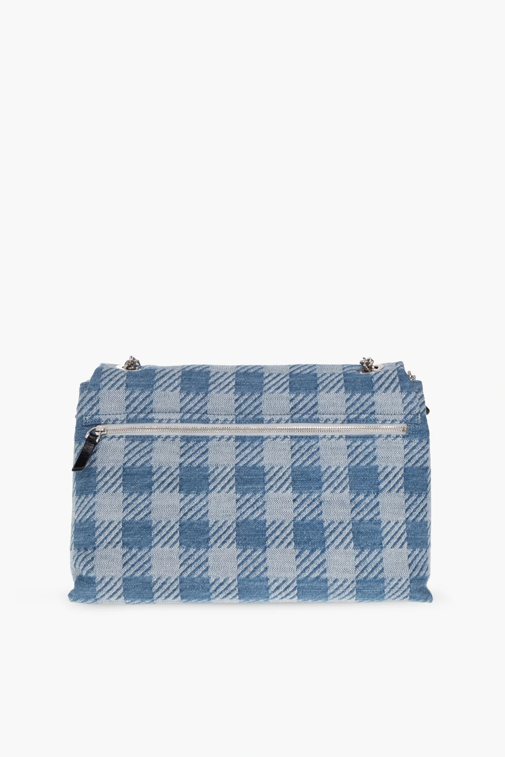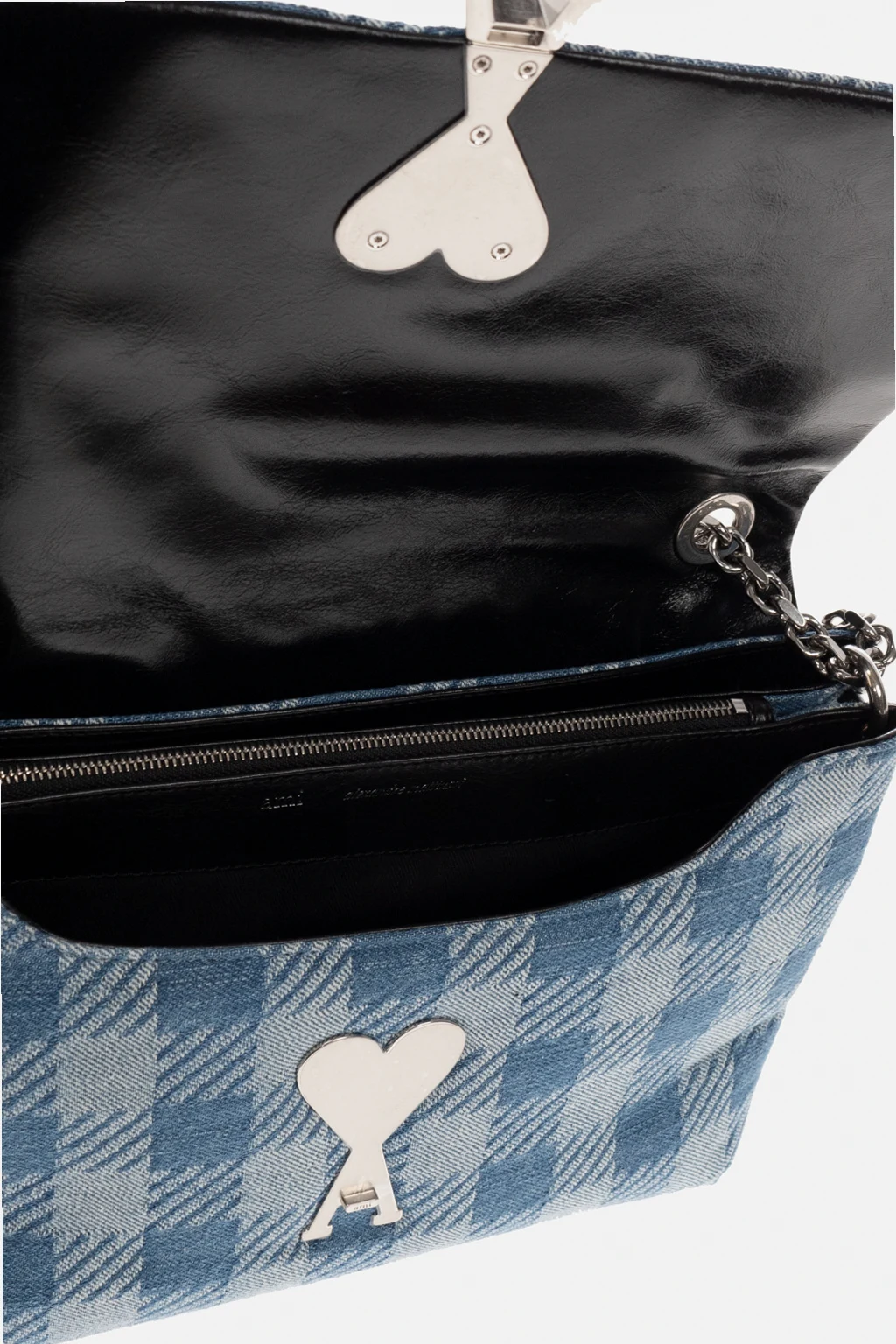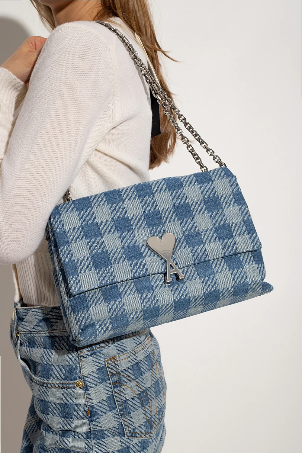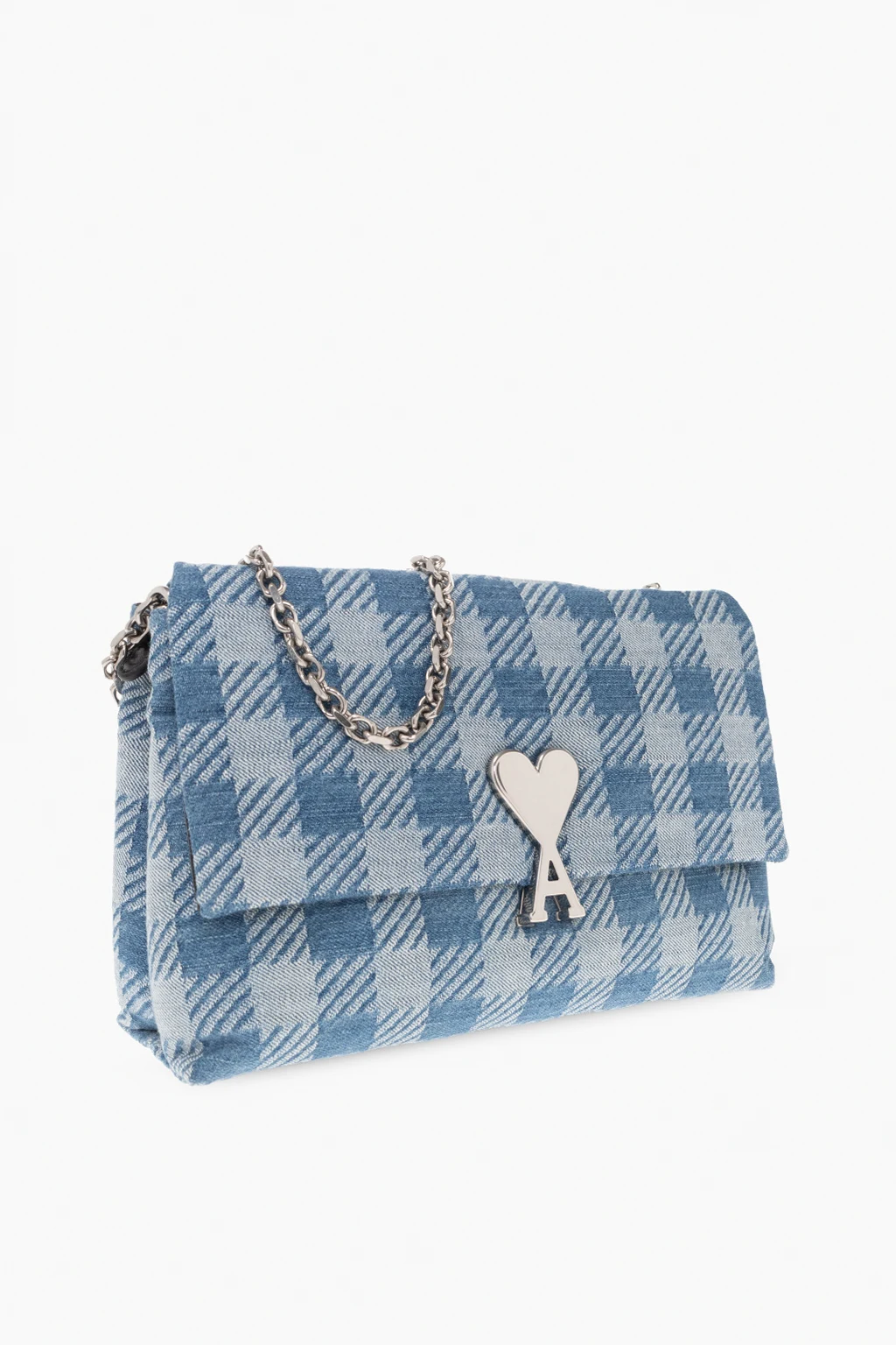 Blue ‘Voulez-Vous’ shoulder bag from Ami Alexandre Mattiussi. Embellished with a check pattern and ‘Ami de Coeur’ hardware, this design secures with a magnetic snap and features a back zip pocket, a metal chain shoulder strap, silver-tone metal elements and two compartments, one zipped compartment and one slip pocket inside.