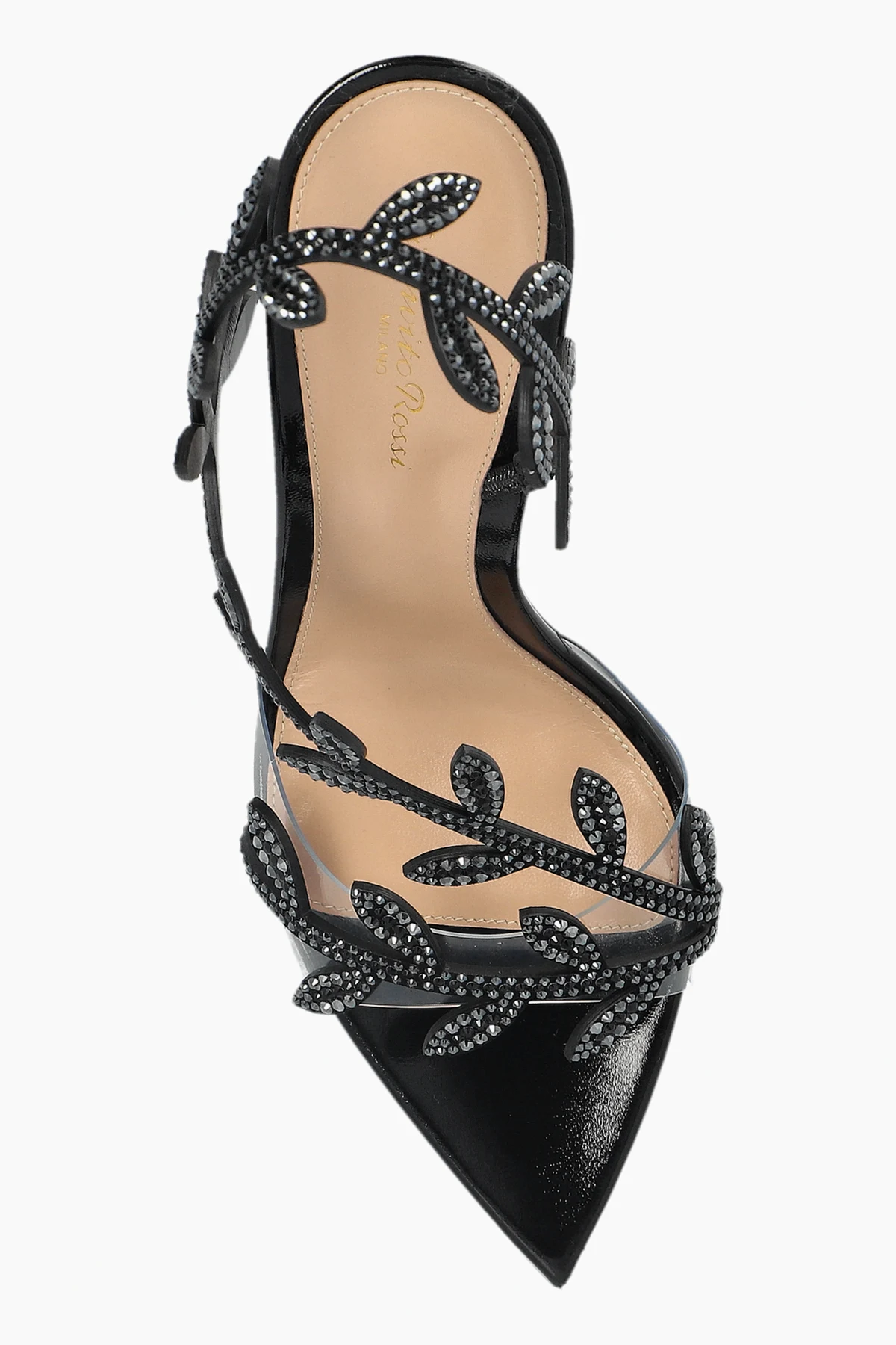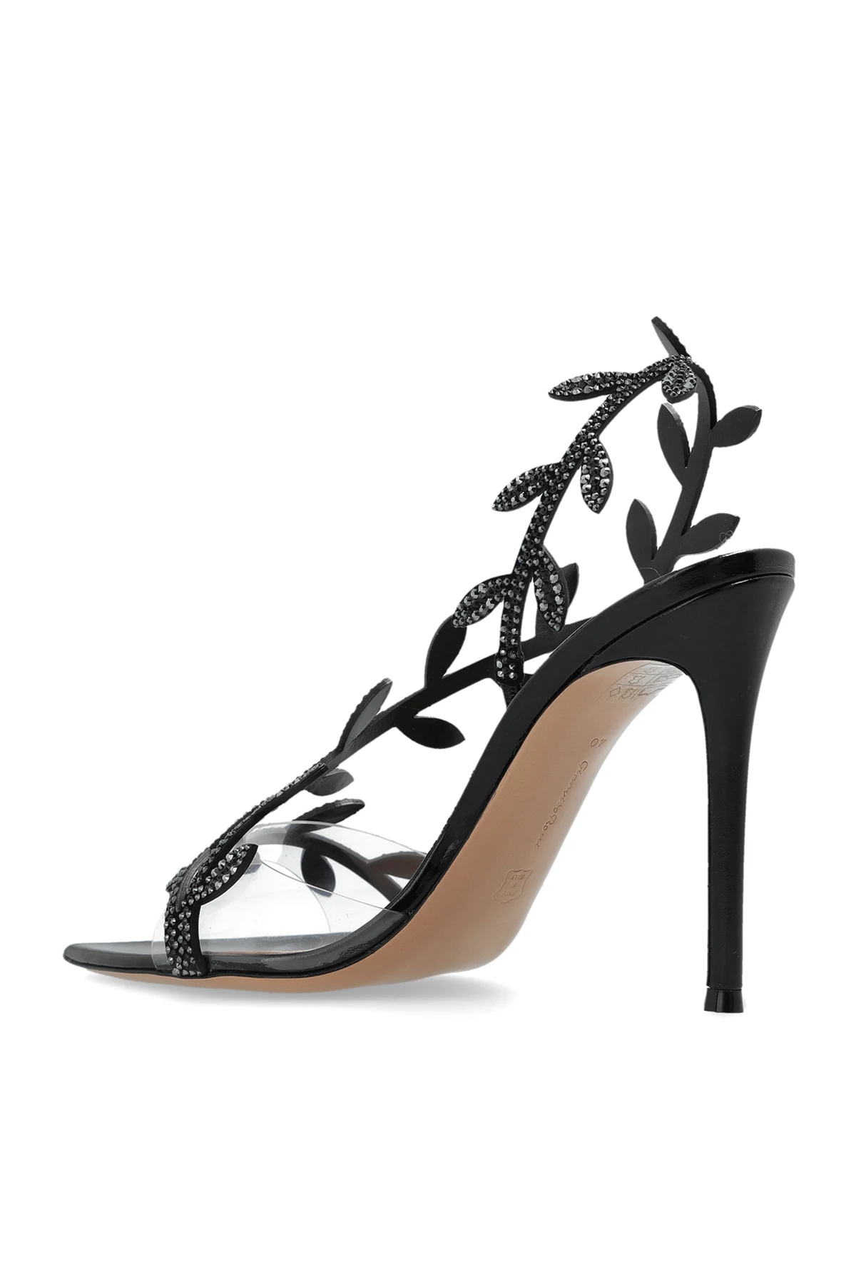 Die Schuhe zeichnen sich durch einen schlanken, hohen STILETTO aus, der der Silhouette Leichtigkeit und Anmut verleiht. Die spitz zulaufende Vorderseite betont subtil die Linie des Fußes. Dekorative, blattförmige Elemente, die mit kleinen, glänzenden Steinen besetzt sind, verlaufen entlang der Riemen und verleihen ihnen außergewöhnlichen Charme.
