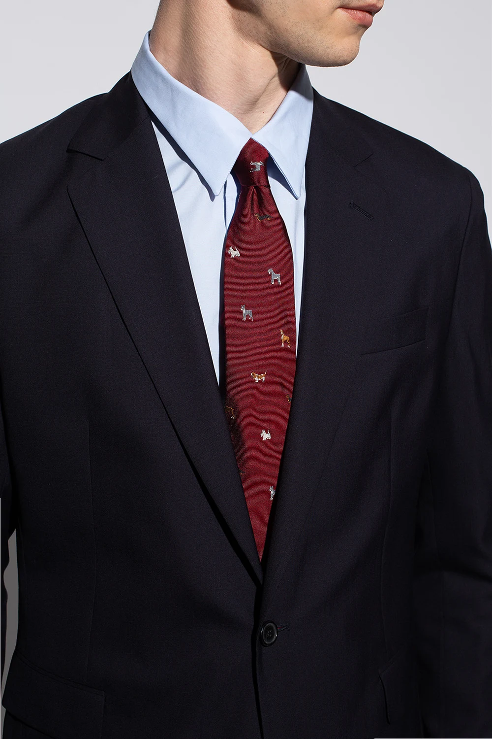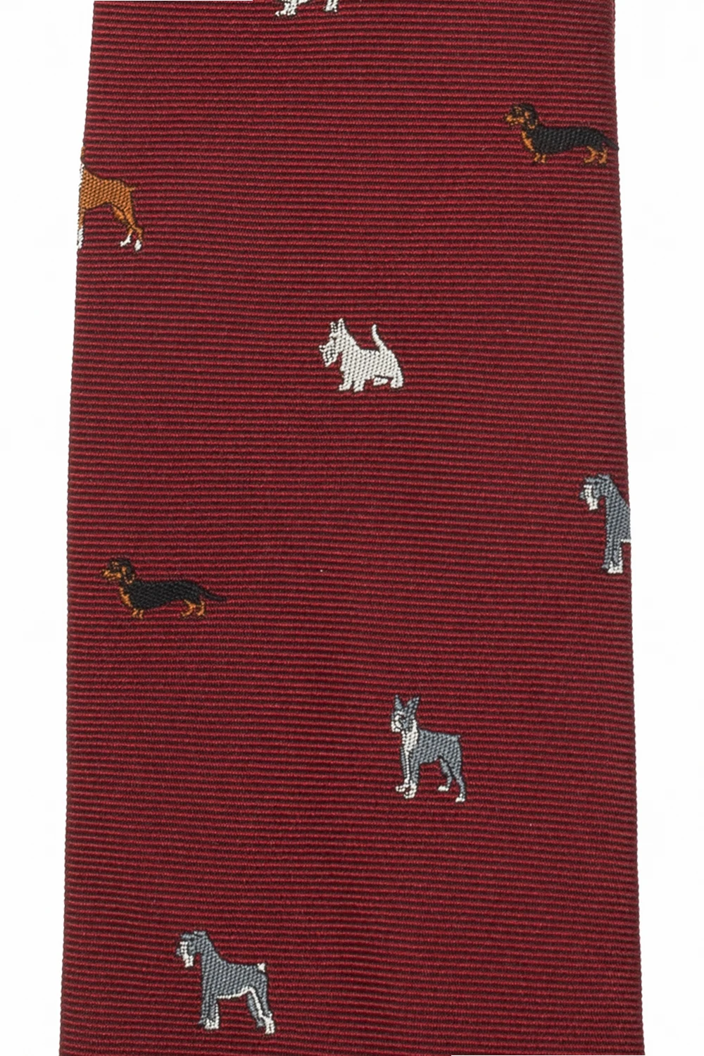 Maroon tie from Paul Smith. Made of silk, this item is decorated with an embroidered multicolored animal pattern.