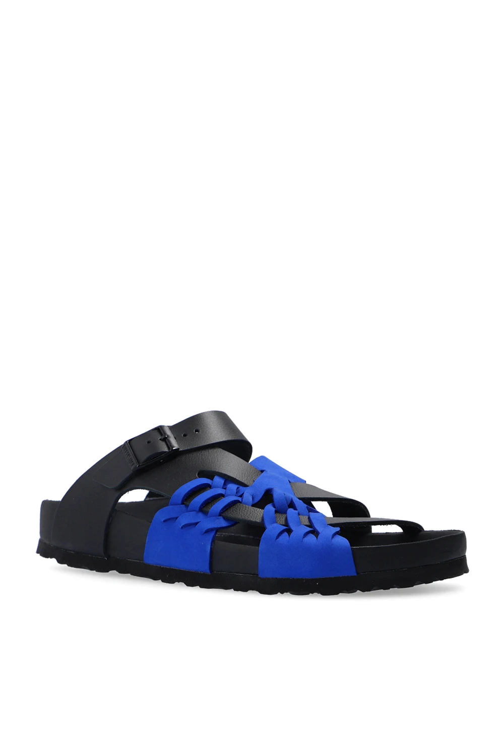 Black and navy blue ‘Tallahassee’ slides from Birkenstock x CSM. Crafted from leather, this pair sits on a black EVA foam sole and features woven details and a strap with a logo-embossed buckle.