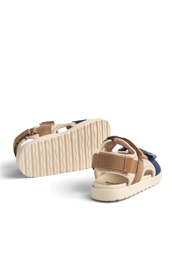 Die zarte, flache Sohle aus leichtem Schaumstoff ermöglicht ein unbeschwertes Gehen und sorgt zugleich für die richtige Dämpfung und Griffigkeit. Die Vielschichtigkeit des Designs wird durch kontrastierende Riemen in Hellbraun- und Dunkelblau-Tönen betont, die dank praktischer Klettverschlüsse eine präzise Anpassung an den Fuß ermöglichen.