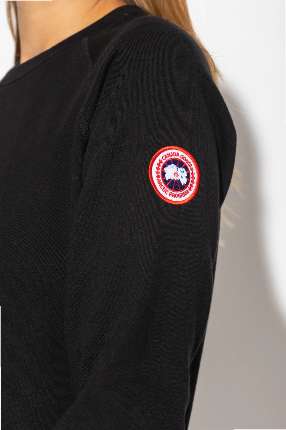 Black crewneck sweatshirt from Canada Goose. Crafted from cotton jersey, this style features a colourful logo patch on the sleeve and ribbed trims on the bottom hem and cuffs.