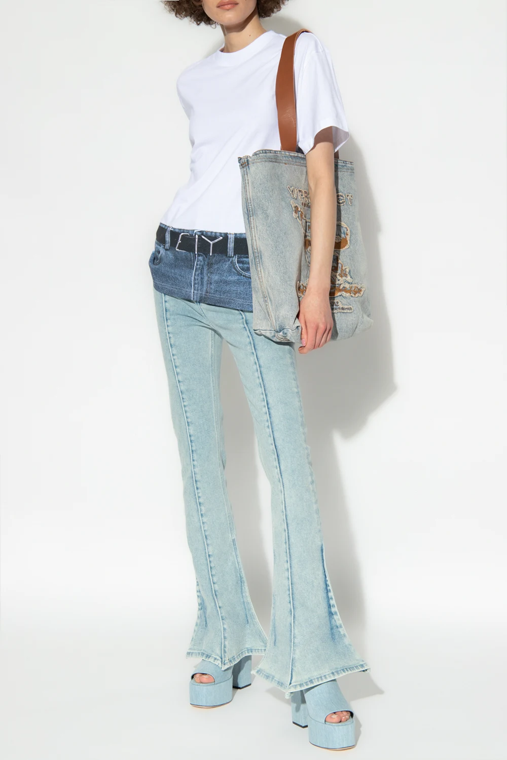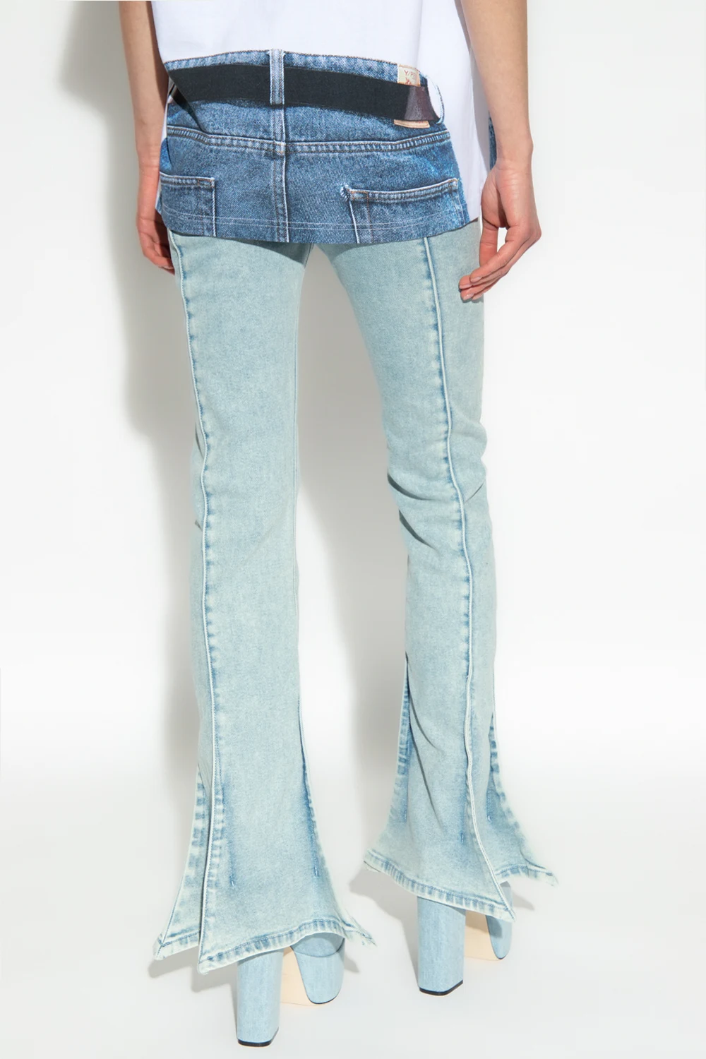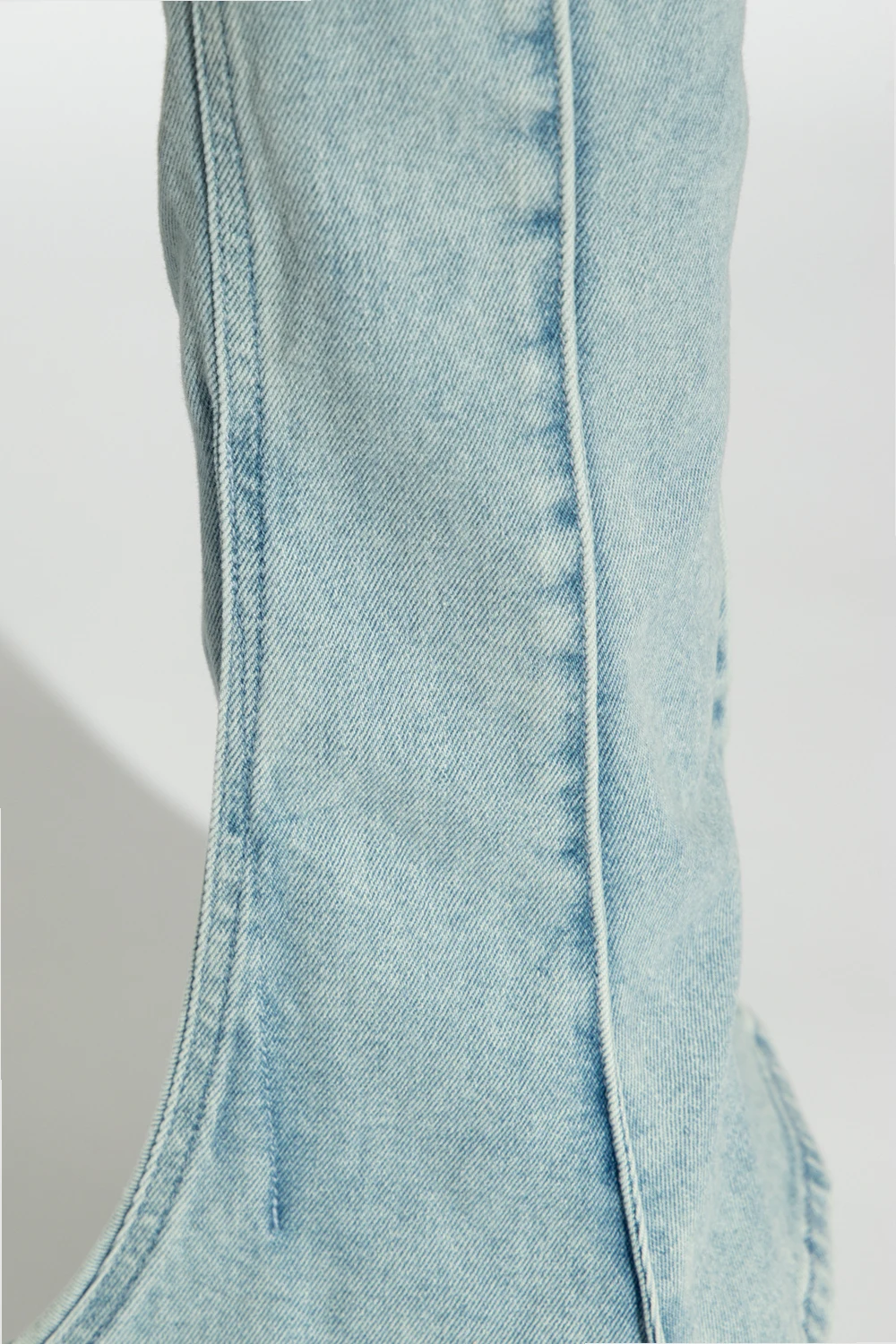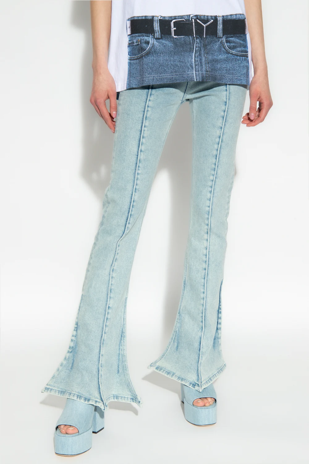 Light blue high-waisted jeans from Y Project, the ‘Evergreen’ collection. Made from sustainable materials, this flared design features a button and zip, brown logo patch at the back and five slip pockets.