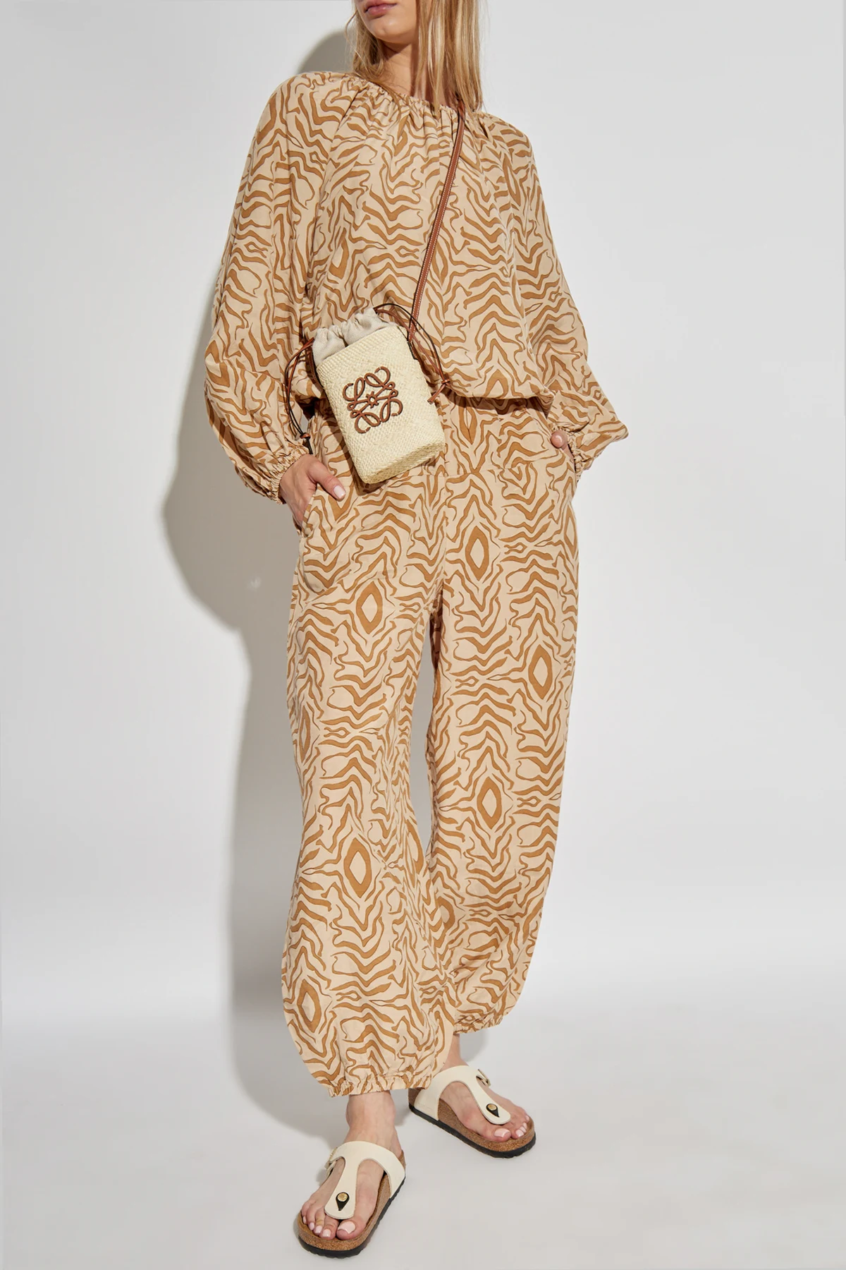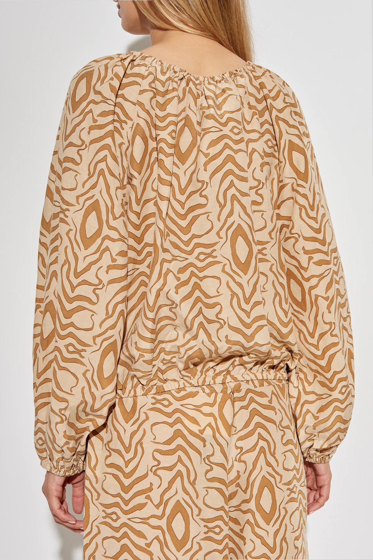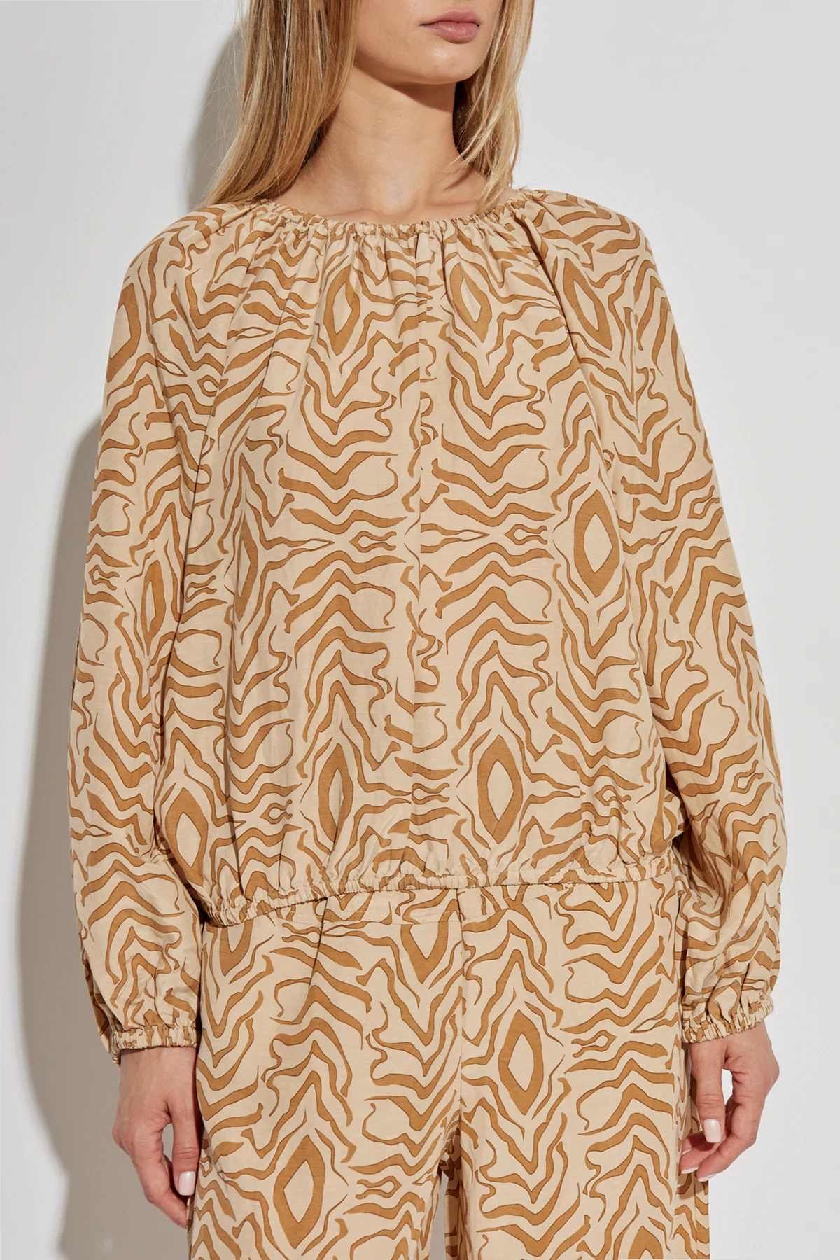 Die Form des Tops wird durch breite, lange Ärmel mit elastischen Bündchen und elastische Raffung am Saum betont, die eine ideale Passform zur Silhouette gewährleistet. Der runde, geraffte Ausschnitt verleiht ihm subtile Eleganz und Leichtigkeit, wodurch es sowohl für den Alltag als auch für formellere Anlässe eine ausgezeichnete Wahl ist.