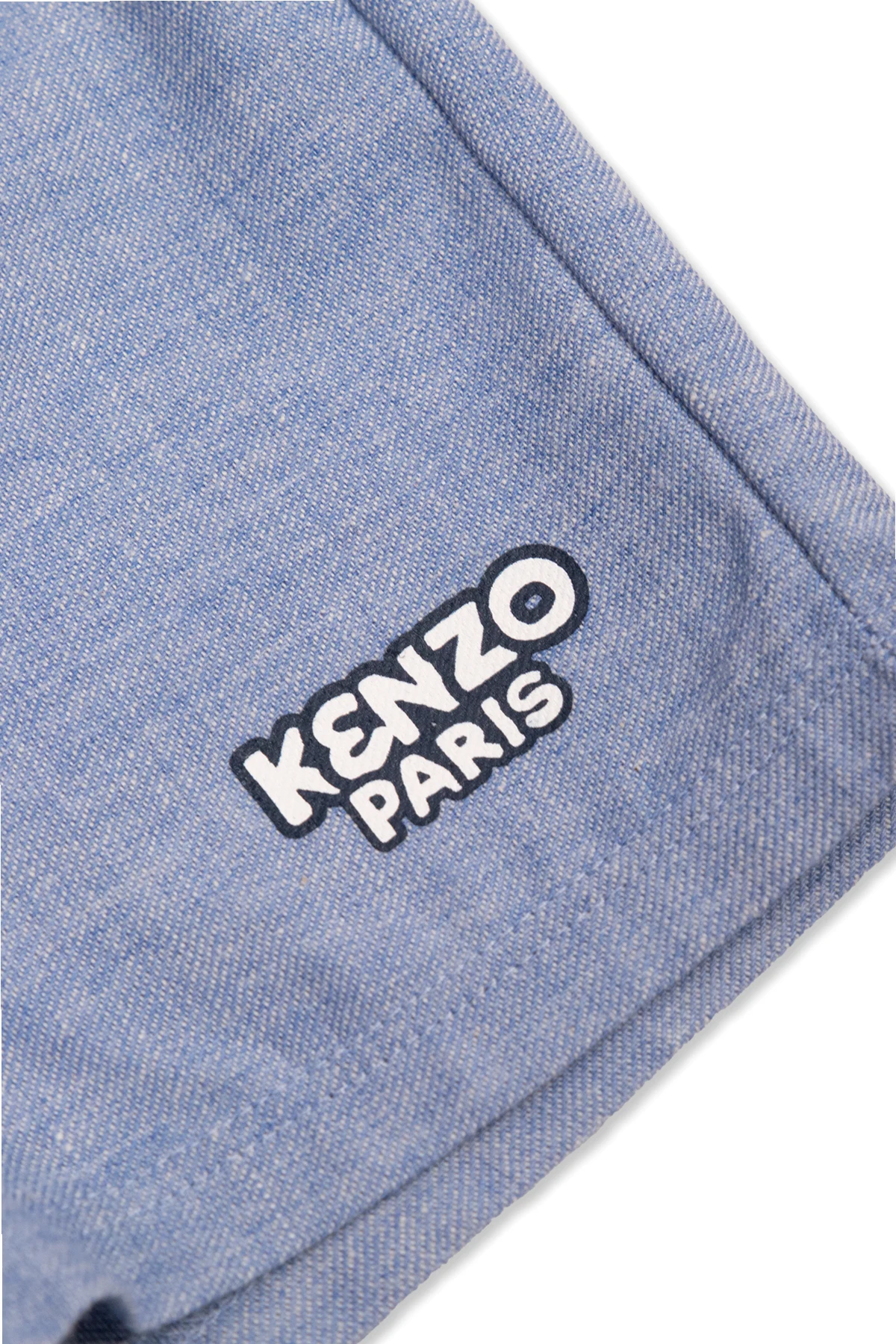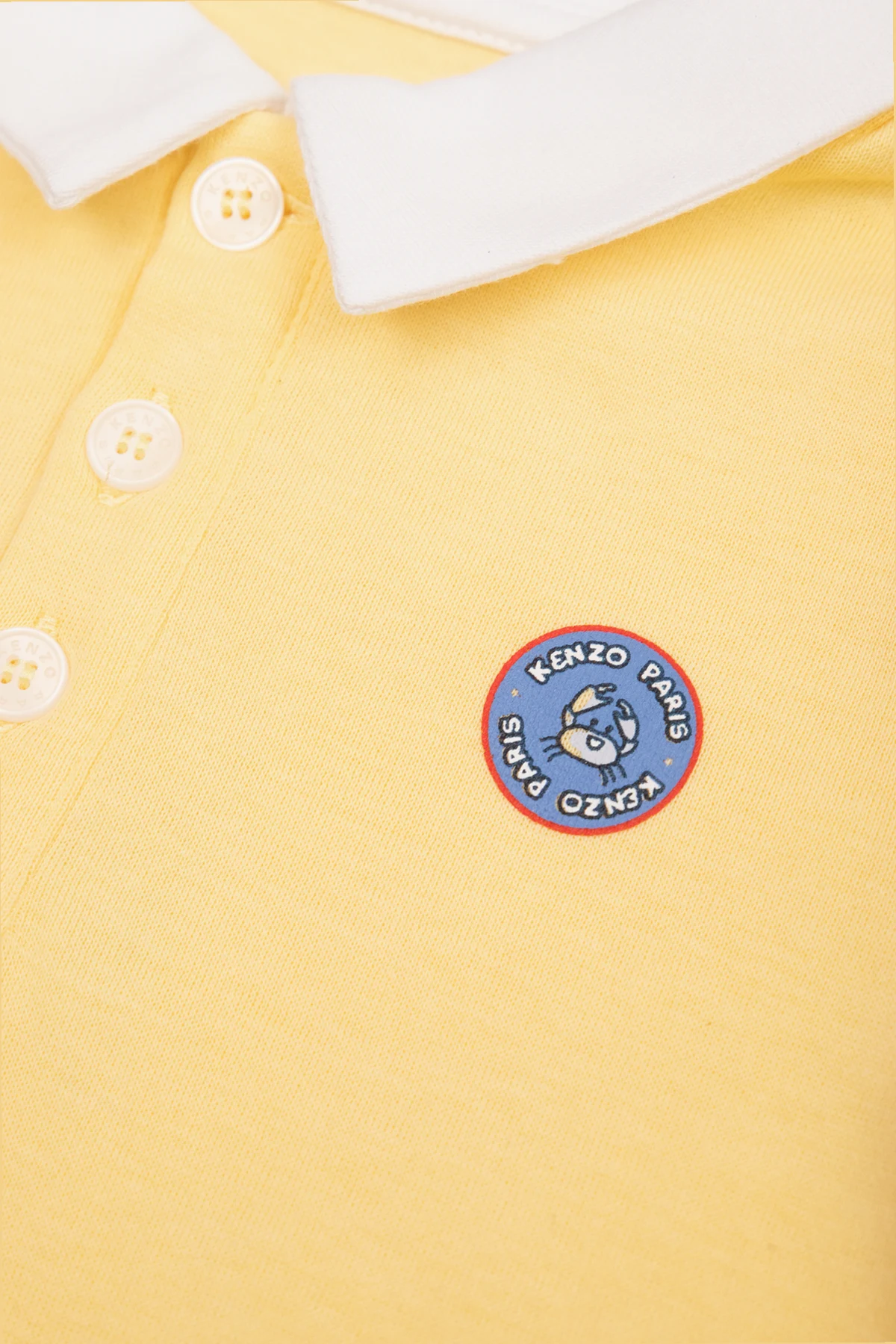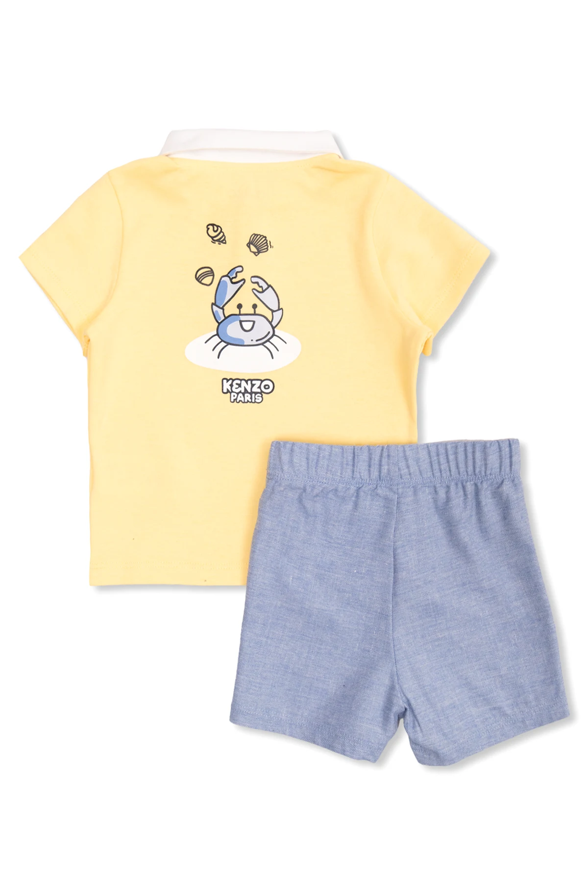 Yellow and blue set including a polo shirt and shorts from Kenzo Kids. The cotton polo shirt features short sleeves, a snap-fastened collar, multicolored logo, shell and crab motif. The shorts crafted from a linen blend are complete with an elastic waistband and a white logo print.