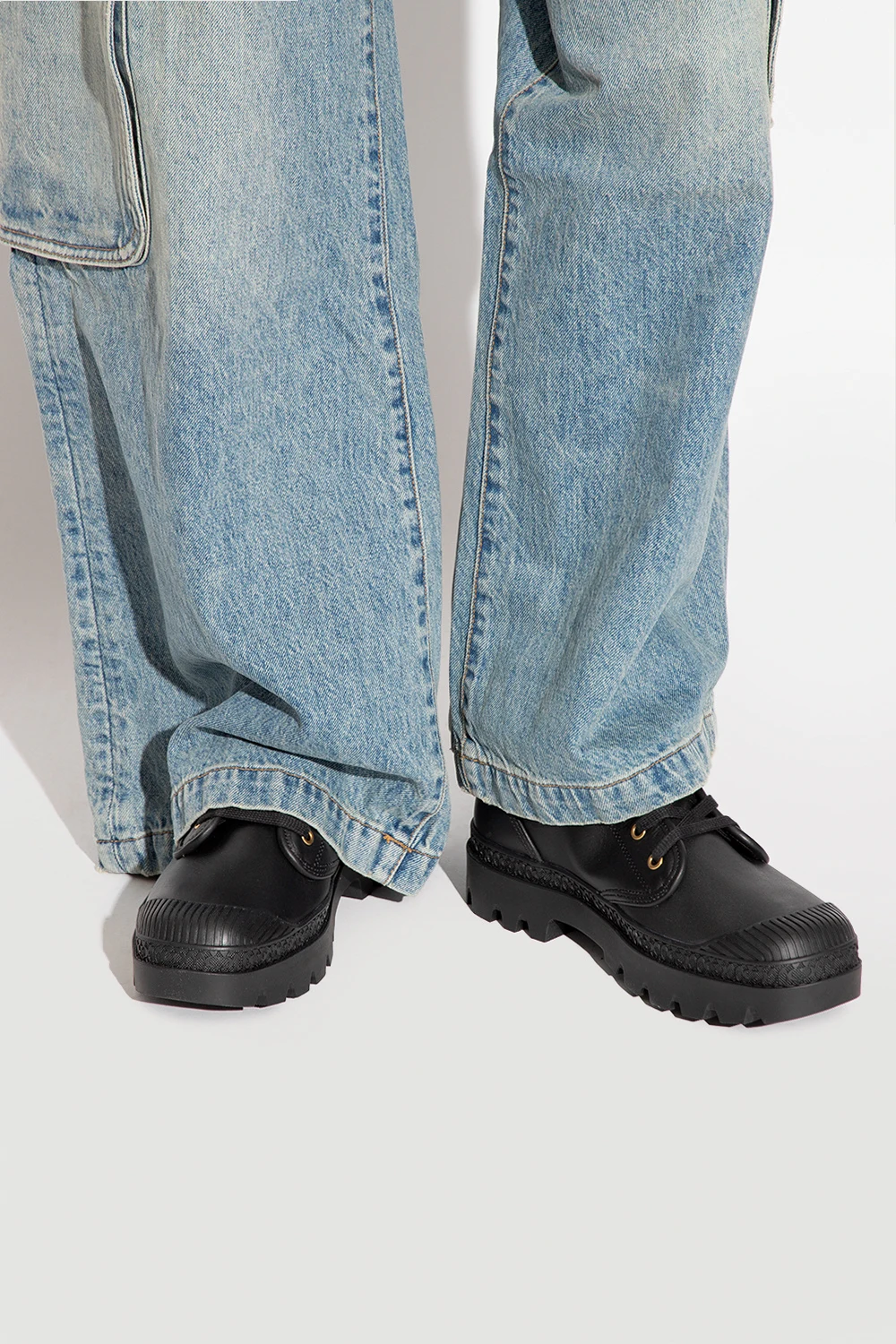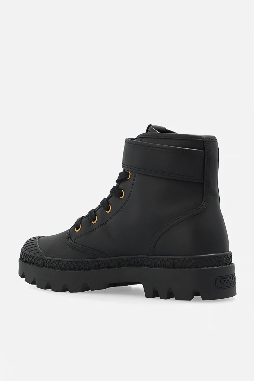 Black ‘Trooper’ boots from Coach. Made of leather, this lace-up pair features and adjustable buckle strap, logo patches, rubber toe guard and black rubber sole with a raised logo pattern.