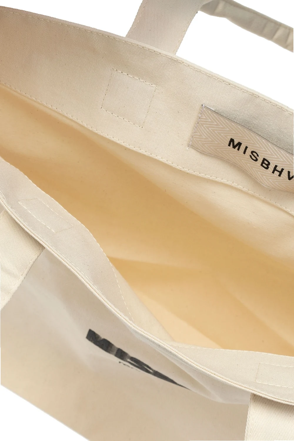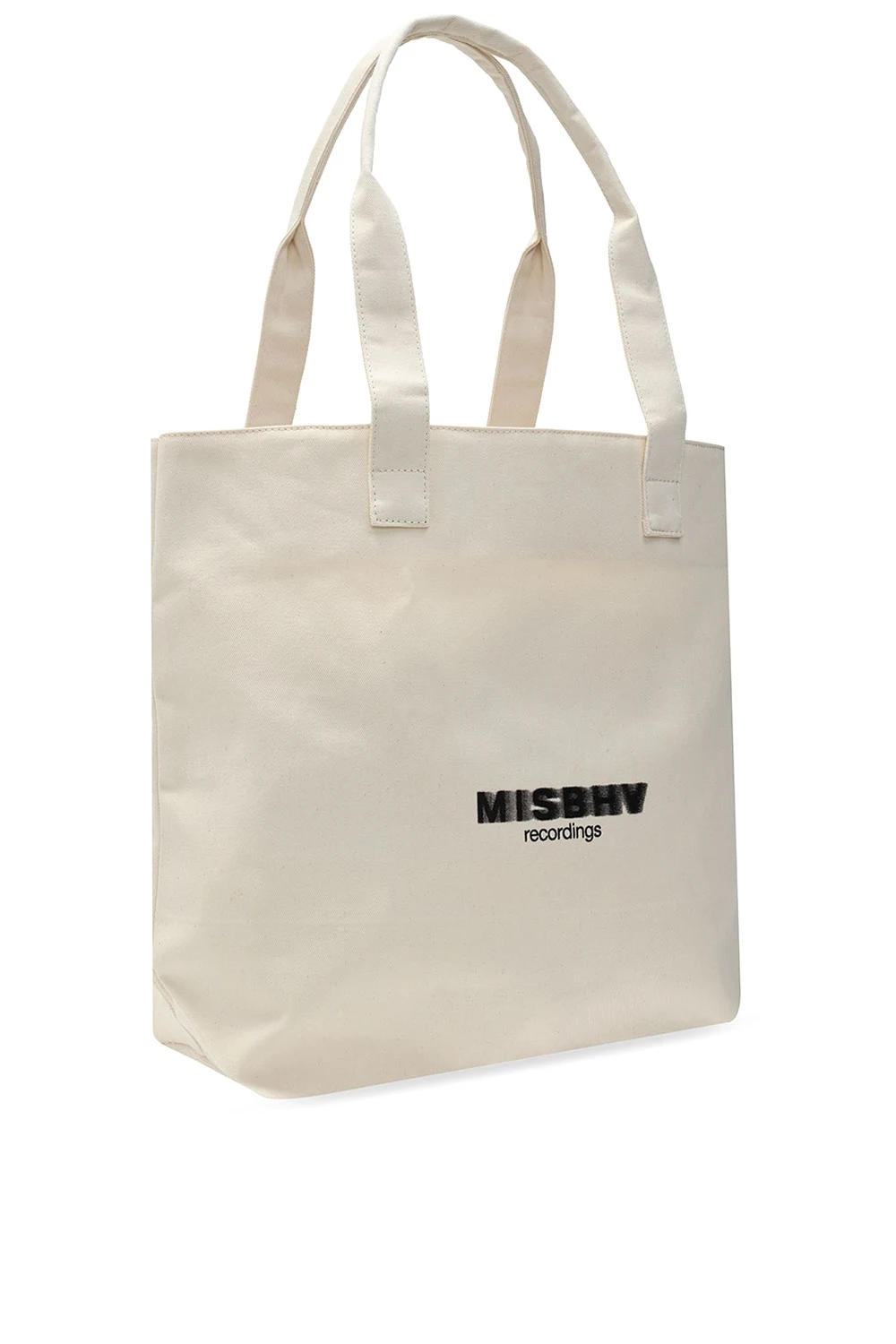 Cream ‘Recordings’ shopper bag from MISBHV. Boasting a black and grey logo print, this cotton-crafted design employs two half-round handles and one internal compartment.