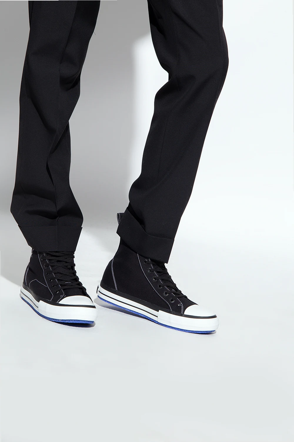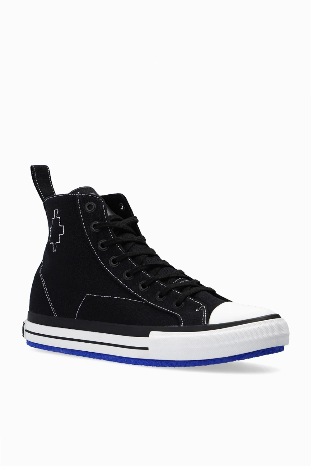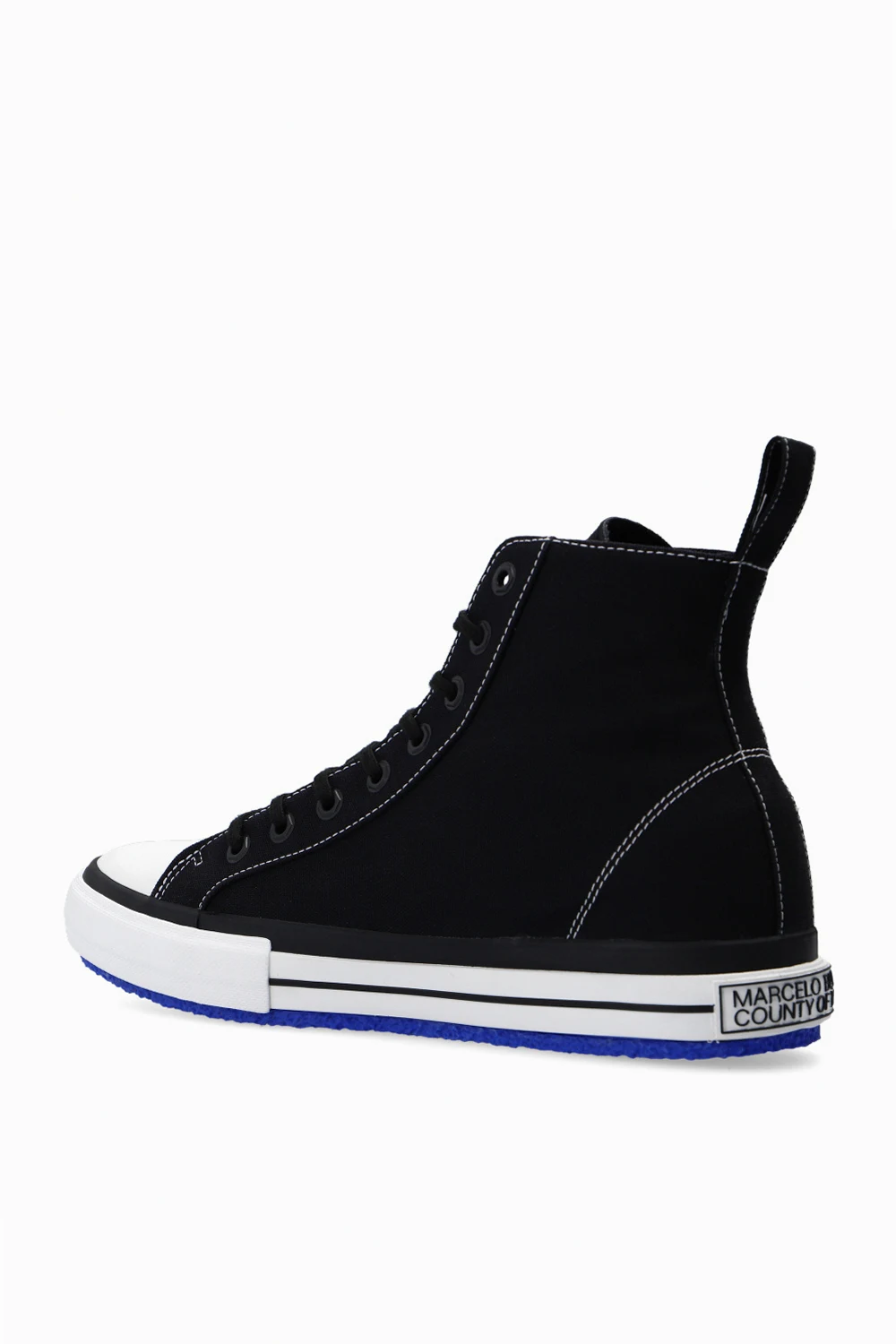 Black and white sneakers from Marcelo Burlon. Crafted from cotton, this lace-up model sits on a blue and white rubber sole and features a high-top silhouette, white logo embroidery on the front and a raised logo on the back.