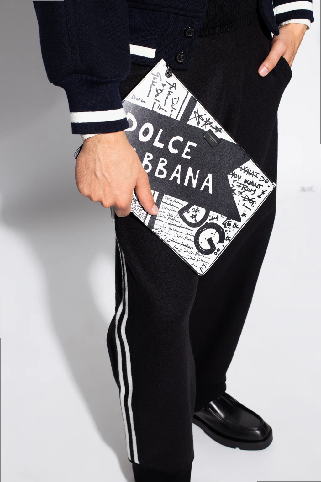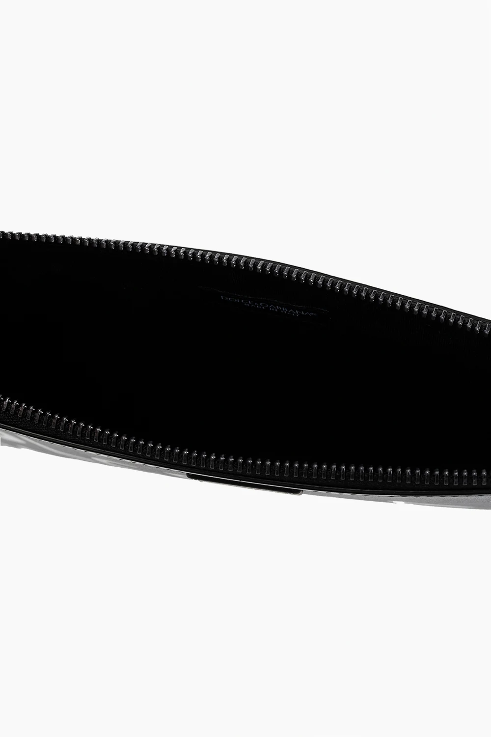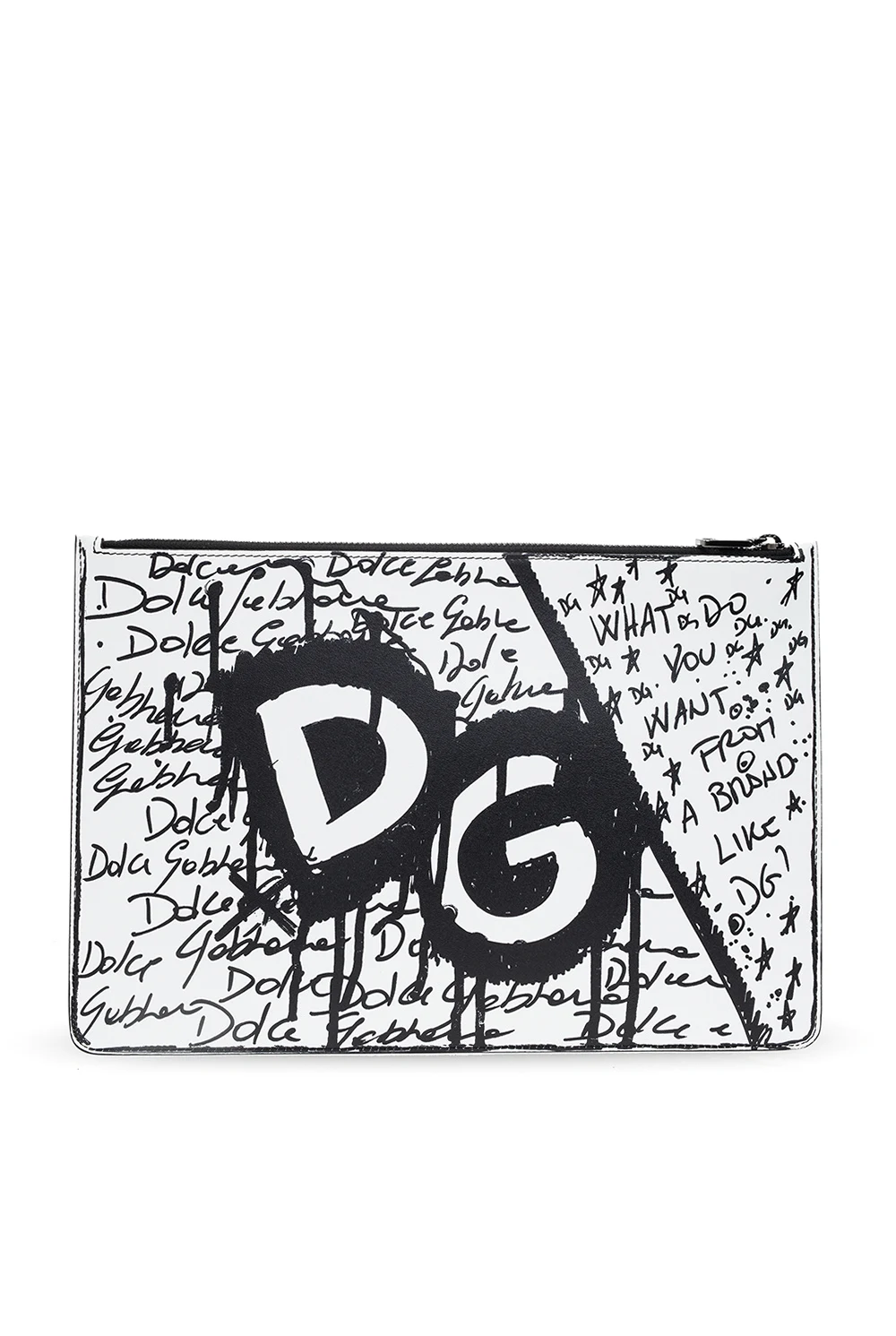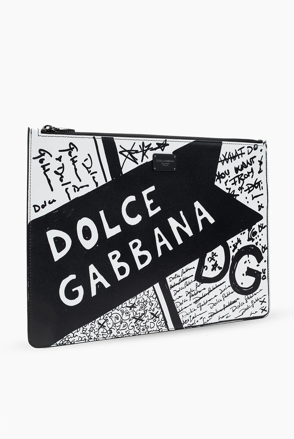 Black and white clutch bag from Dolce & Gabbana. Crafted from calf leather, this model features a zip fastening, logo print, one internal compartment and grey metal hardware.