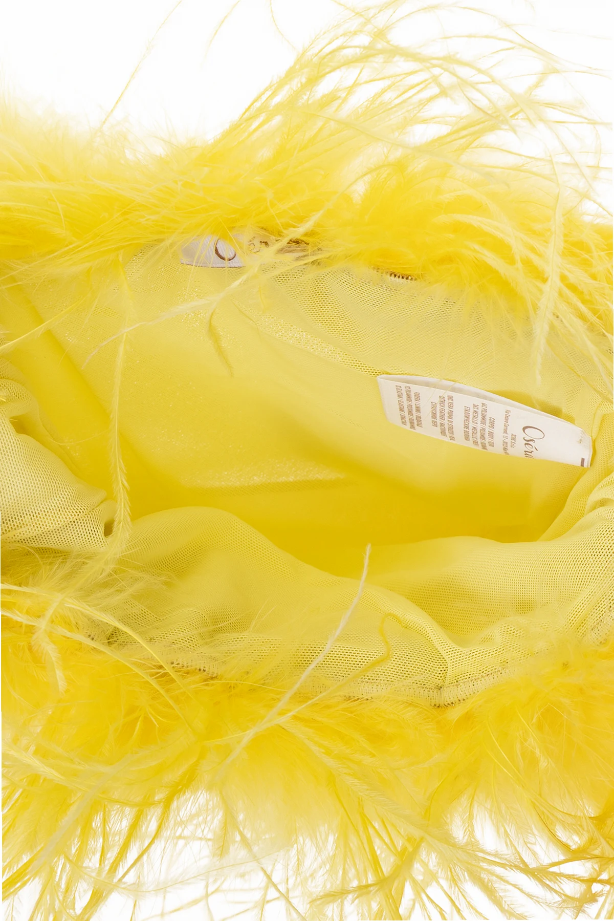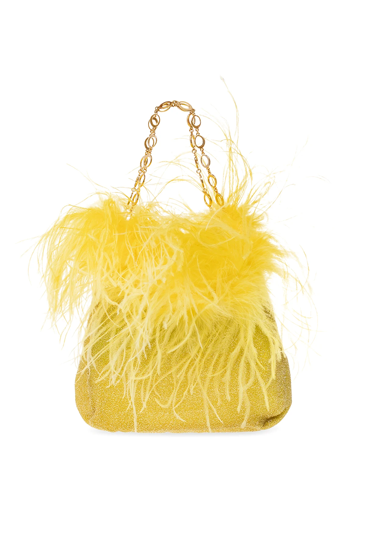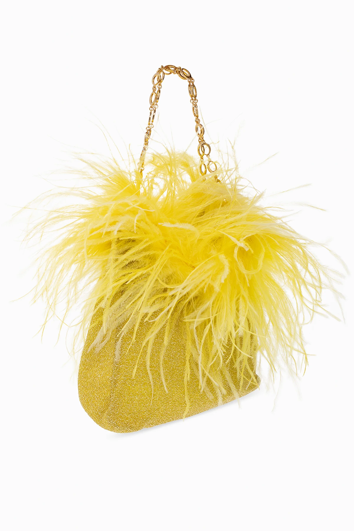 Yellow ‘Lumiere Mini’ handbag from Oseree. Inlaid with lurex threads and ostrich feathers, this model features two half-round chain handles with a logo motif, one internal compartment and gold-tone metal hardware.