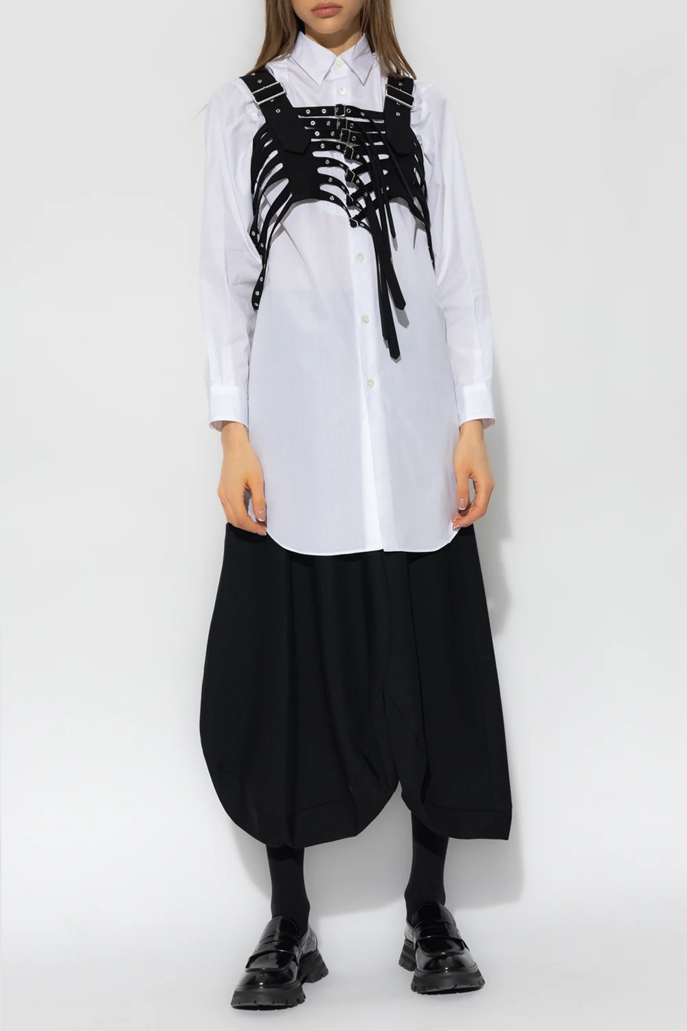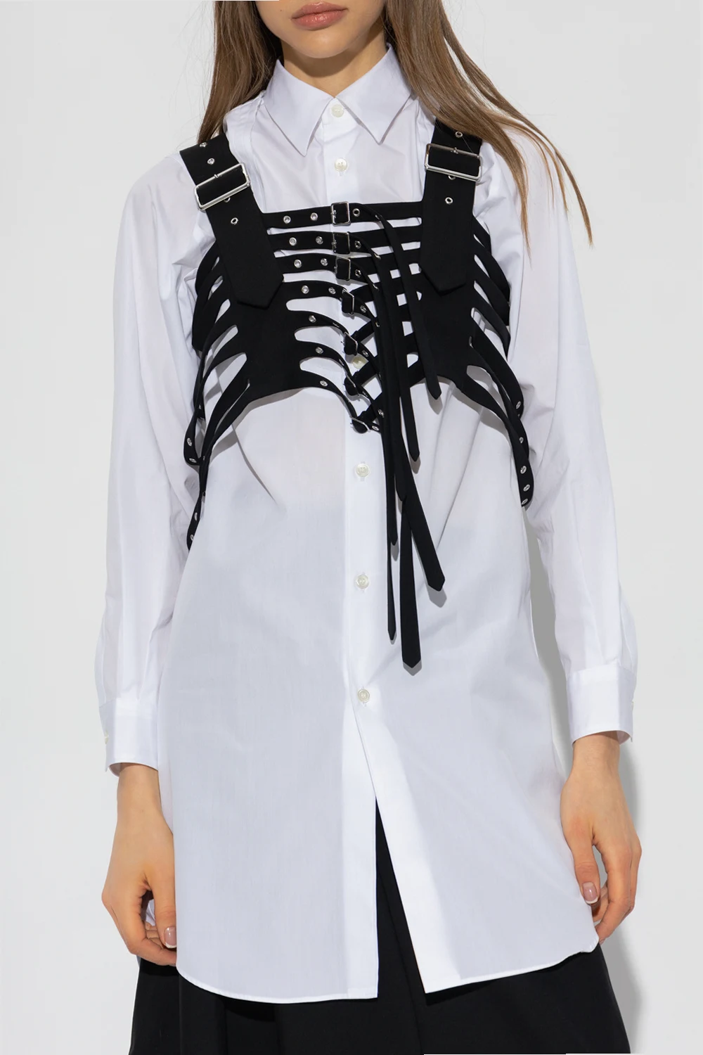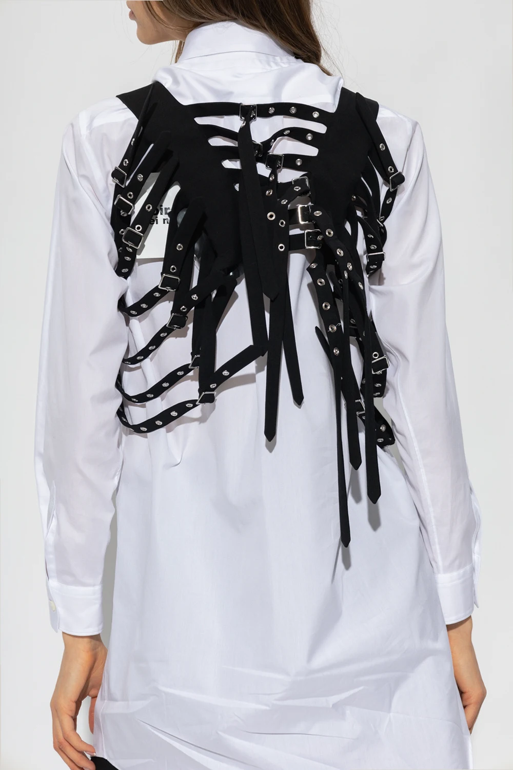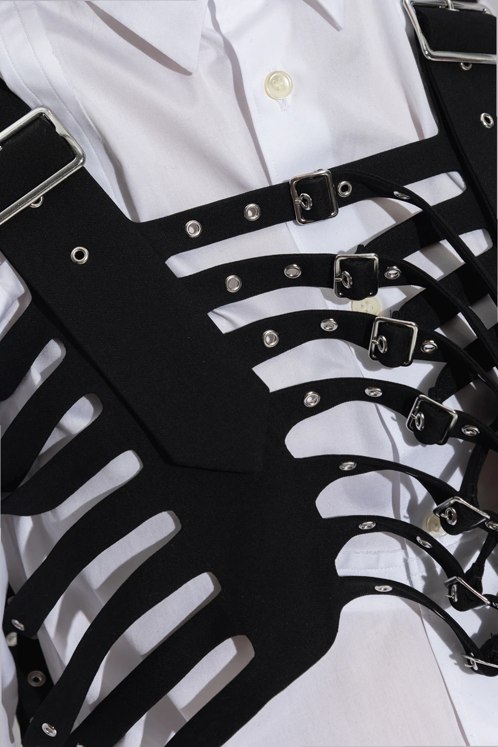 Black top from Comme des Garcons Ninomiya. Made of wool, this garment features straps with silver-tone buckles.