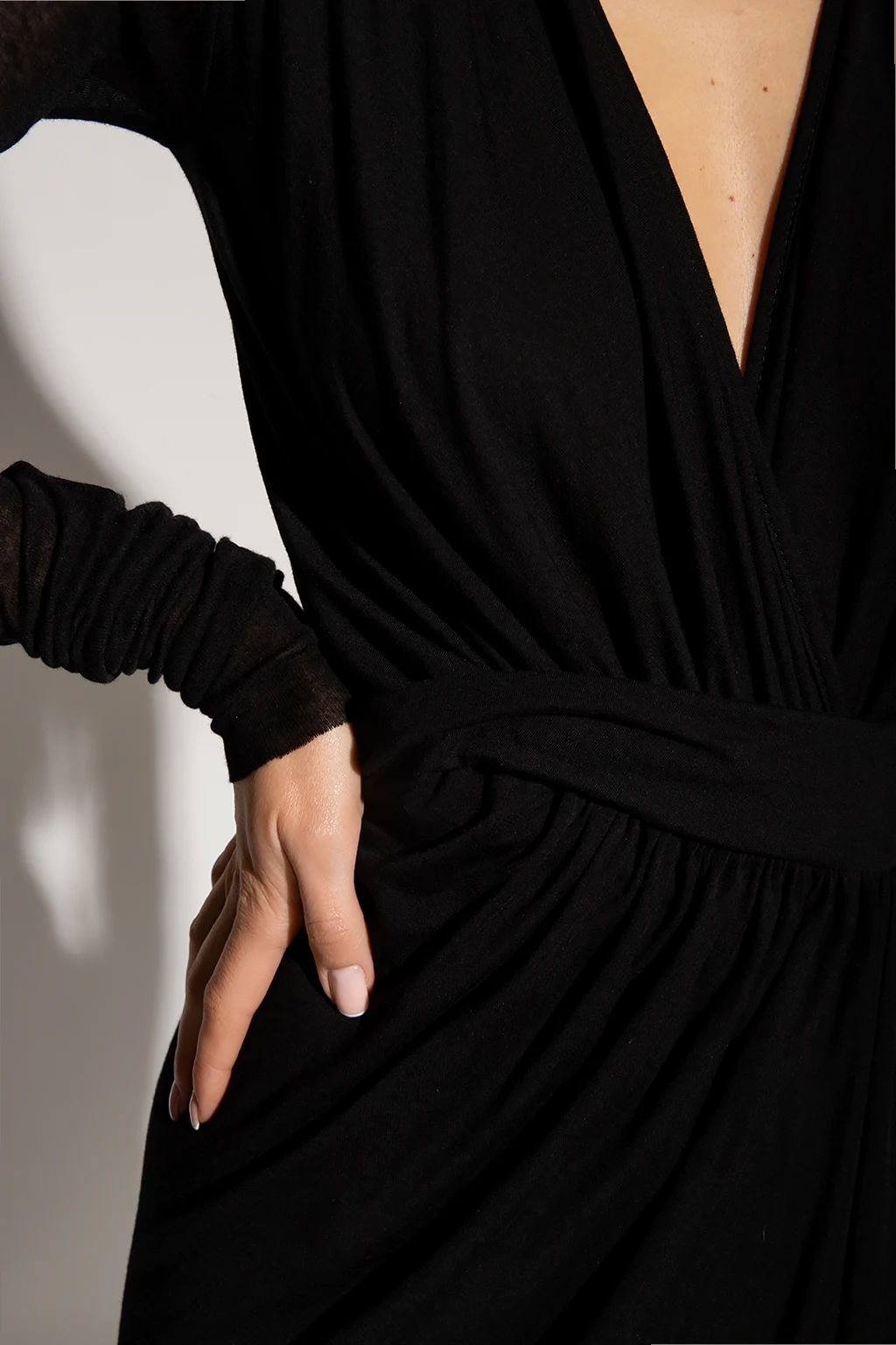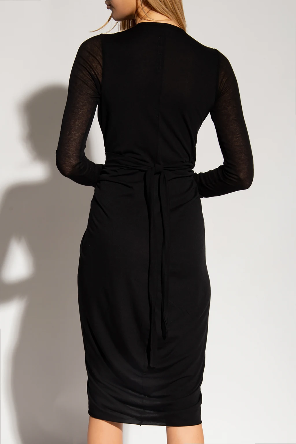 Black asymmetric dress from Rick Owens Lilies. This long sleeve design features decorative ties at the waist and raw cut edges.