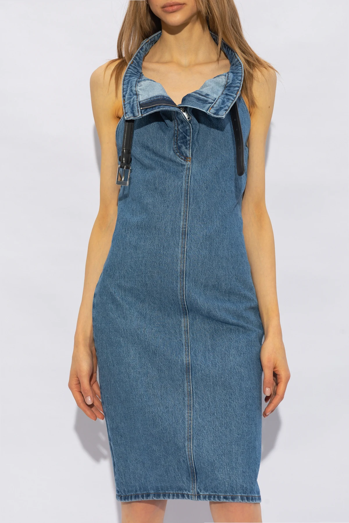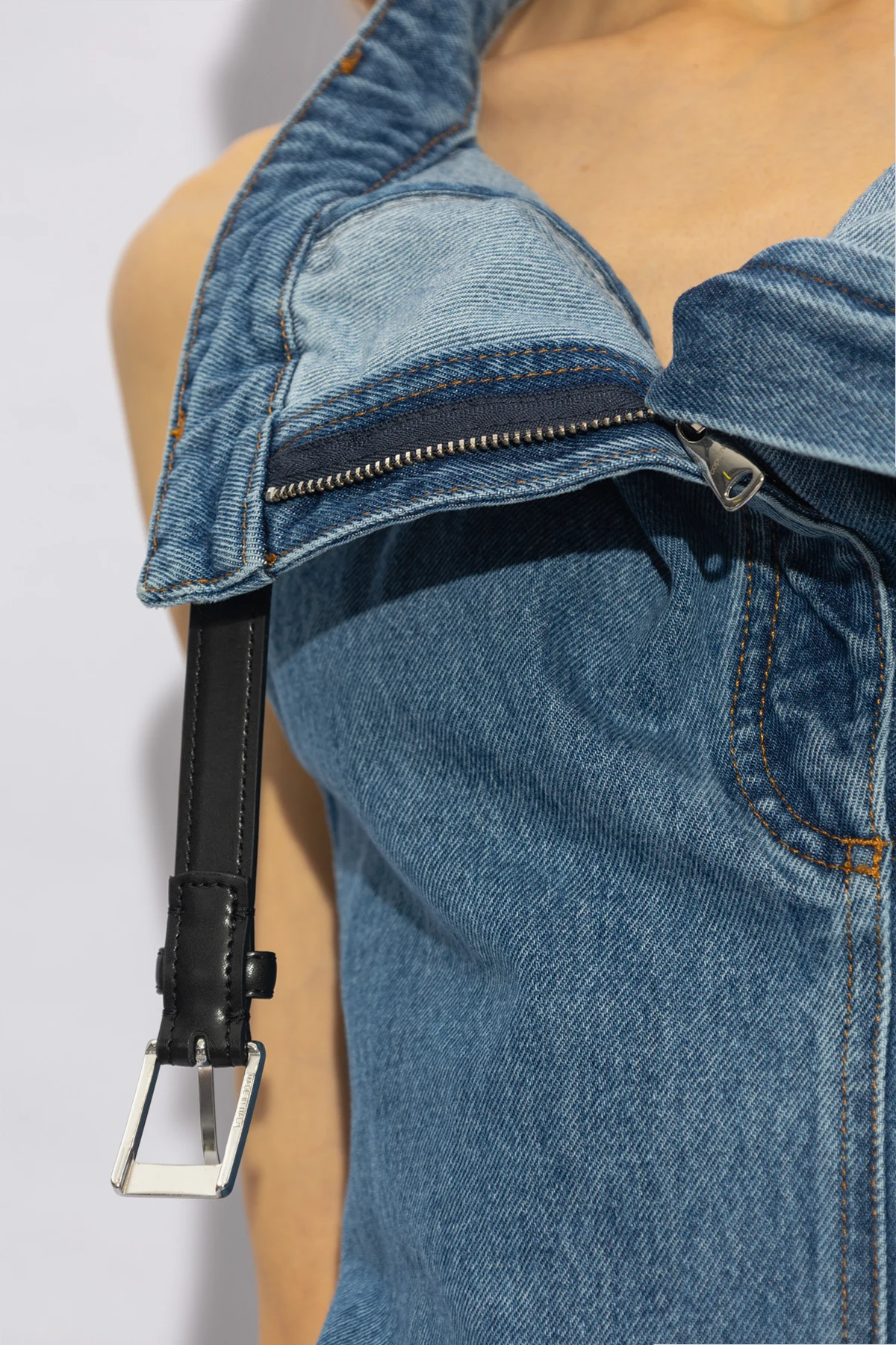 Blue dress from Coperni. Fastened with a zip, black buckle belt and hidden zip with a hook, this design features a low cut back.
