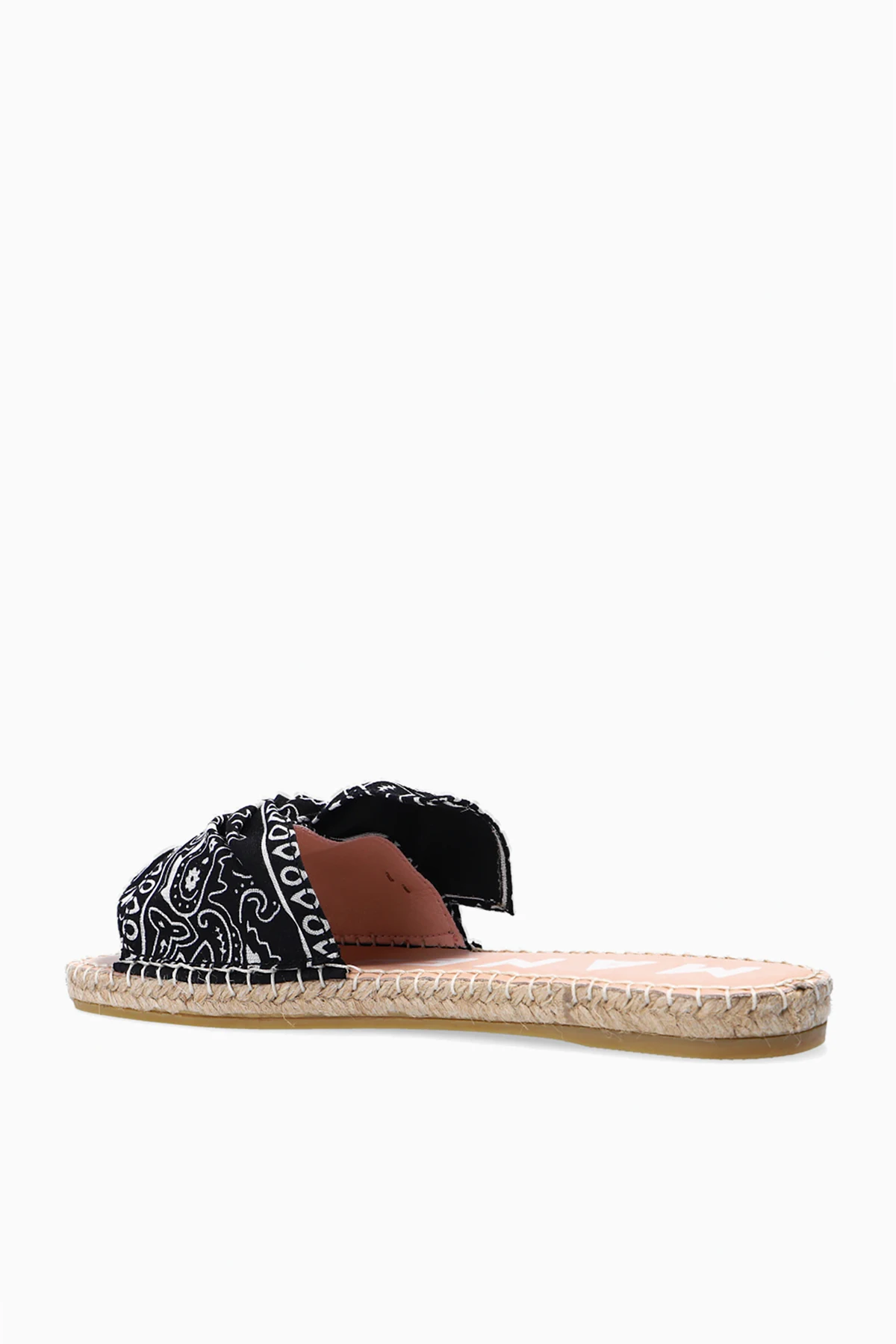 Black and white 'Bandana' slides from Manebi. Illustrated with a pattern, this cotton-crafted pair sits on a beige rubber sole and features a bow and a platform trimmed in natural jute in beige. This product is 100% vegan.