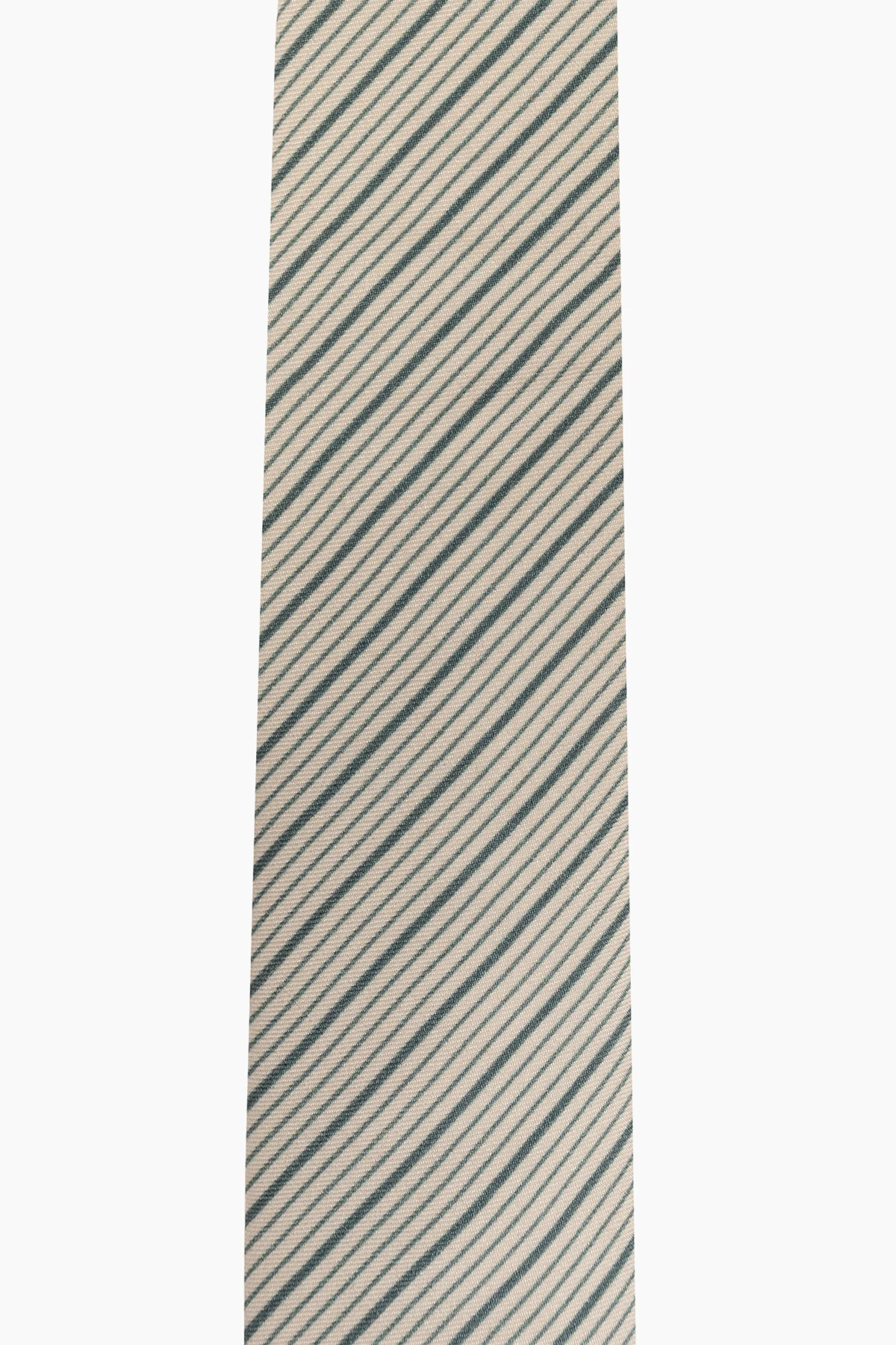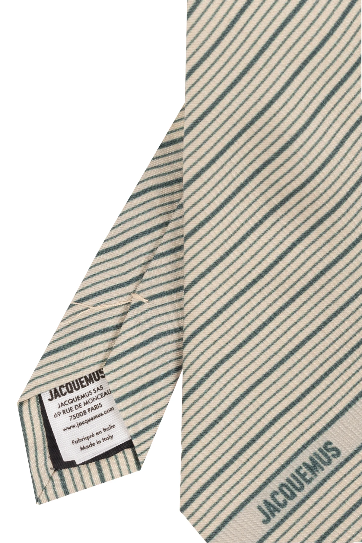 Green and cream tie from Jacquemus. Made from a silk and virgin wool blend, this item showcases a diagonal stripe pattern accompanied by the brand's logo.