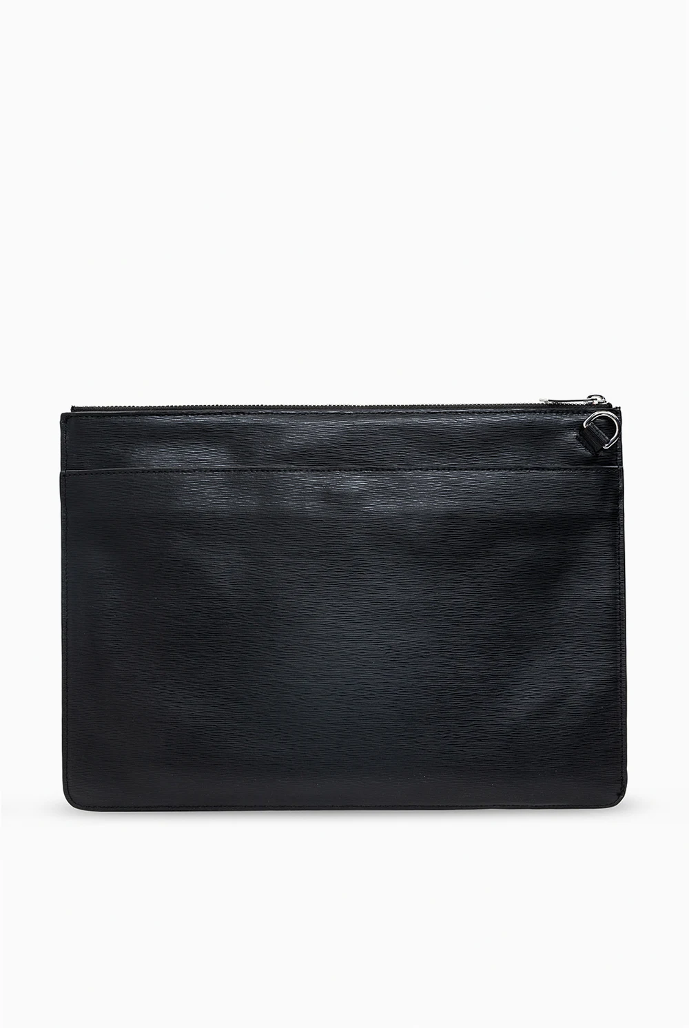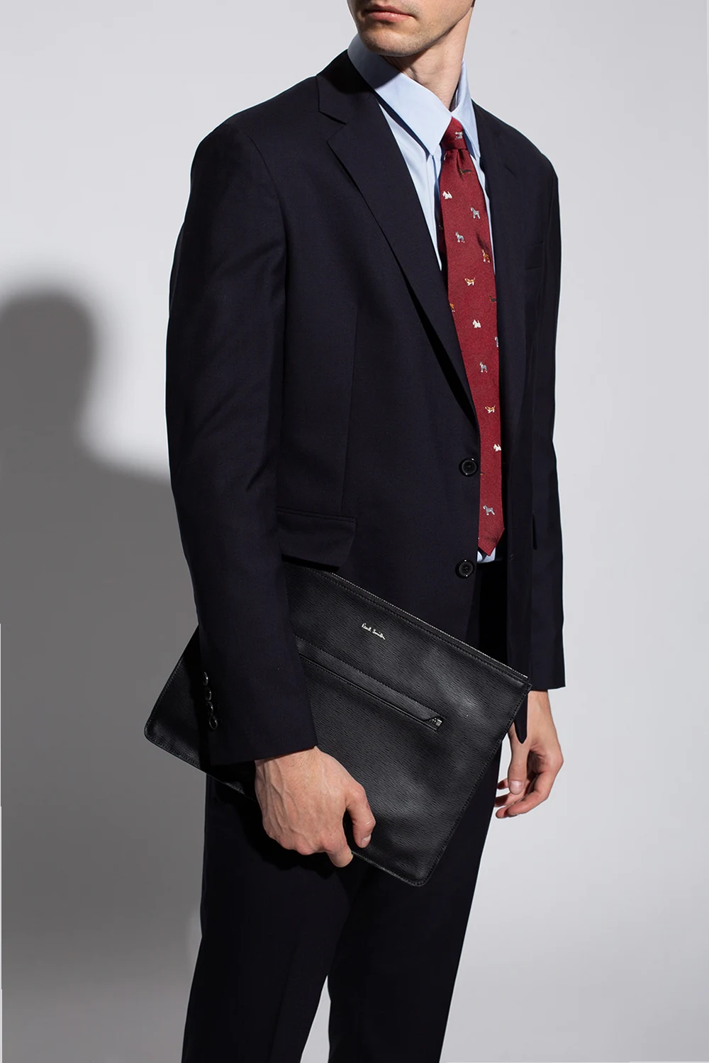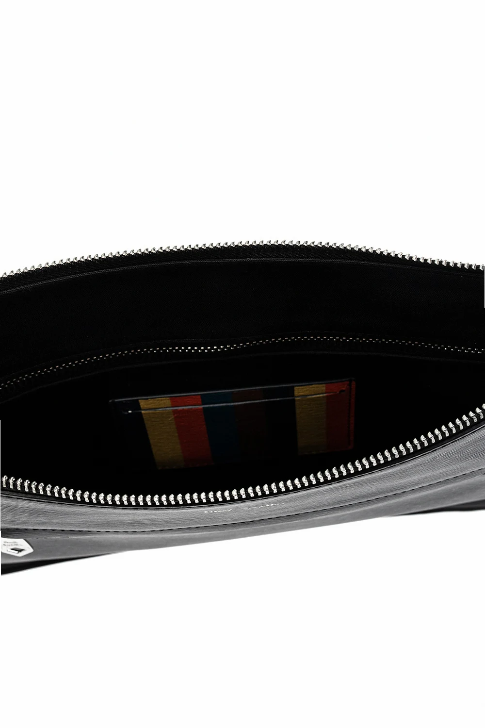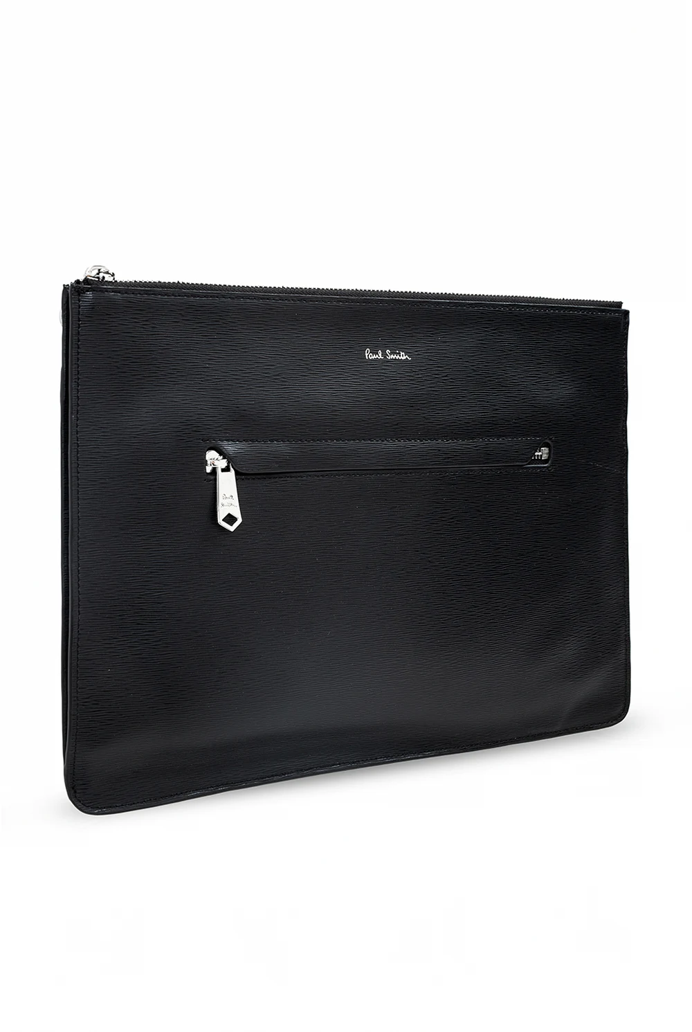 Black hand bag from Paul Smith. Made of calf leather, this design fastens a zip fastening and is decorated with printed logo pattern in silver-tone. It is complete with a front zip pocket, snap-fastened back pocket, silver-tone metal hardware and two internal slip pockets with one zip pocket and one card slot.