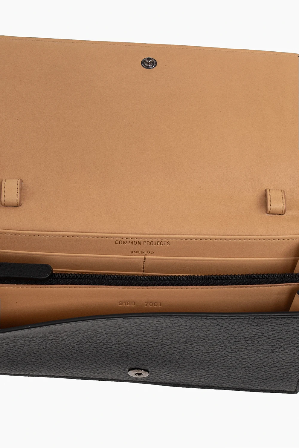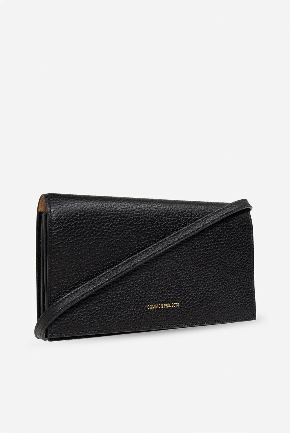 Black shoulder bag from Common Projects. Crafted from grained leather, this design secures with a snap and showcases a printed gold-tone logo, a detachable and adjustable shoulder strap, silver-tone metal hardware and two separate compartments, a zipped compartment, one slip pocket and eight card slots inside.