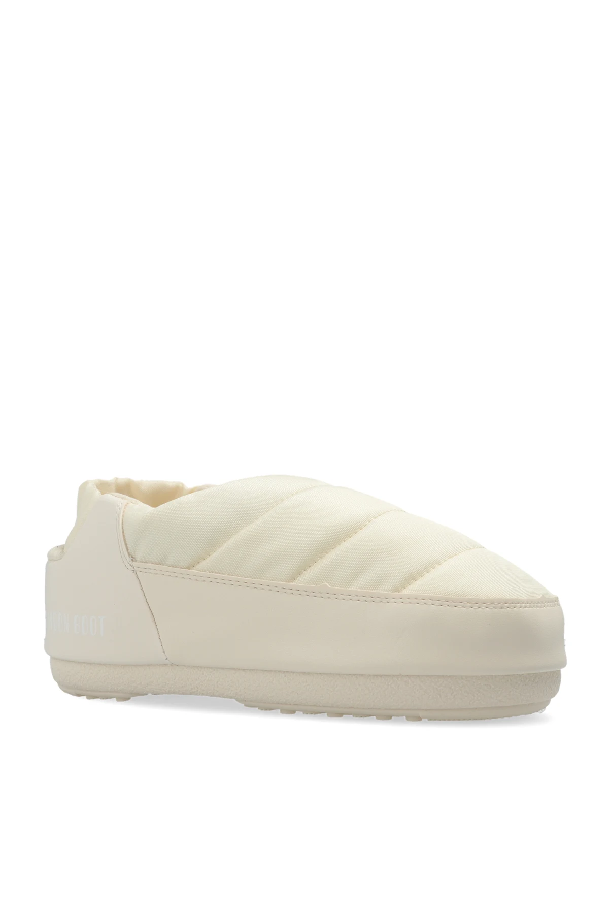 Cream ‘Band Nylon’ slip-on shoes from Moon Boot. Printed with the brand's logo in white, this model sits on a cream tread rubber sole with suction cups to ensure superb grip on any surface and features an elasticized band on the back.