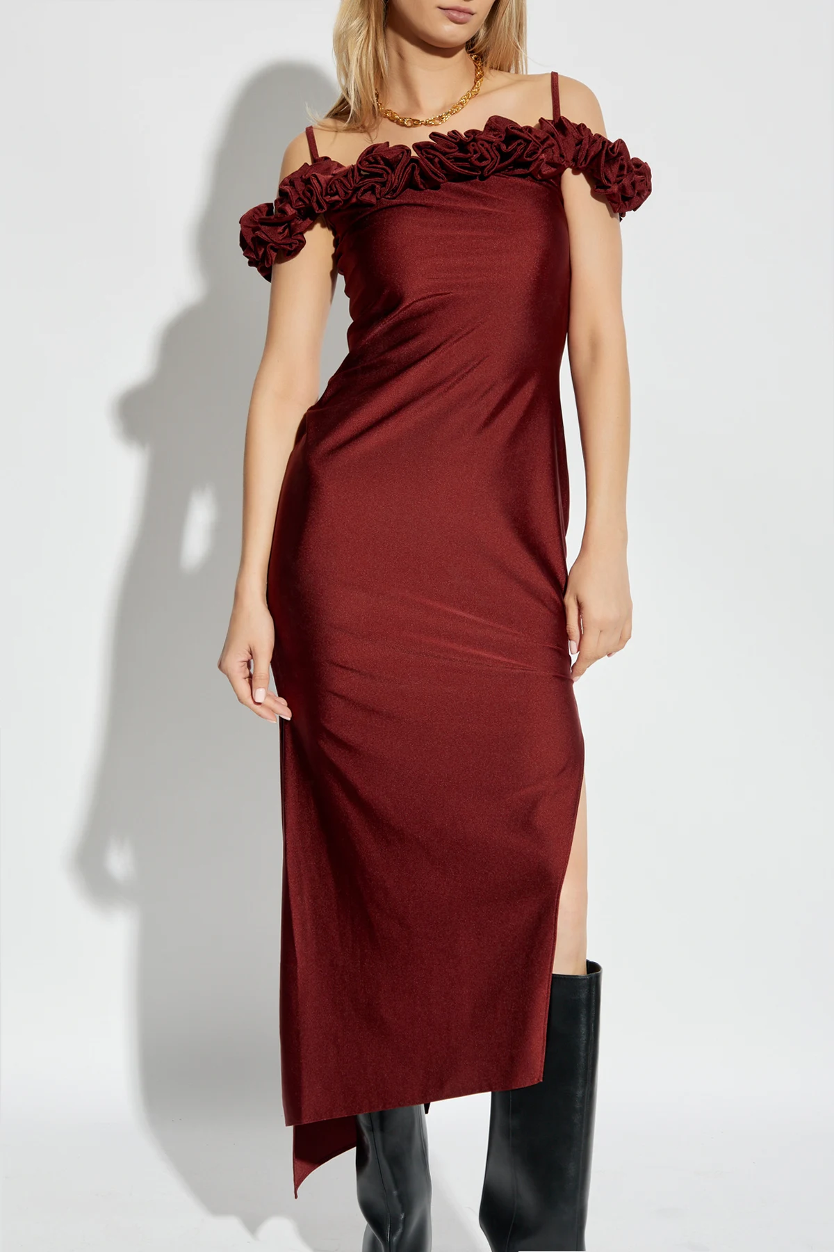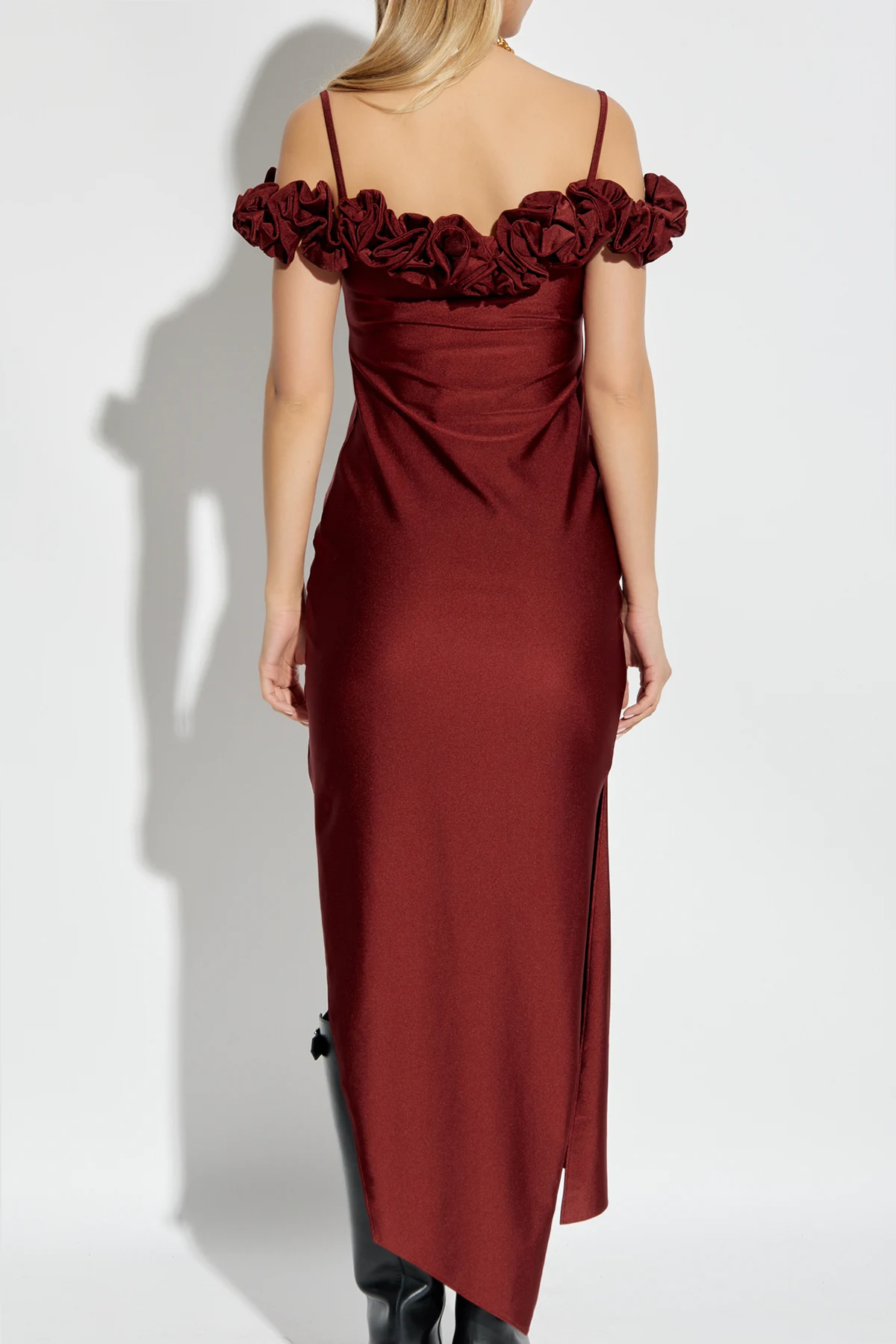 Die Einzigartigkeit dieser Kreation wird durch dünne Träger und einen reich verzierten Ausschnitt mit gerafften, floralen Applikationen unterstrichen. Der asymmetrische Abschluss des unteren Teils des Kleides verleiht dem Ganzen ein modernes und stilvolles Aussehen, ideal für Abendveranstaltungen.