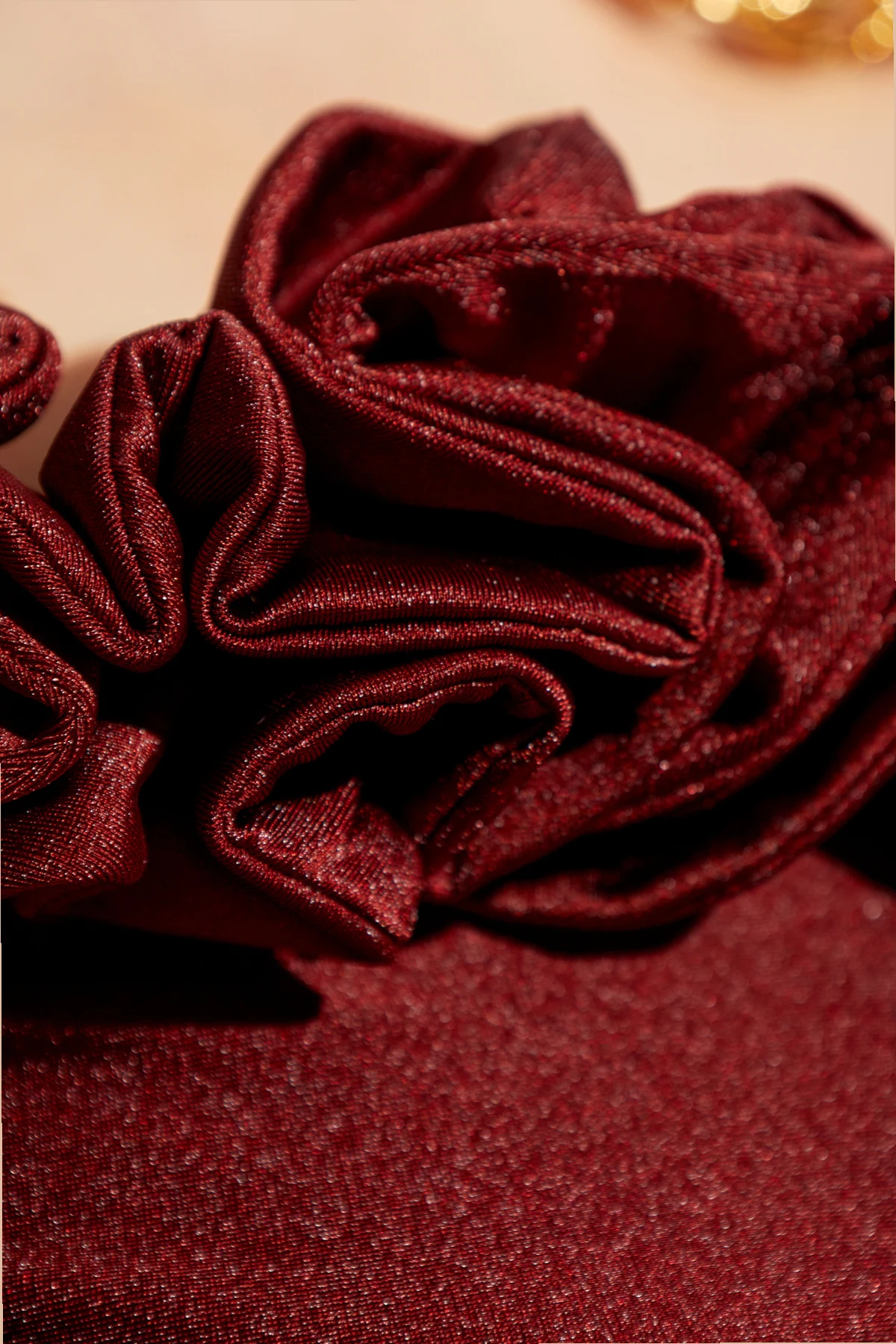 Genäht aus luxuriösem, glattem Material mit einem sanften Glanz, in tiefem Bordeauxrot, betont das Kleid die Silhouette dank seines figurbetonten Schnitts. Seine mittlere Länge, die knapp unterhalb der Knie reicht, sowie der dezente Schlitz auf der linken Seite verleihen Eleganz und Bewegungsfreiheit.