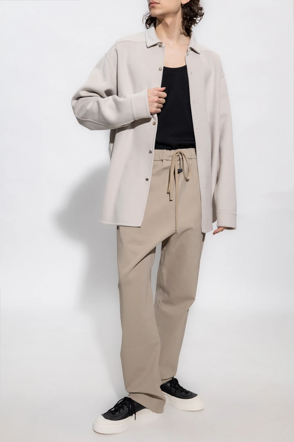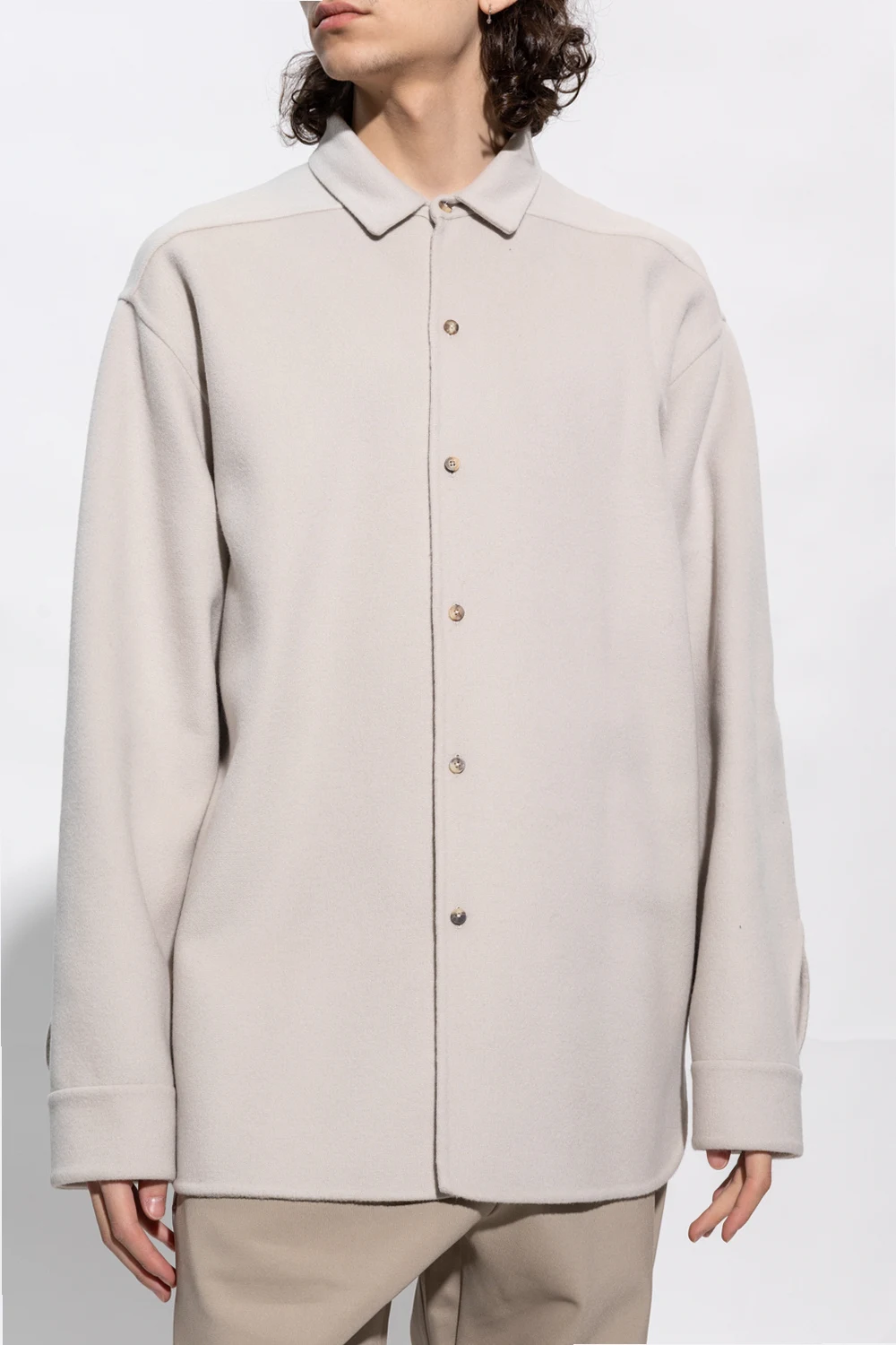 Cream shirt from Fear of God. Made of a blend of virgin wool and cashmere, this design features button fastenings, a black leather logo patch at the back and long sleeves with buttoned cuffs.
