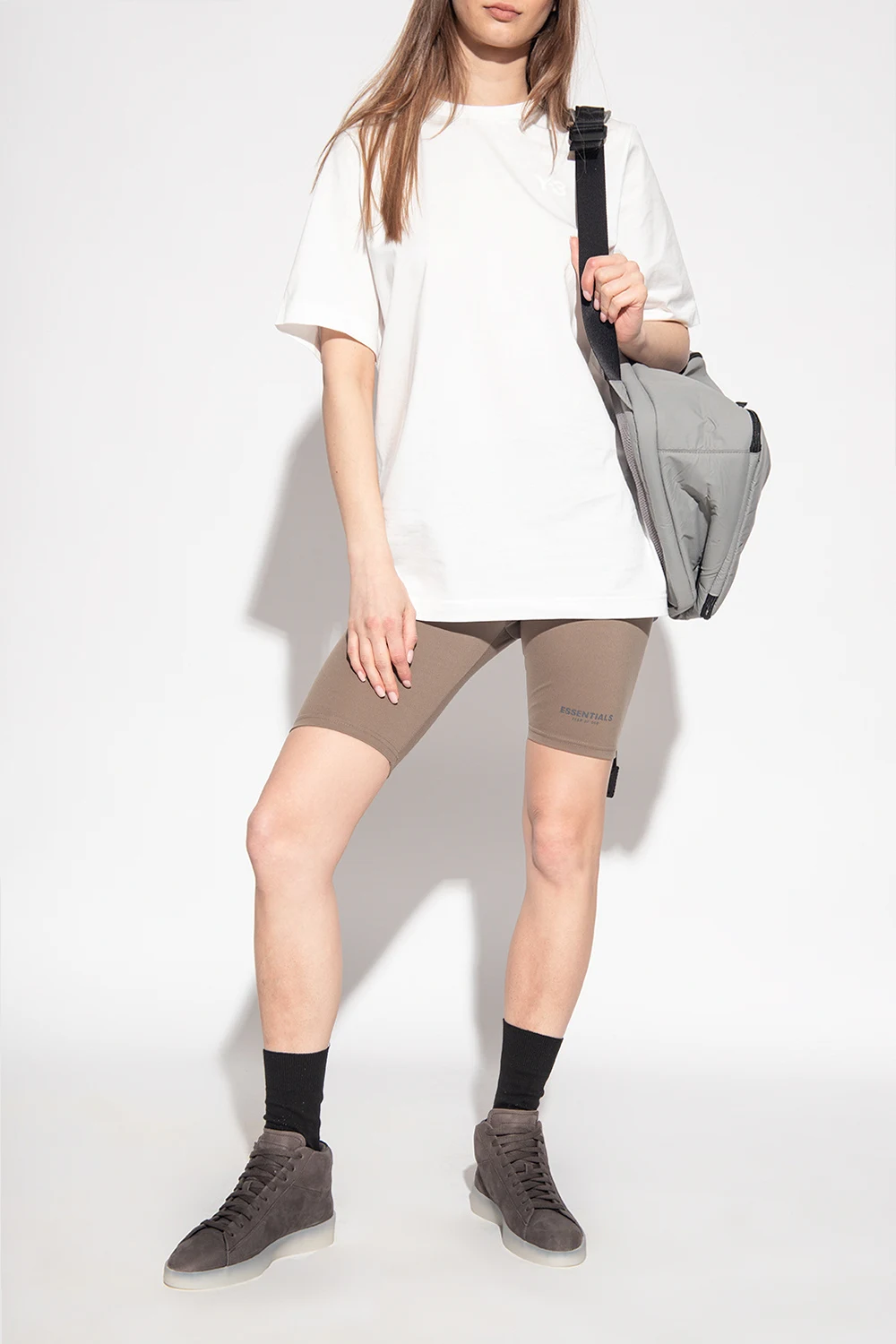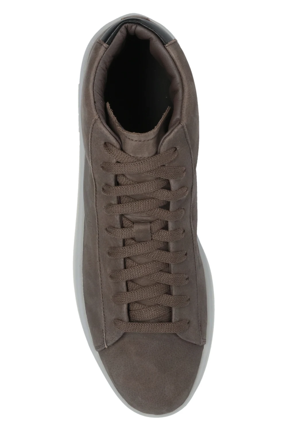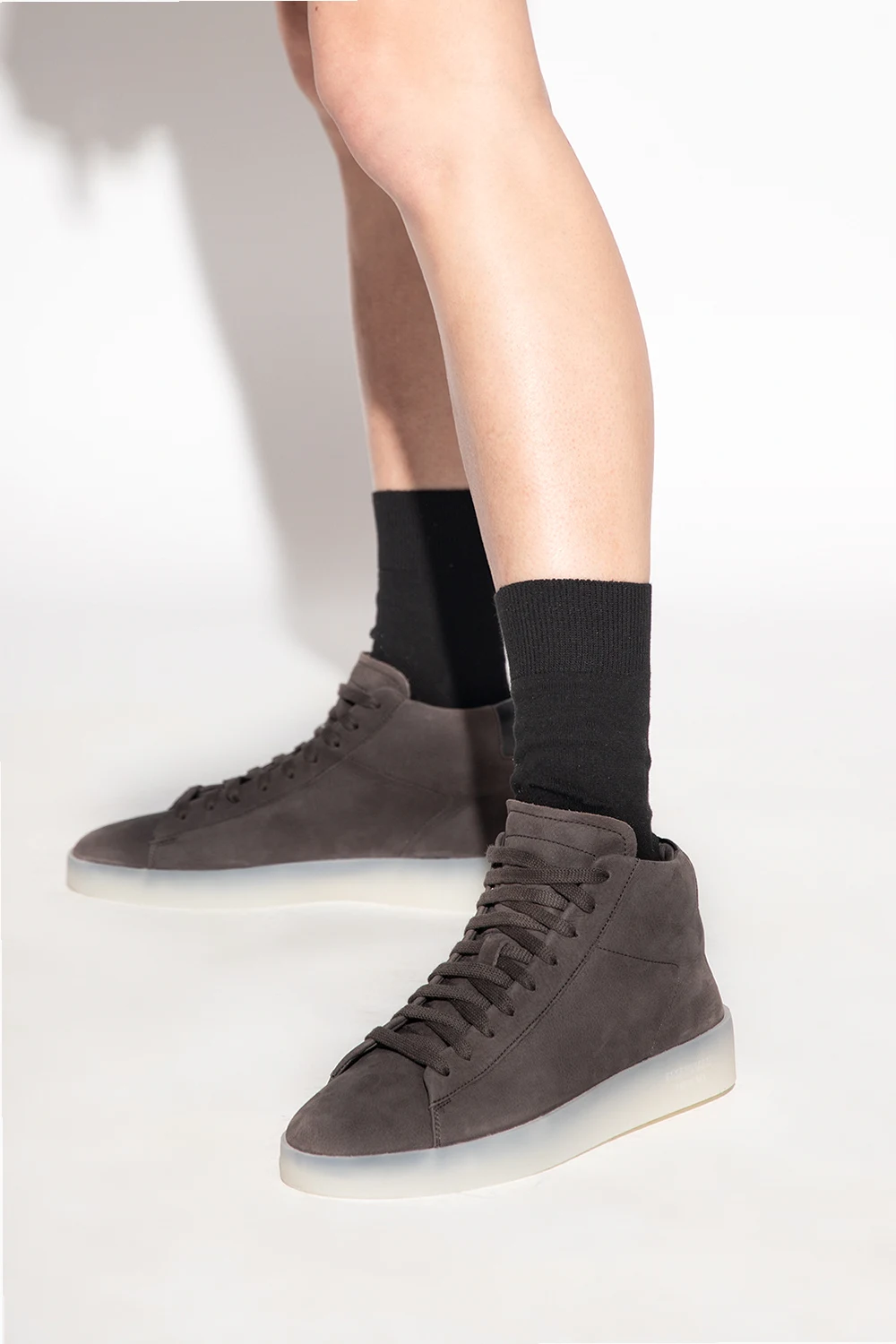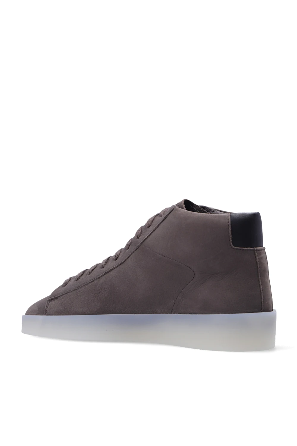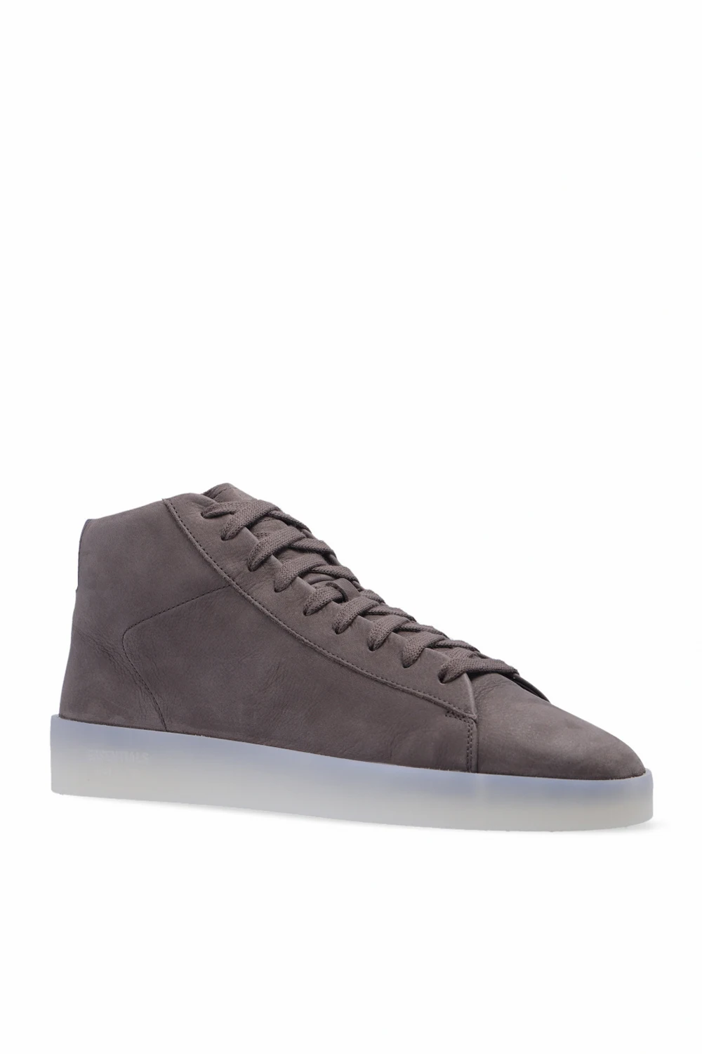 Dark greyish-brown ‘Tennis Mid’ high-top sneakers from Fear Of God Essentials. Made of nubuck, this lace-up model features a black smooth leather heel counter and a grey rubber sole accentuated with a tactile logo. Swappable shoelaces included.