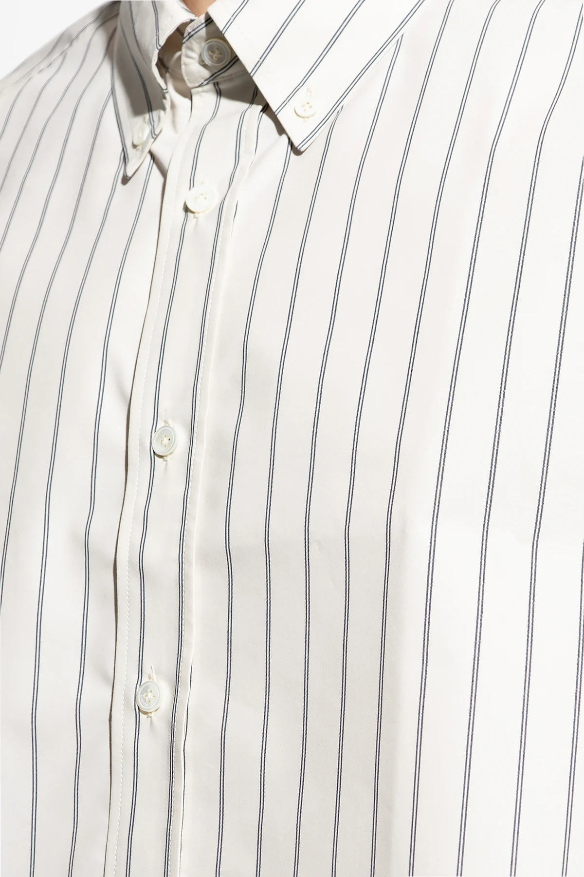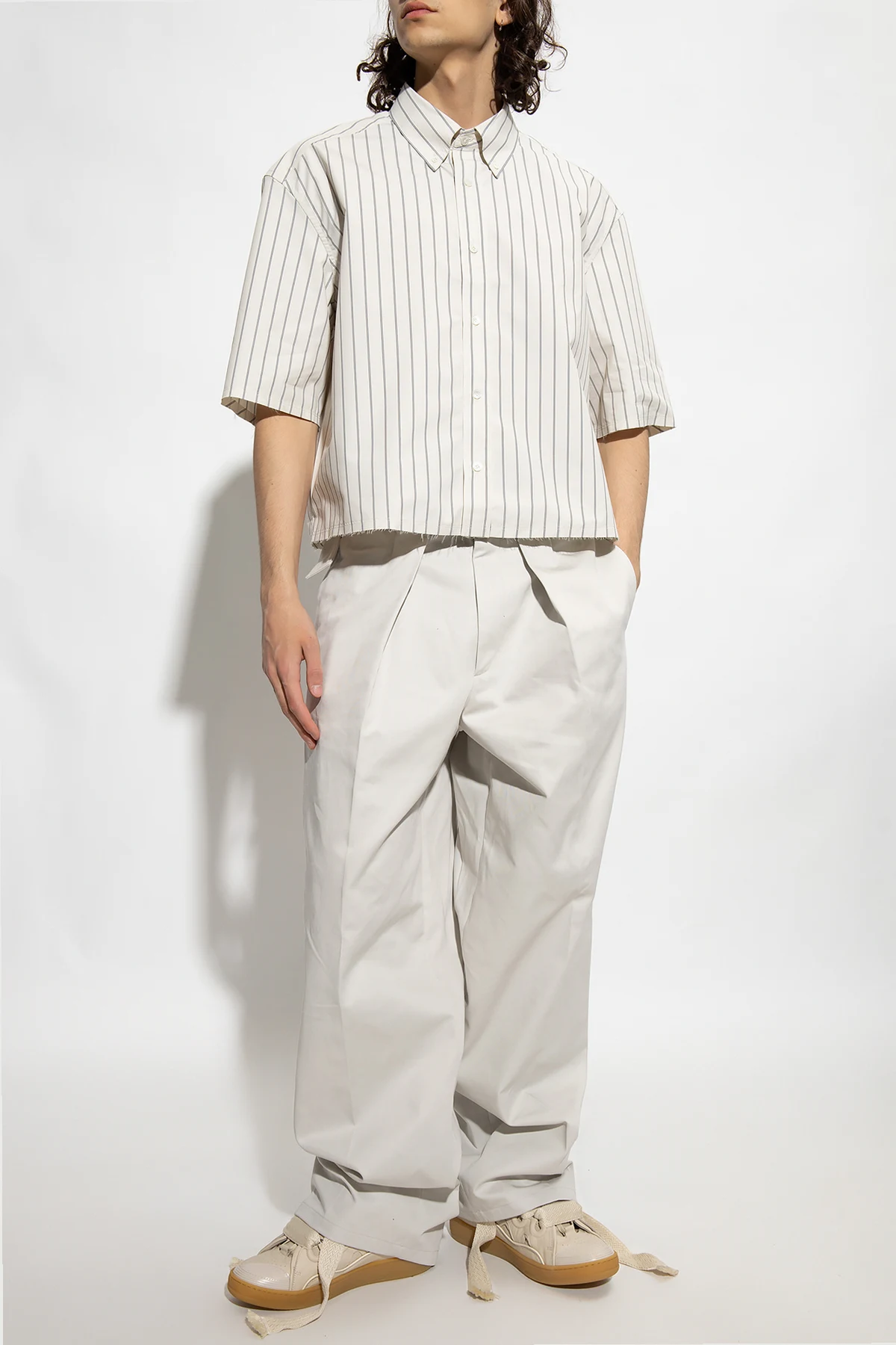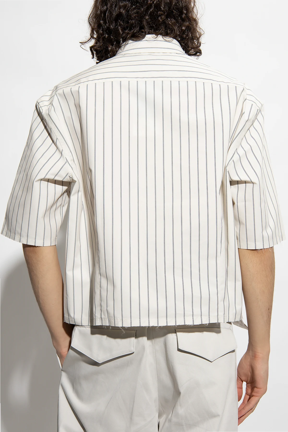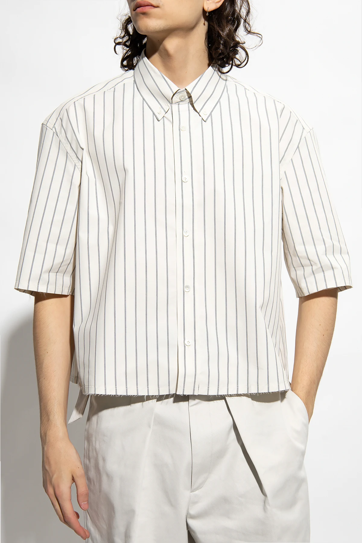 Cream loose-fitting shirt from Lanvin. Made from a cotton blend, this short sleeve design features button fastenings, dark grey pinstripes and raw-trimmed edges.
