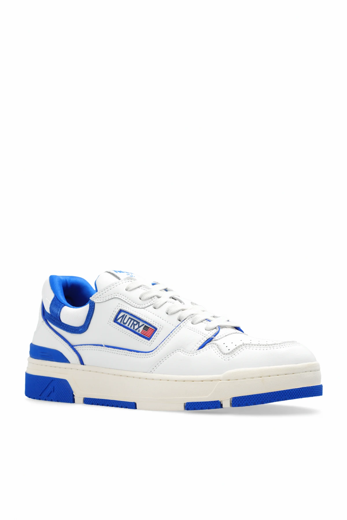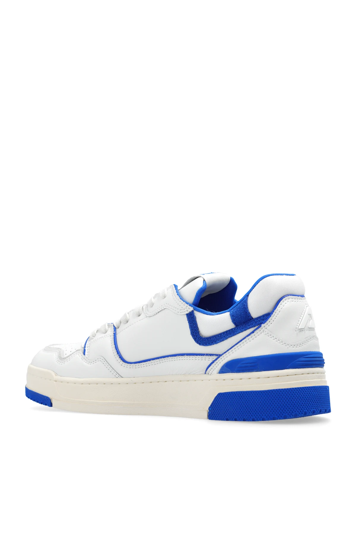 White and blue ‘ROLM’ sneakers from Autry. Made of leather and fabric, this lace-up pair features a logo, perforations and rubber sole in cream and blue.