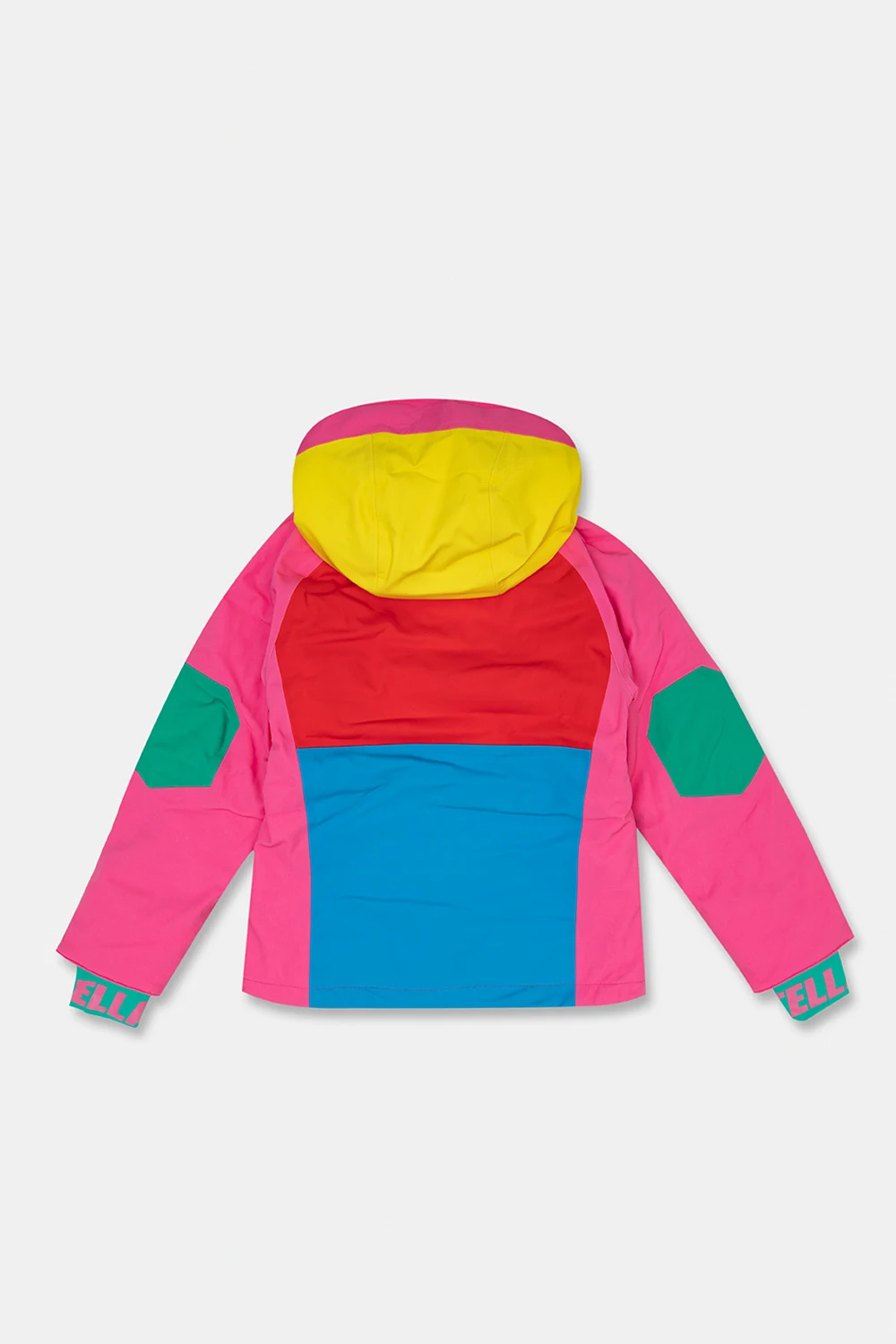 Multicoloured puffer jacket from Stella McCartney Kids. Crafted in part from recycled material with THERMOLITE ® CORE insulation, this style fastens with a zipper and snaps and features a detachable drawstring hood, three zip pockets, long two-layered sleeves with velcro closures, elasticized trims, logo print and thumbholes. This design offers waterproof and windproof properties.