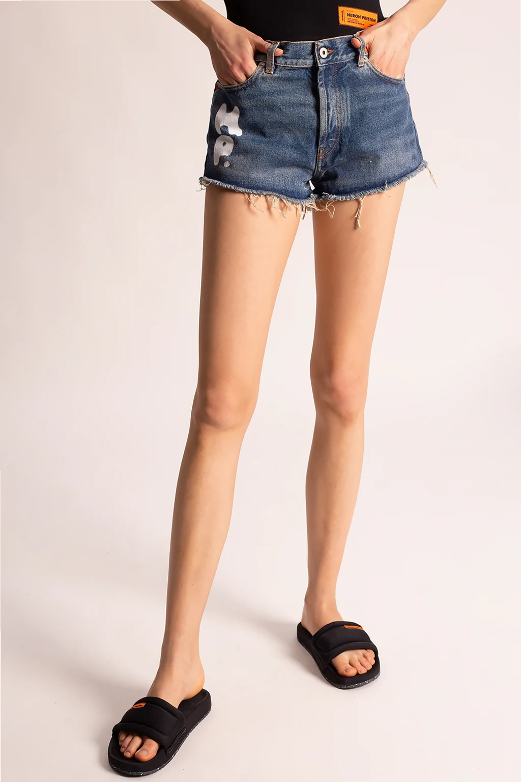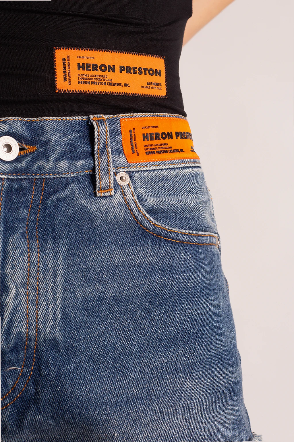 Blue stonewashed denim shorts from Heron Preston. Fastened with buttons, this garment features a logo patch, distinctive orange stitching details, white logo print, classic five pockets and raw cut edges.