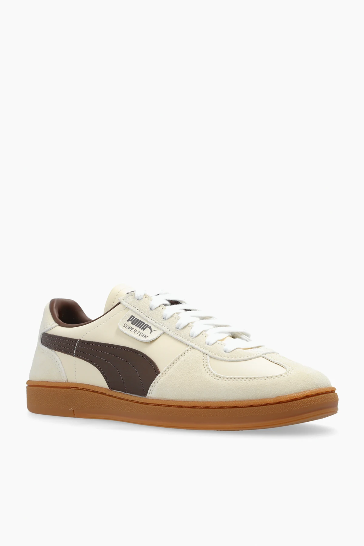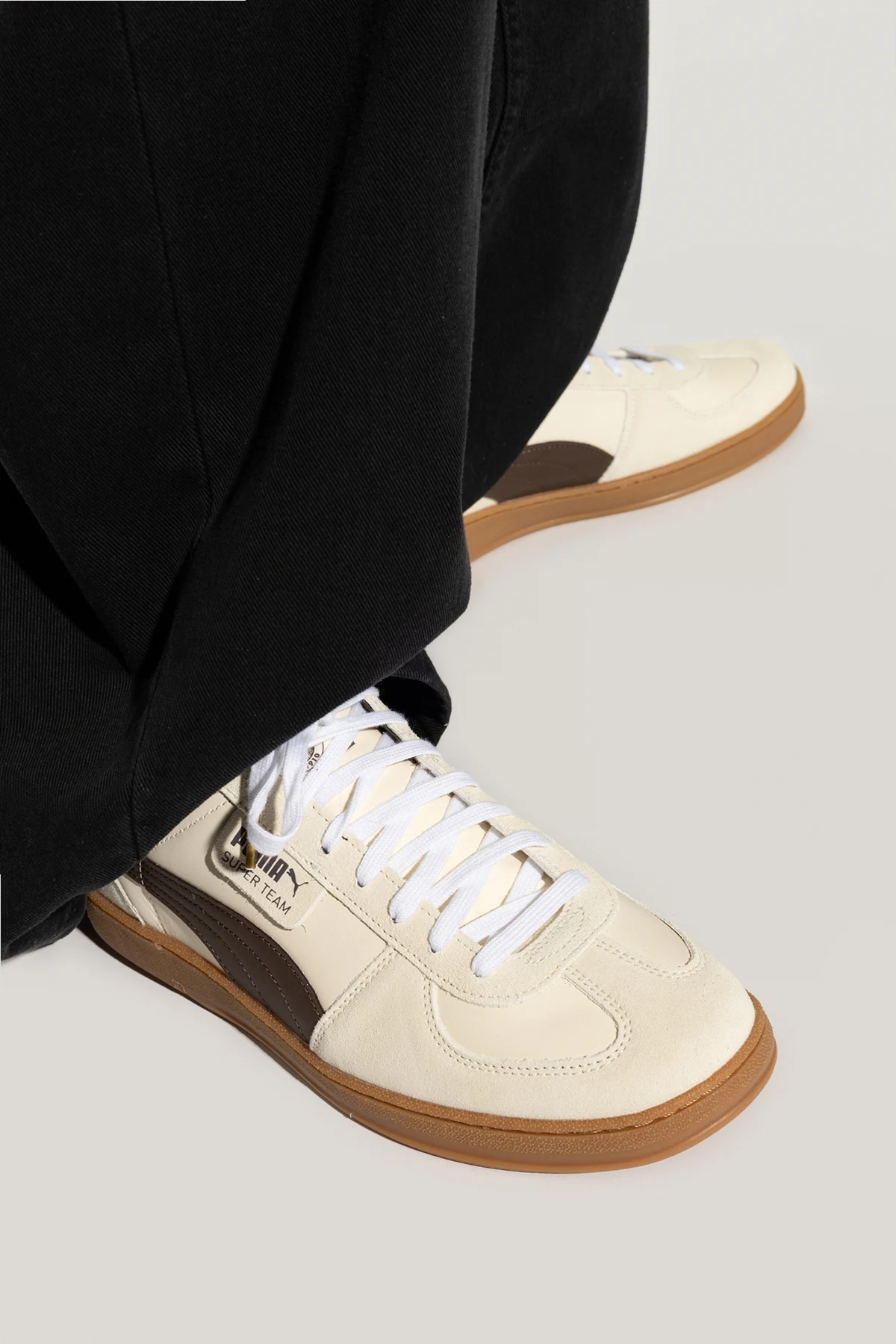 Auf der Zunge der Schuhe befindet sich das charakteristische Puma-Logo sowie der Schriftzug "Super Team", was ihre besondere Position in der Kollektion unterstreicht. Diese Schuhe passen hervorragend zu lässigen, schwarzen Hosen, einer cremefarbenen Jacke und einem weißen Pullover, was ihren lässigen, aber eleganten Charakter betont.