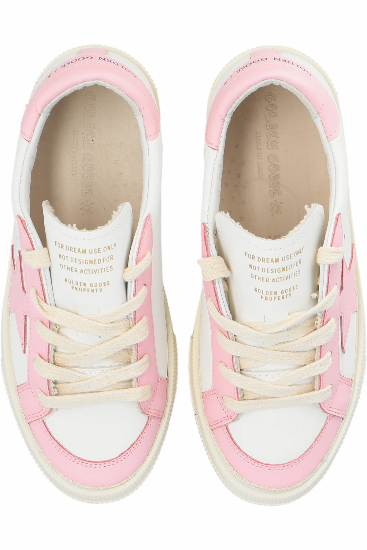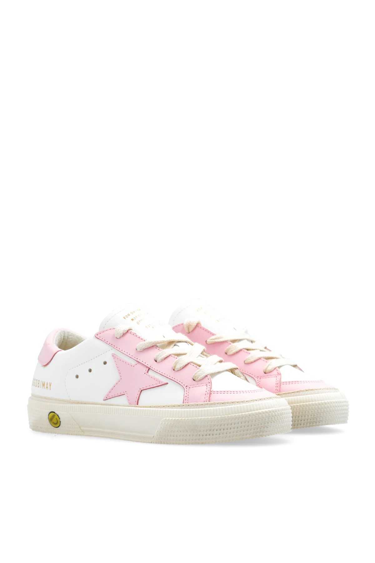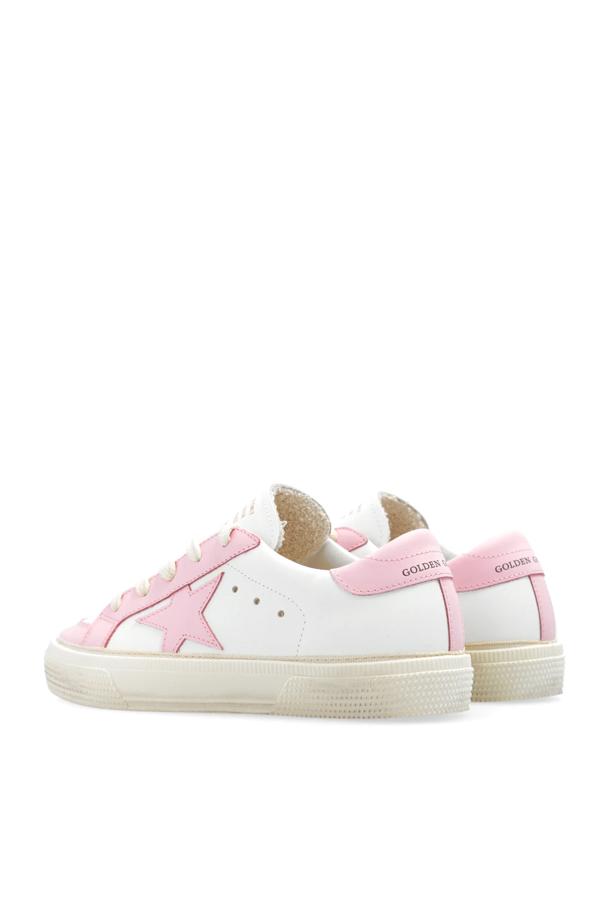 White and pink ‘May With Double Toe’ sneakers from Golden Goose Kids. Made of smooth leather, this lace-up model sits on a cream rubber sole and showcases a printed logo and a signature star patch.