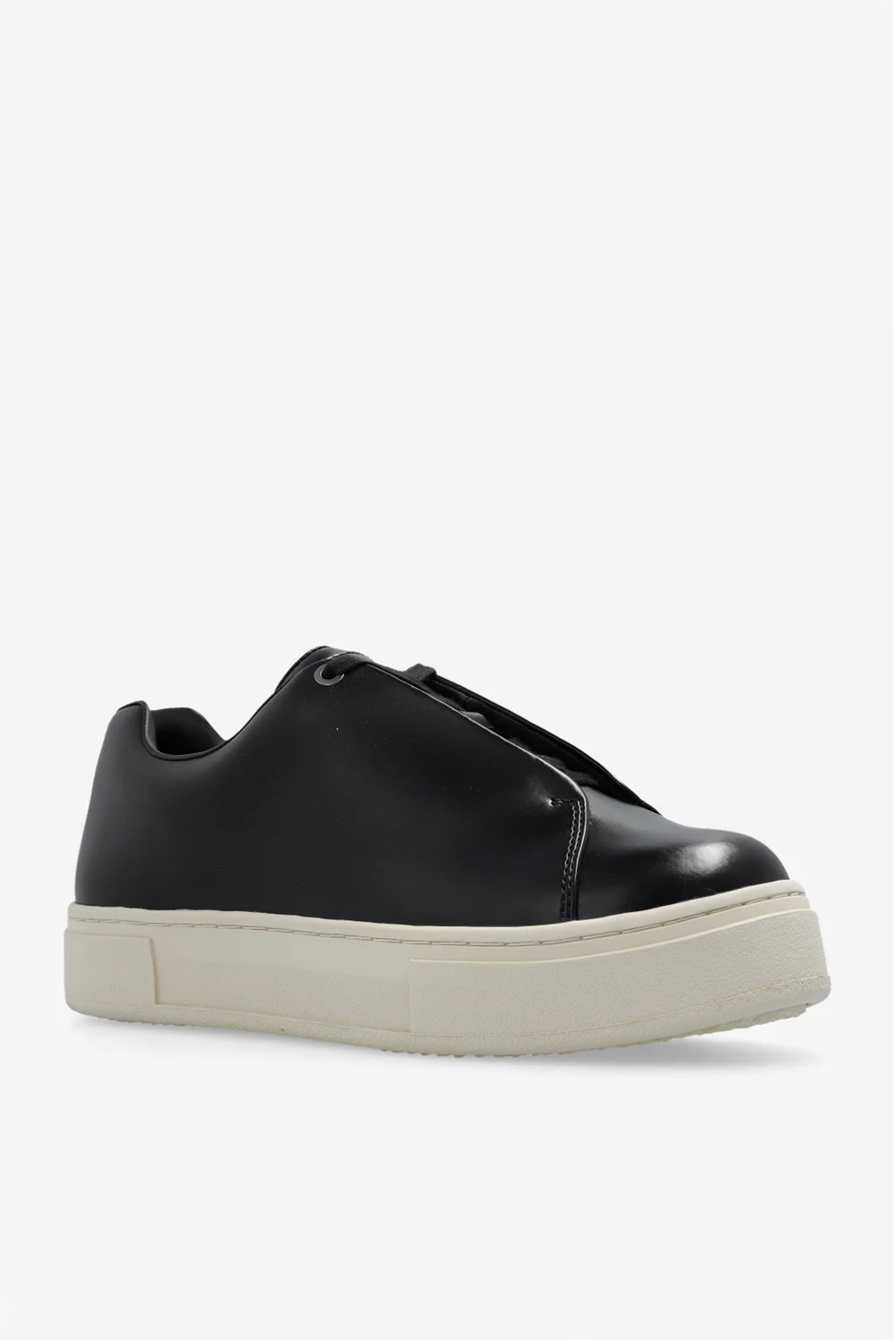 Black ‘Doja’ sneakers from Eytys. Crafted in glossy leather, this lace-up model sits on a cream rubber sole and features a purple logo patch for brand recognition.