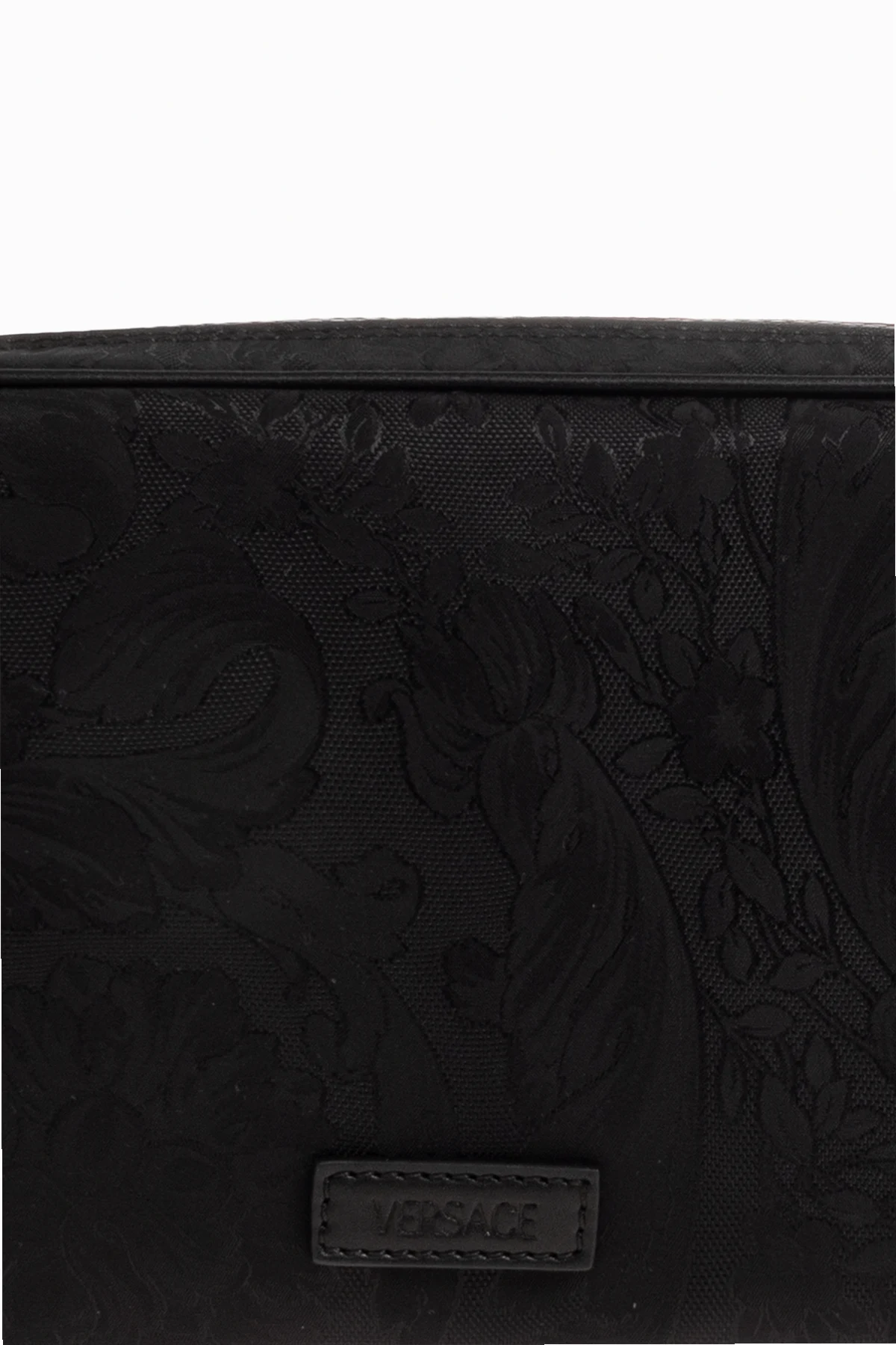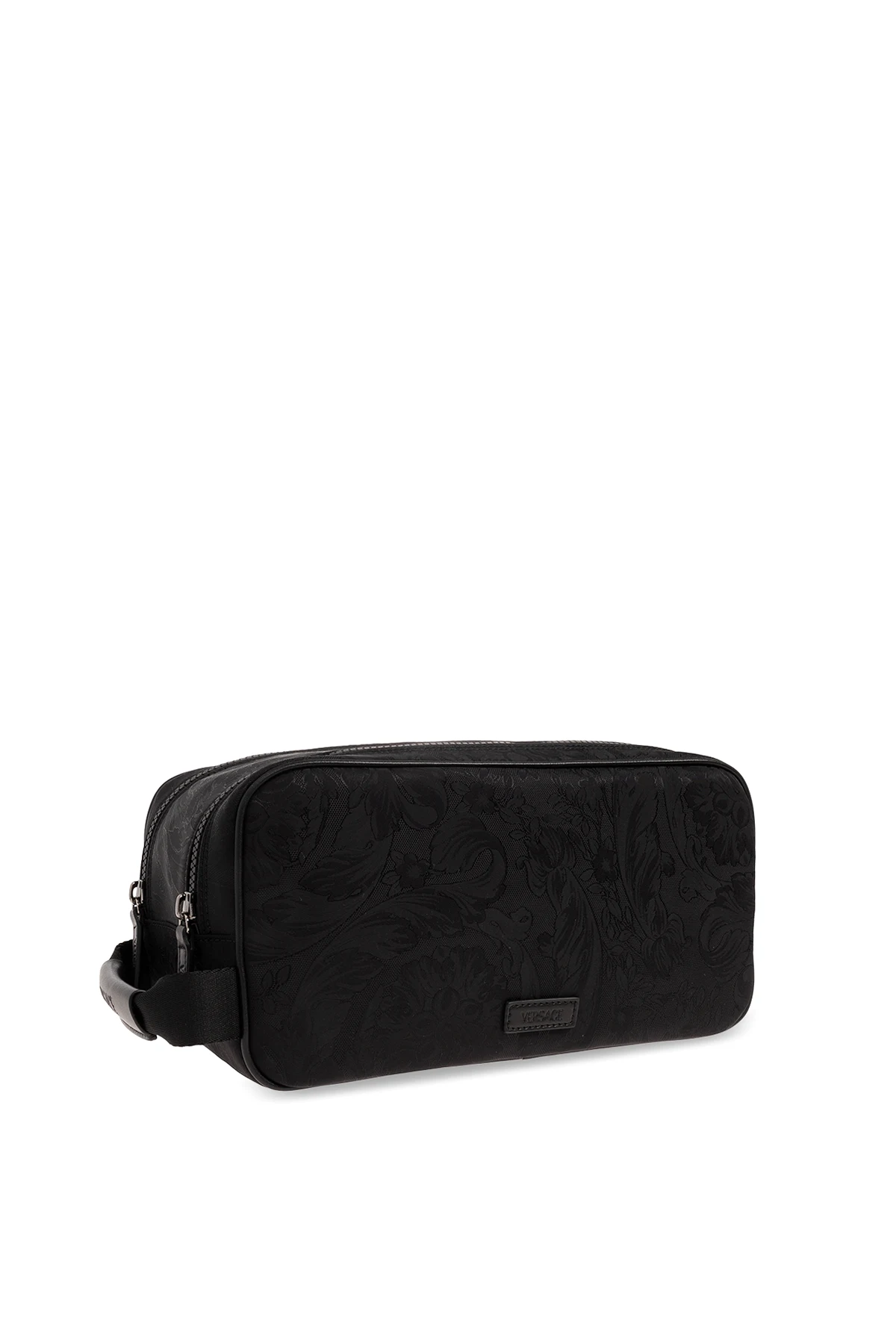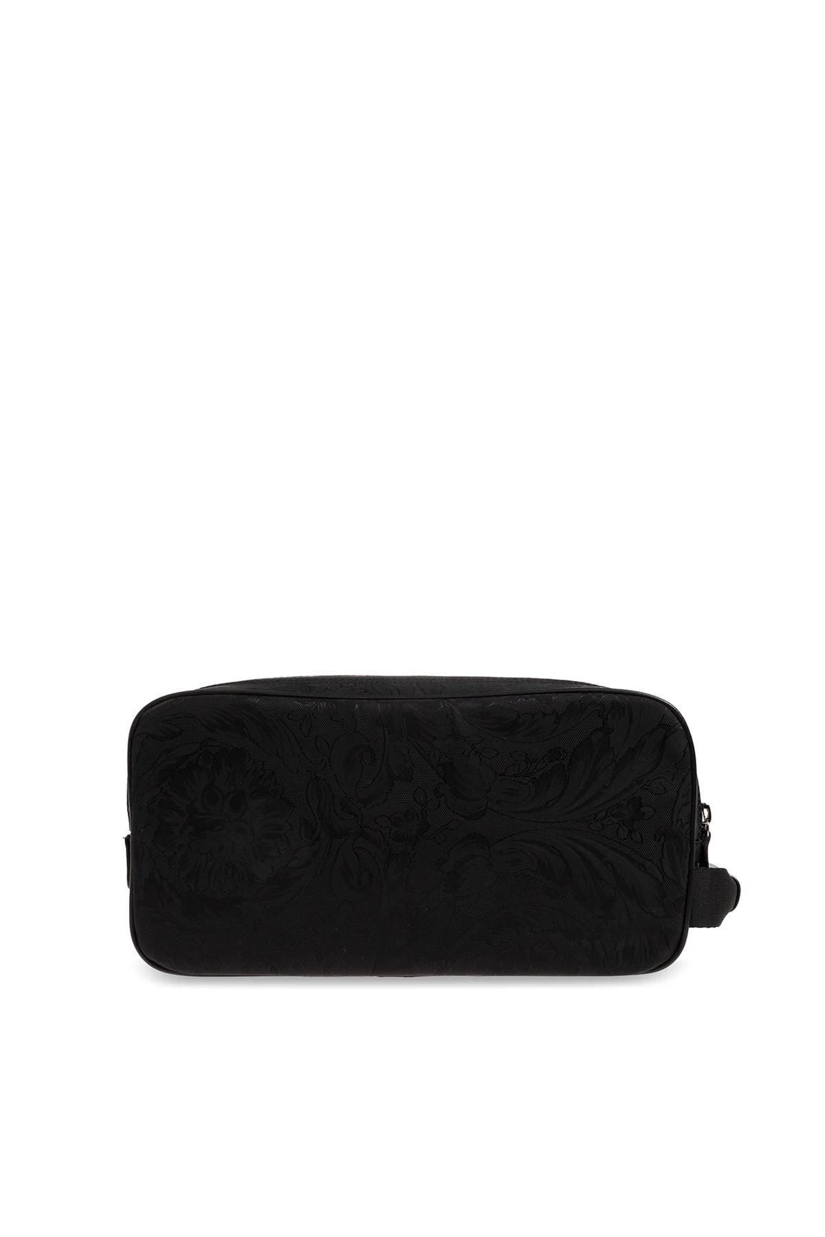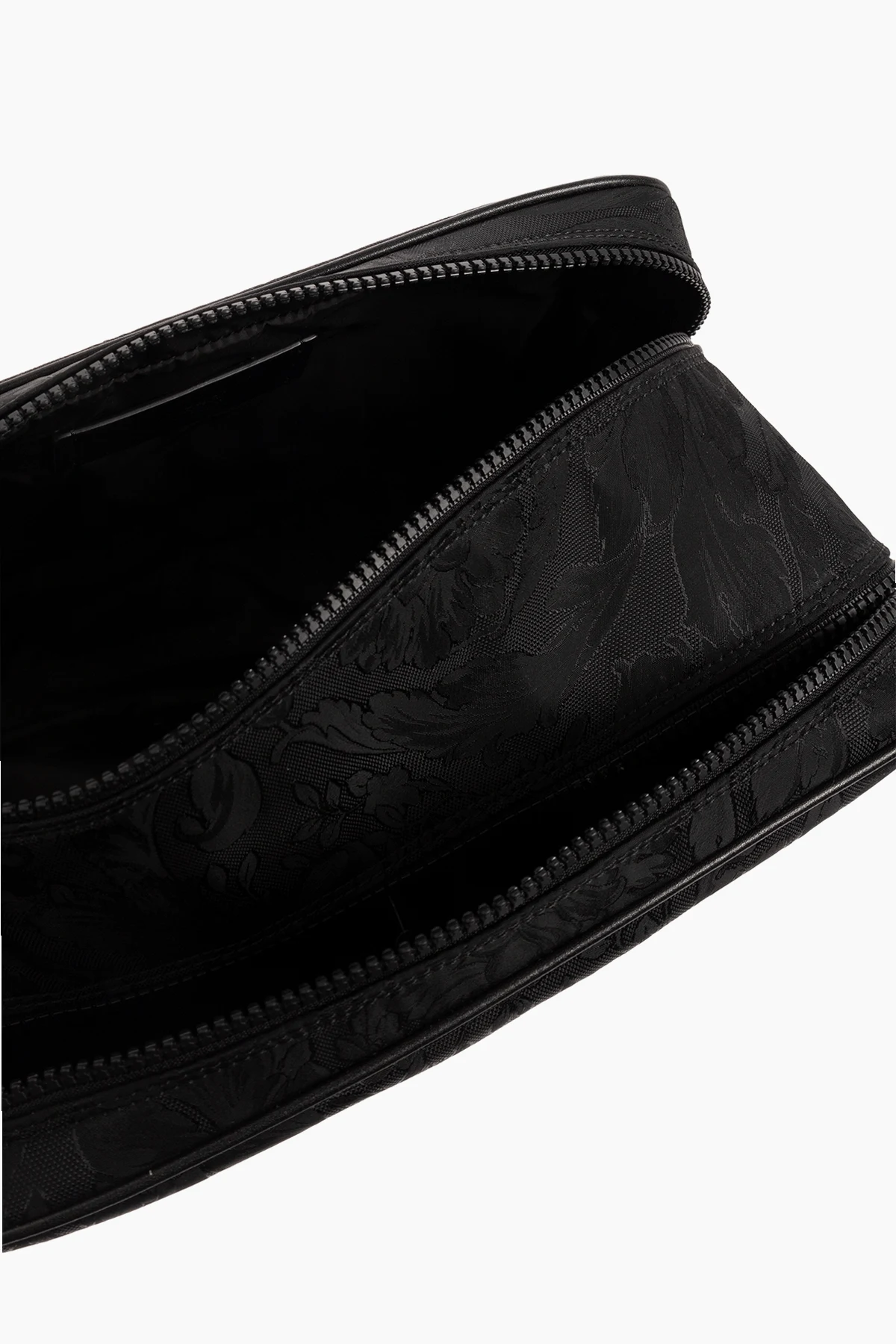 Black wash bag from Versace. Made of fabric and trimmed with leather, this design is embellished with a signature Barocco pattern and features a logo patch on the front, one handle on the side as well as two separate zip compartments and two slip pockets inside.