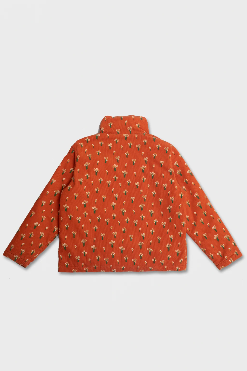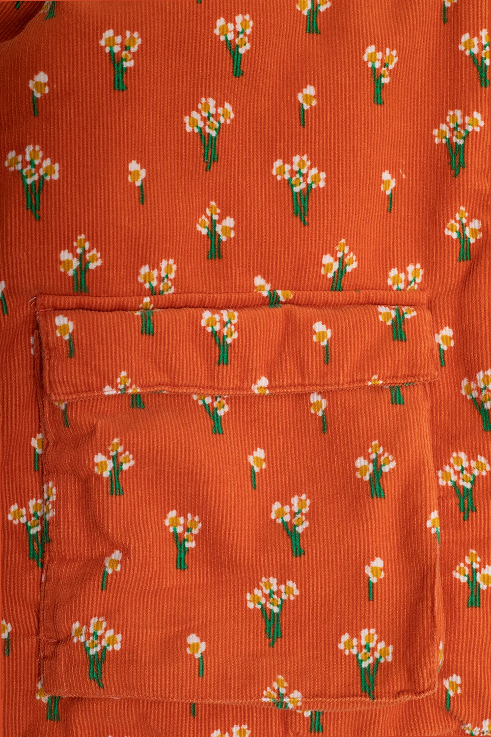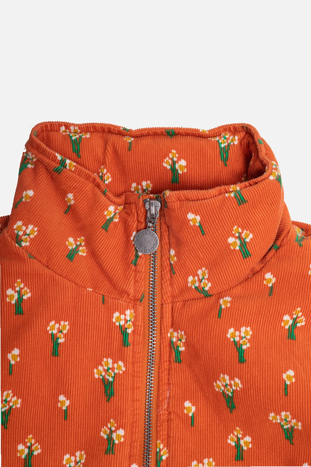 Orange insulated jacket with a stand collar from Stella McCartney Kids. Cut from corduroy, this garment features a zip with a round logo-embossed charm, white, green and yellow floral pattern and two flap pockets.